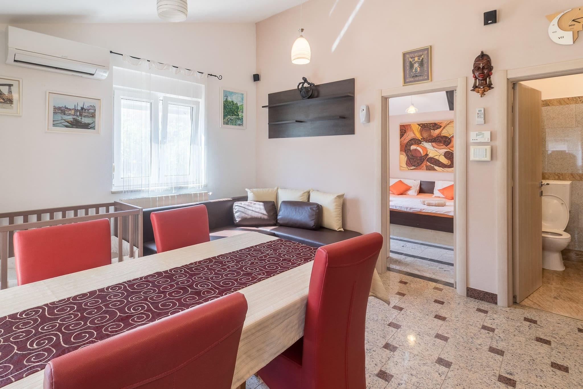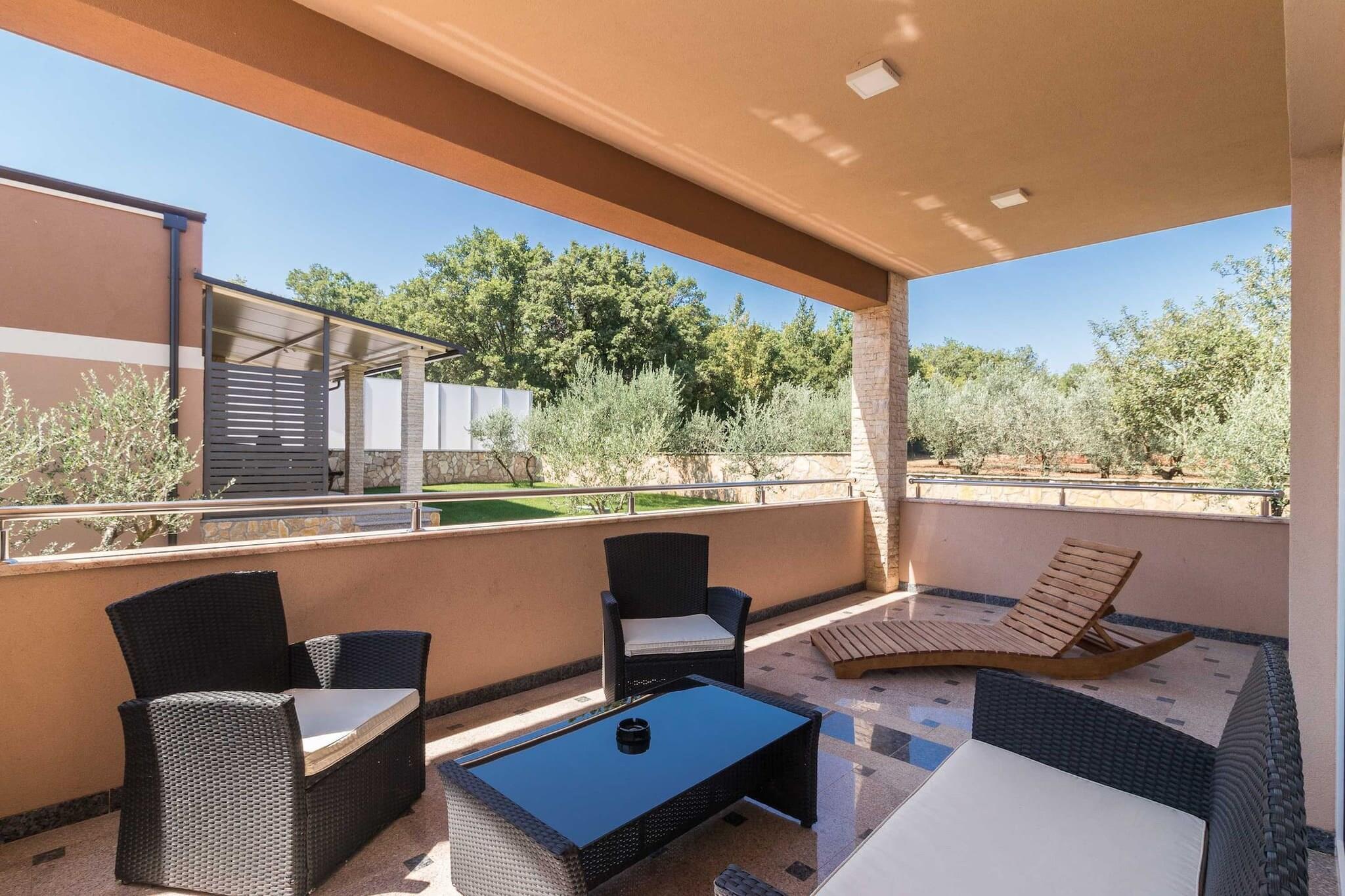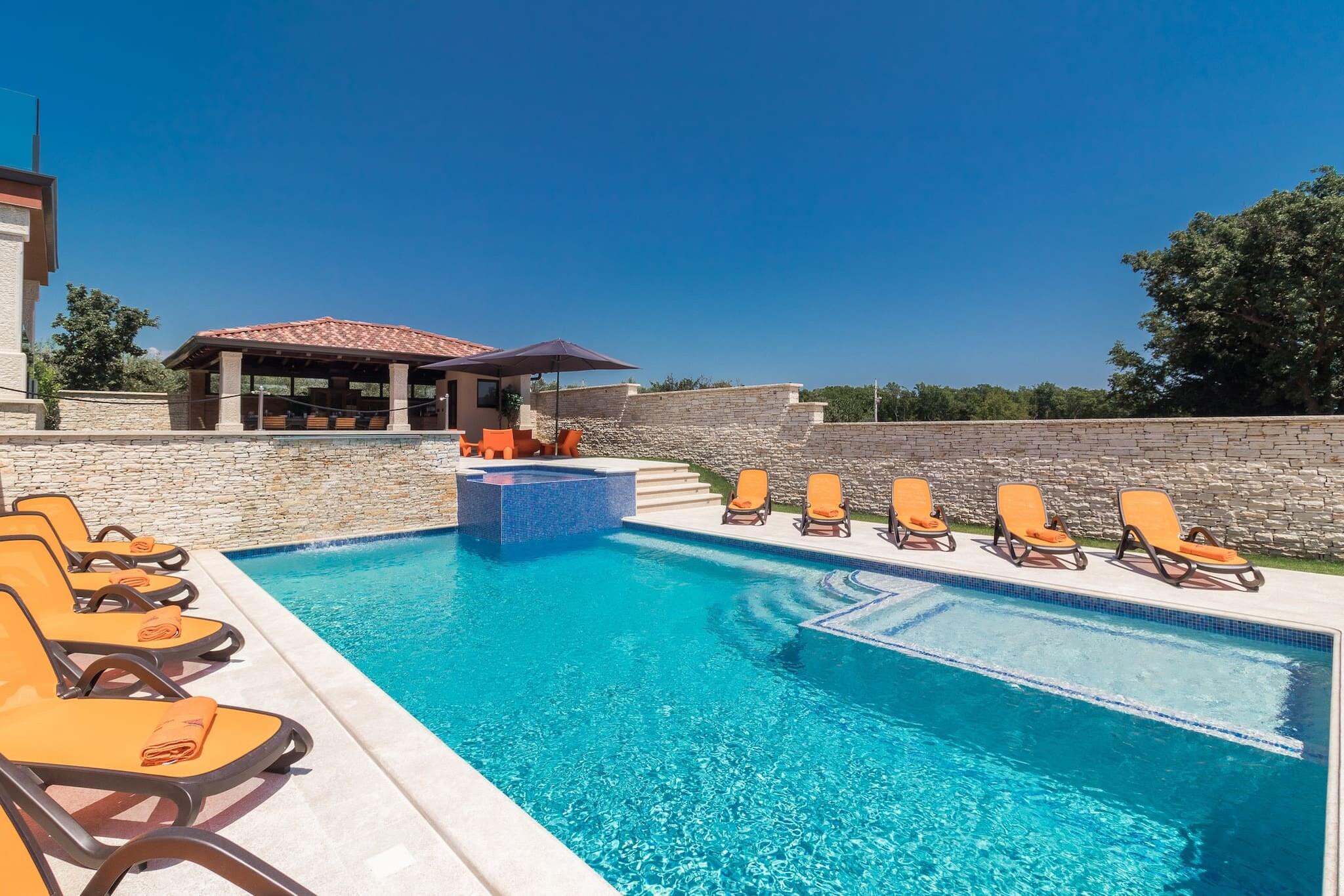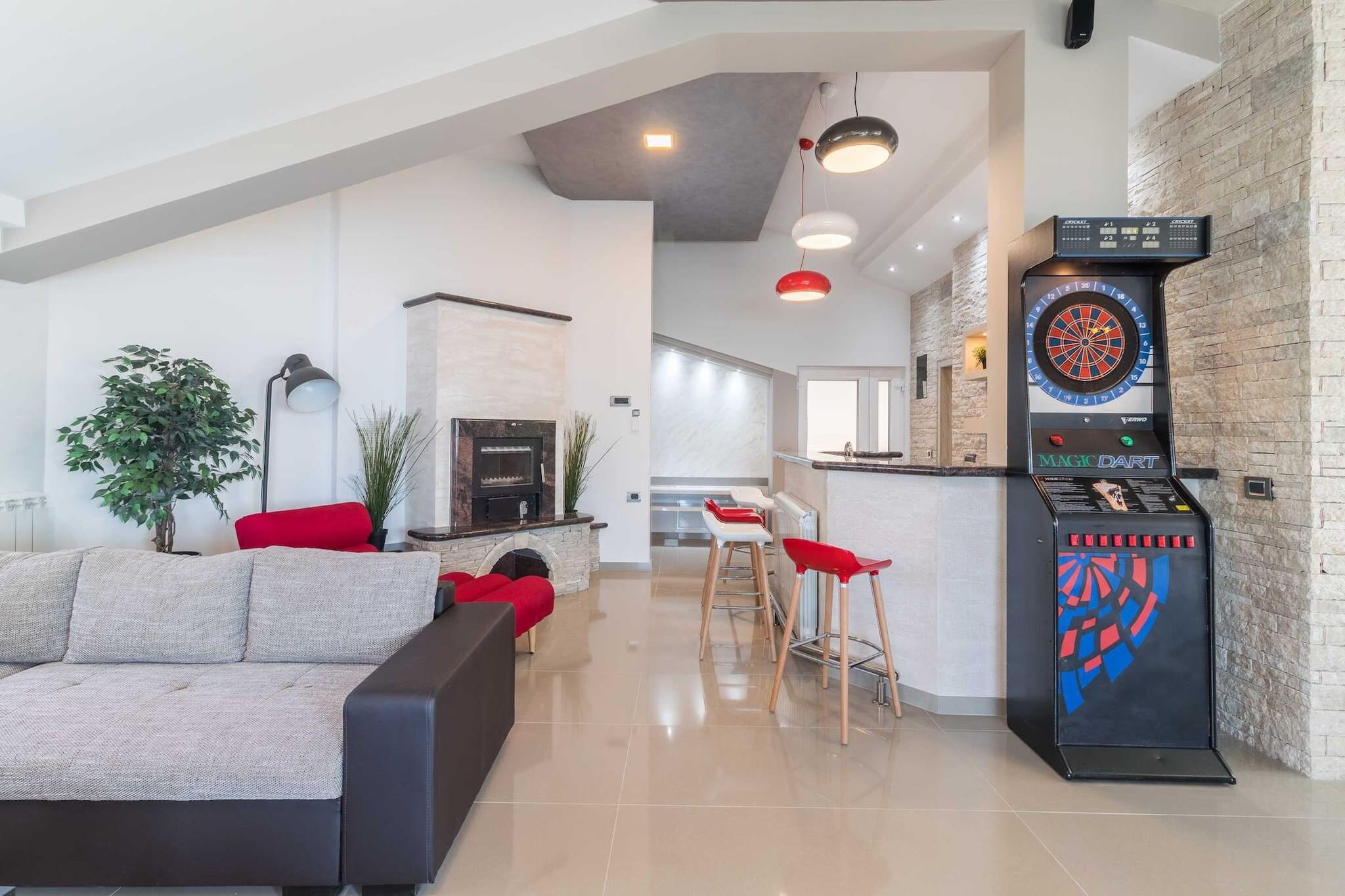 Denne villa tilbyder en luksuriøs ferieoplevelse med en række faciliteter designet til at gæsterne kan slappe af og nyde. Denne rummelige villa har 7 soveværelser, der kan rumme op til 14 voksne og 4 børn, og giver mulighed for kun at reservere halvdelen af villaen, som omfatter 4 soveværelser for op til 8 voksne og 2 børn. Gæsterne kan nyde en privat udendørs swimmingpool (57,75 m²) med jacuzzi samt en mindre børnepool. Villaen byder desuden på en stor terrasse med spiseplads, et professionelt udekøkken, tv og et udendørs toilet. Villaen er perfekt til familier og har en legeplads til børn med rutsjebane og gynger samt masser af rekreative muligheder såsom en privat basketball- og volleyballbane, bordtennis og en trampolin. Indenfor byder villaen på et spillerum udstyret med billard, dart og en PS4-konsol, sammen med et jacuzzi- og saunarum til ultimativ afslapning. Villaen har alle værelser med aircondition og opholdsstue for alle gæster. Villaen er beliggende i Valtura, et roligt område nær Pula, en gammel romersk by kendt for sit fantastiske amfiteater og rige historie. Pula er hjemsted for adskillige romerske monumenter og byder på smukke strande samt muligheder for vandsport såsom fiskeri, sejlads og dykning. Windsurfing er også tilgængelig i det nærliggende Premantura, kun 12 km væk, nær Cape Kamenjak. For en kulturel oplevelse kan gæsterne se Spectacvla Antiqva-showet i det romerske amfiteater.