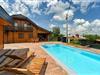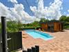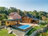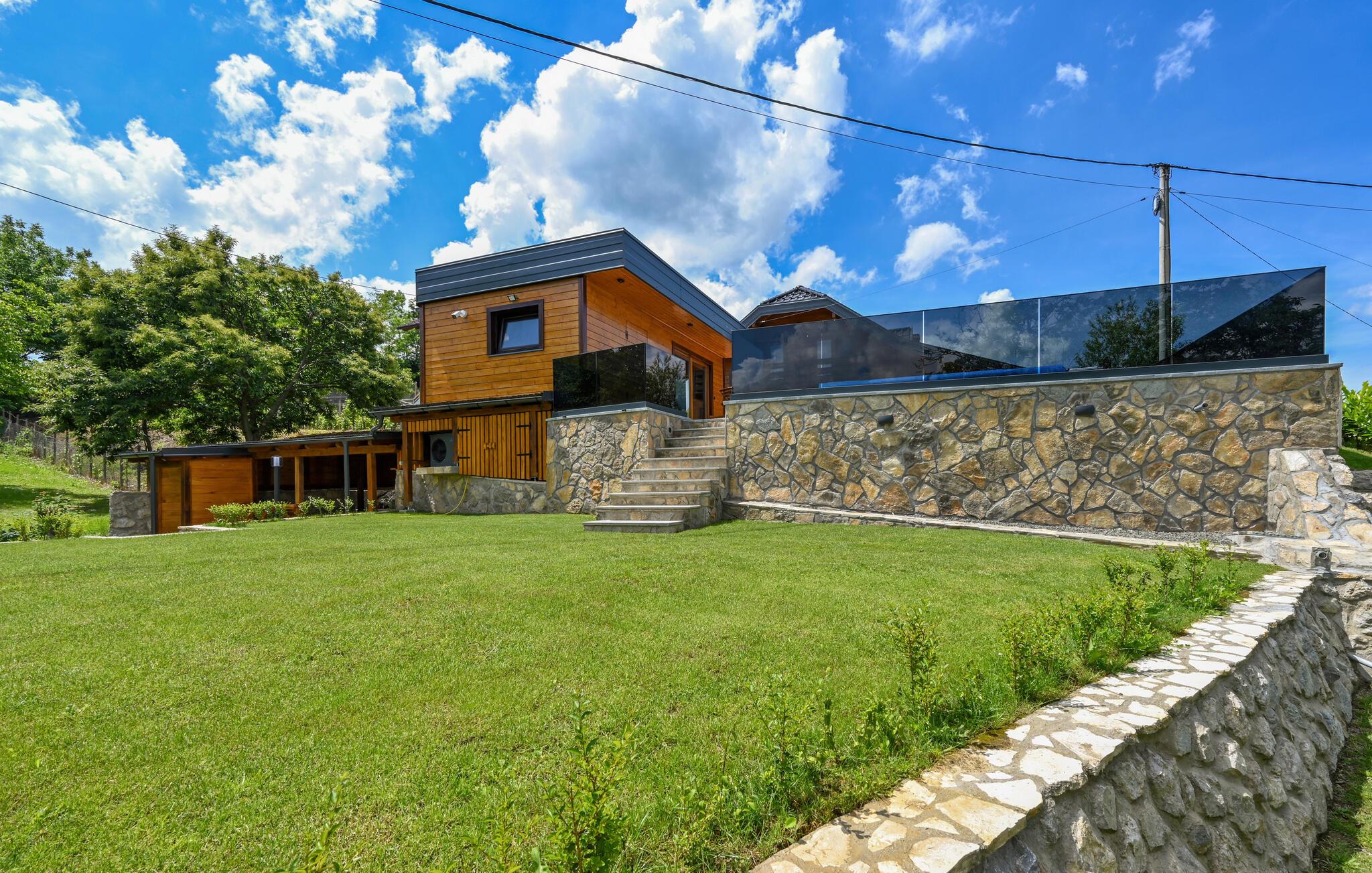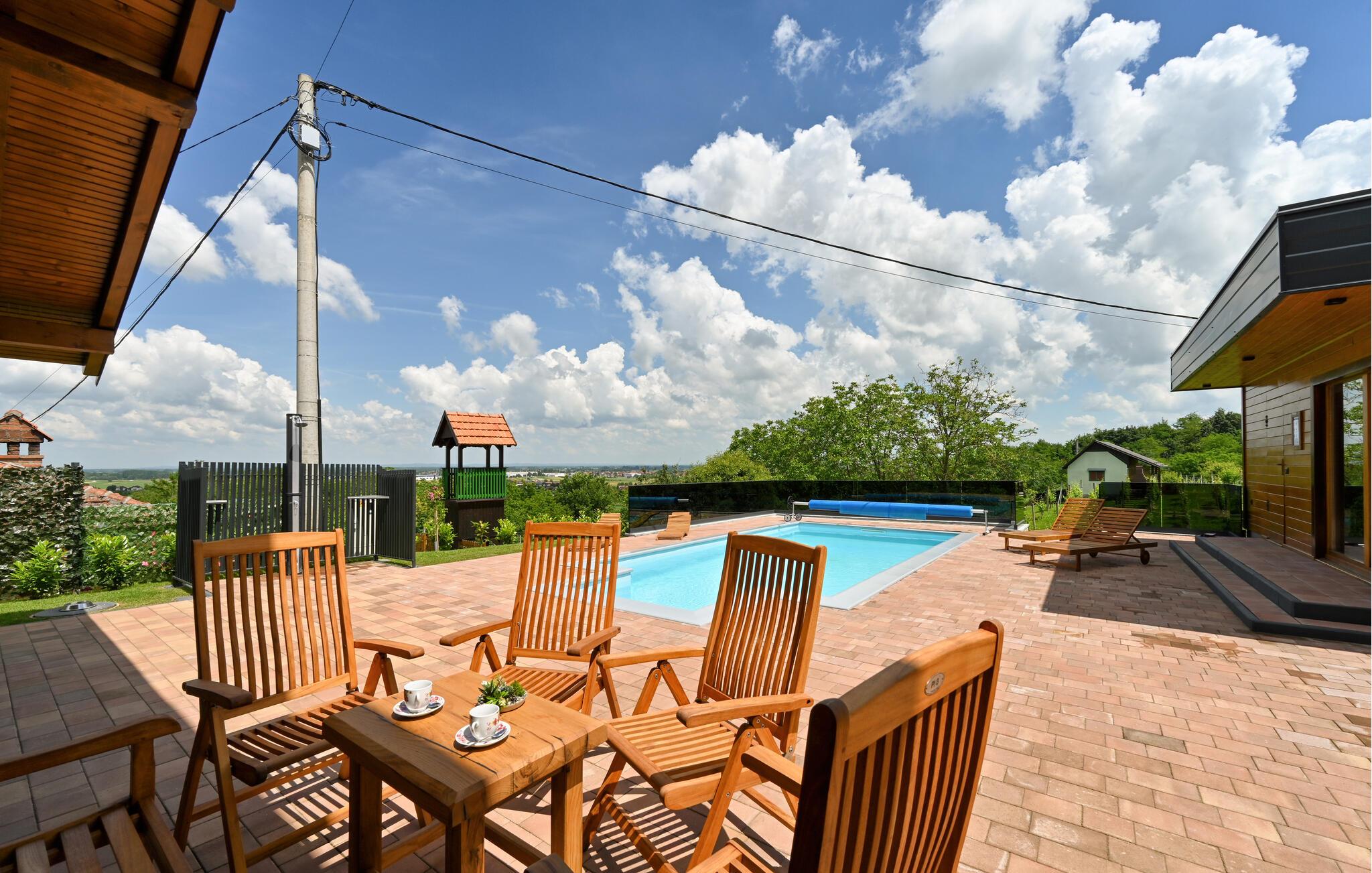 Skønt, rummeligt træhus med spabad og swimmingpool.