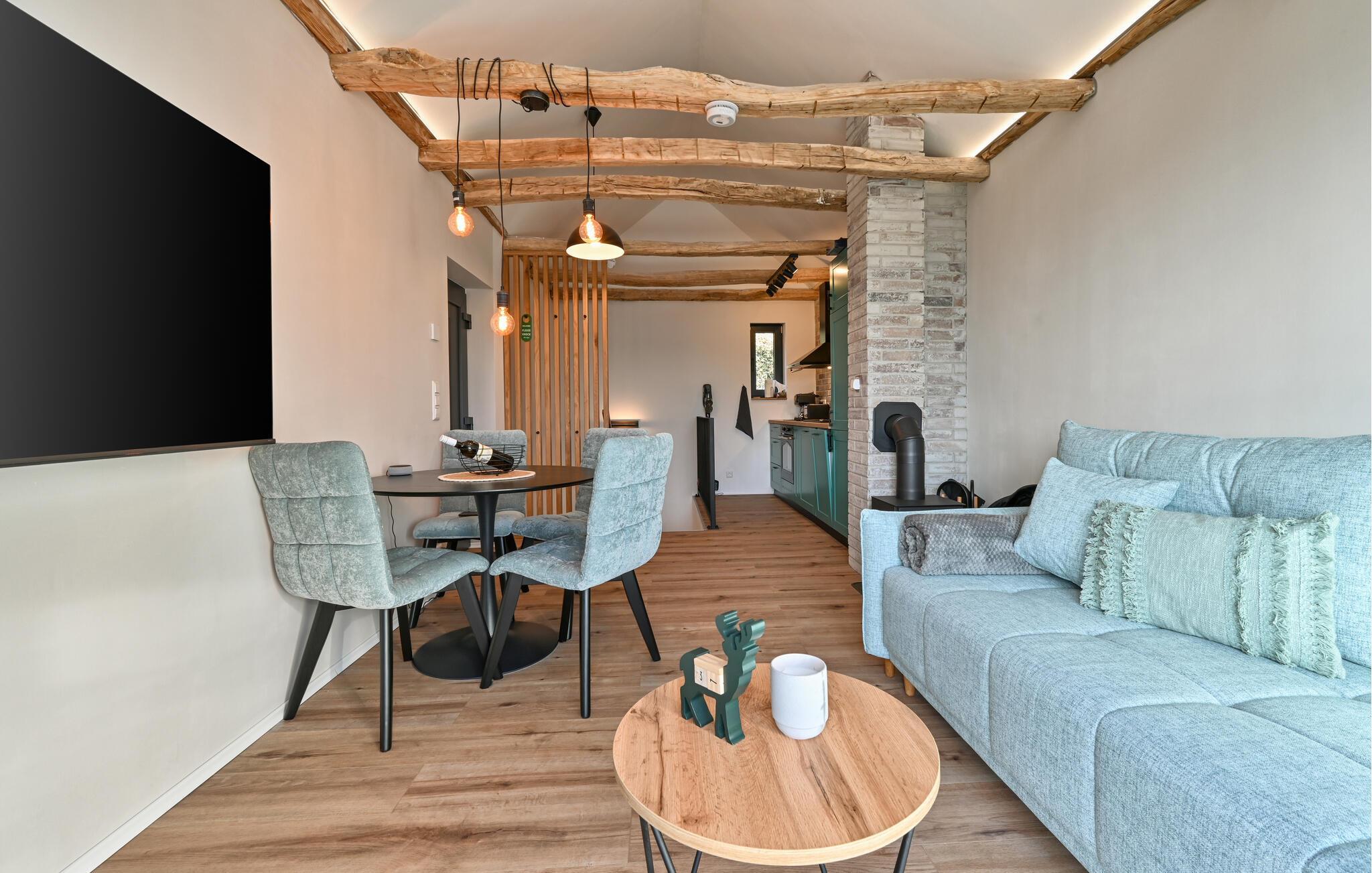 Oplev hyggen med varme trægulve, smagfulde møbler og velplejede murstensvægge i jeres feriehus. Glæd jer til fælles madlavningsaftener i det farverige køkken, og hyg jer på den komfortable sofa med spil eller en spændende serie. De rustikke loftsbjælker og stilfulde belysning skaber en særlig hyggelig atmosfære.
