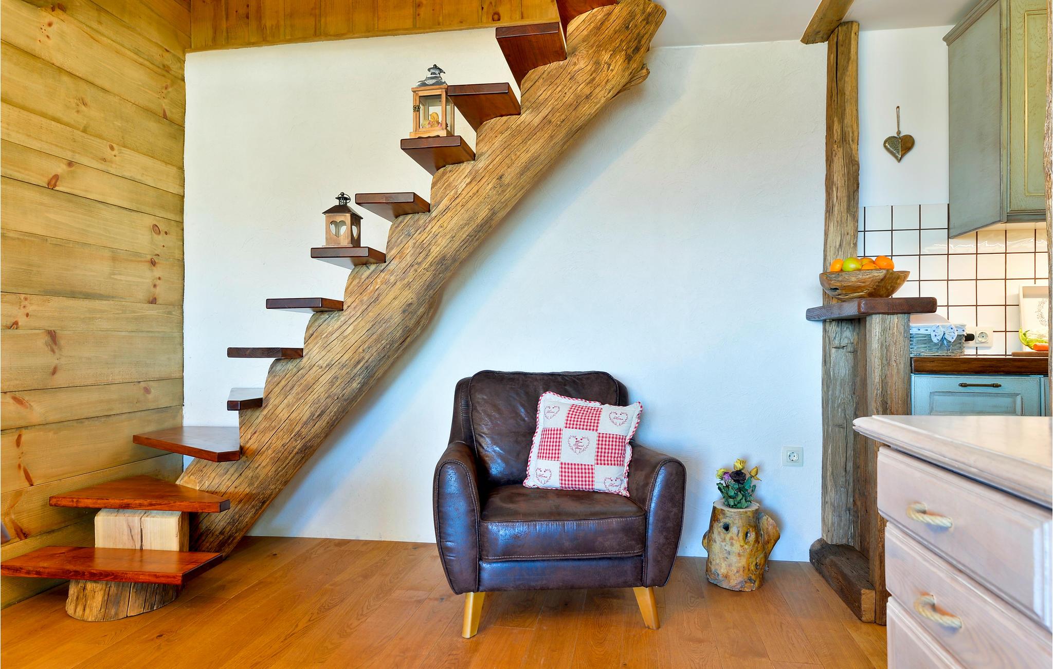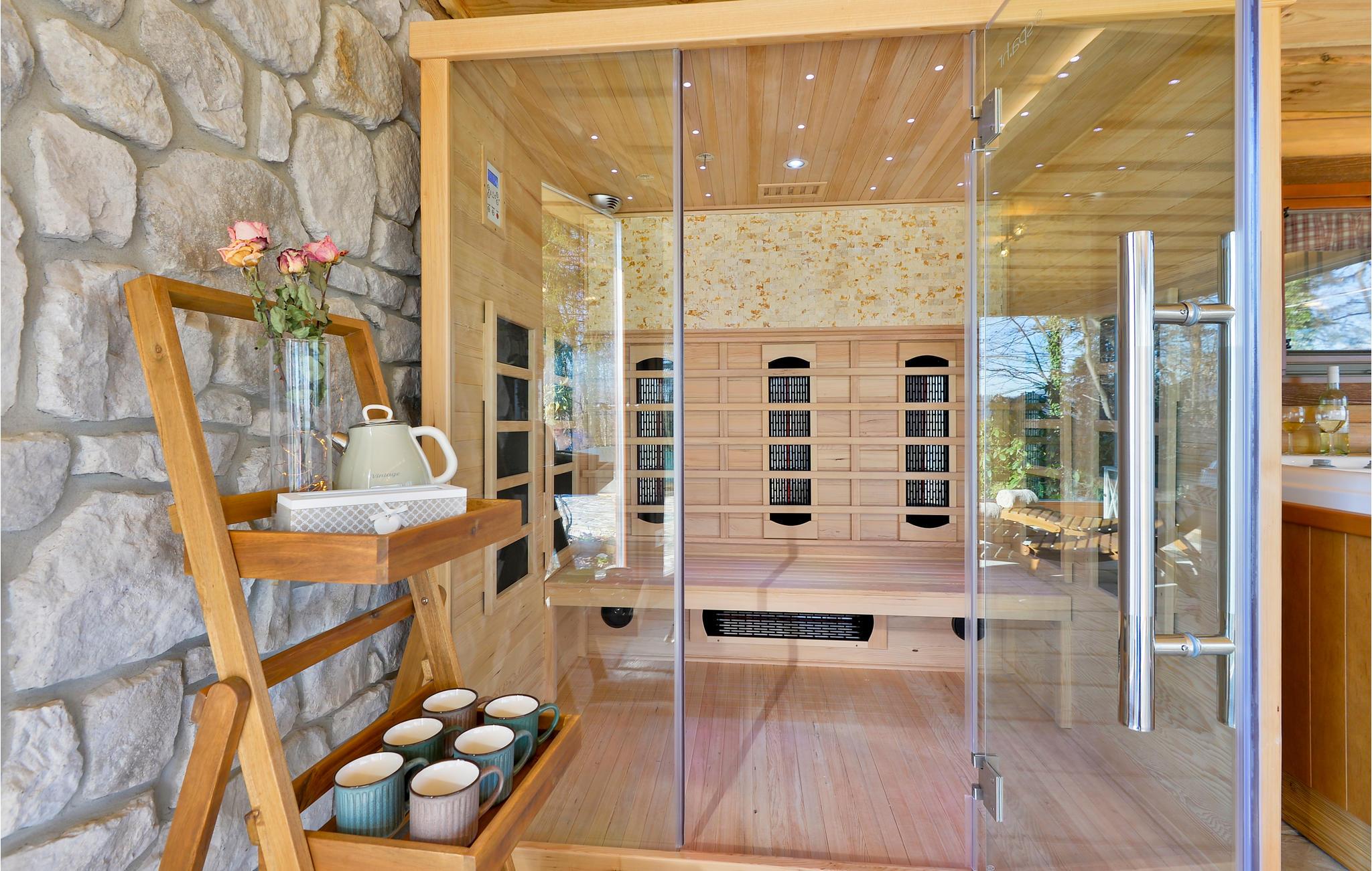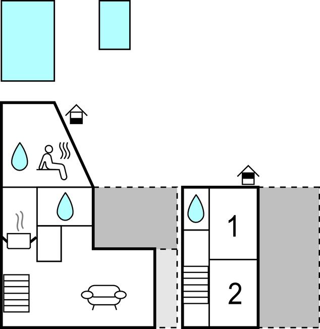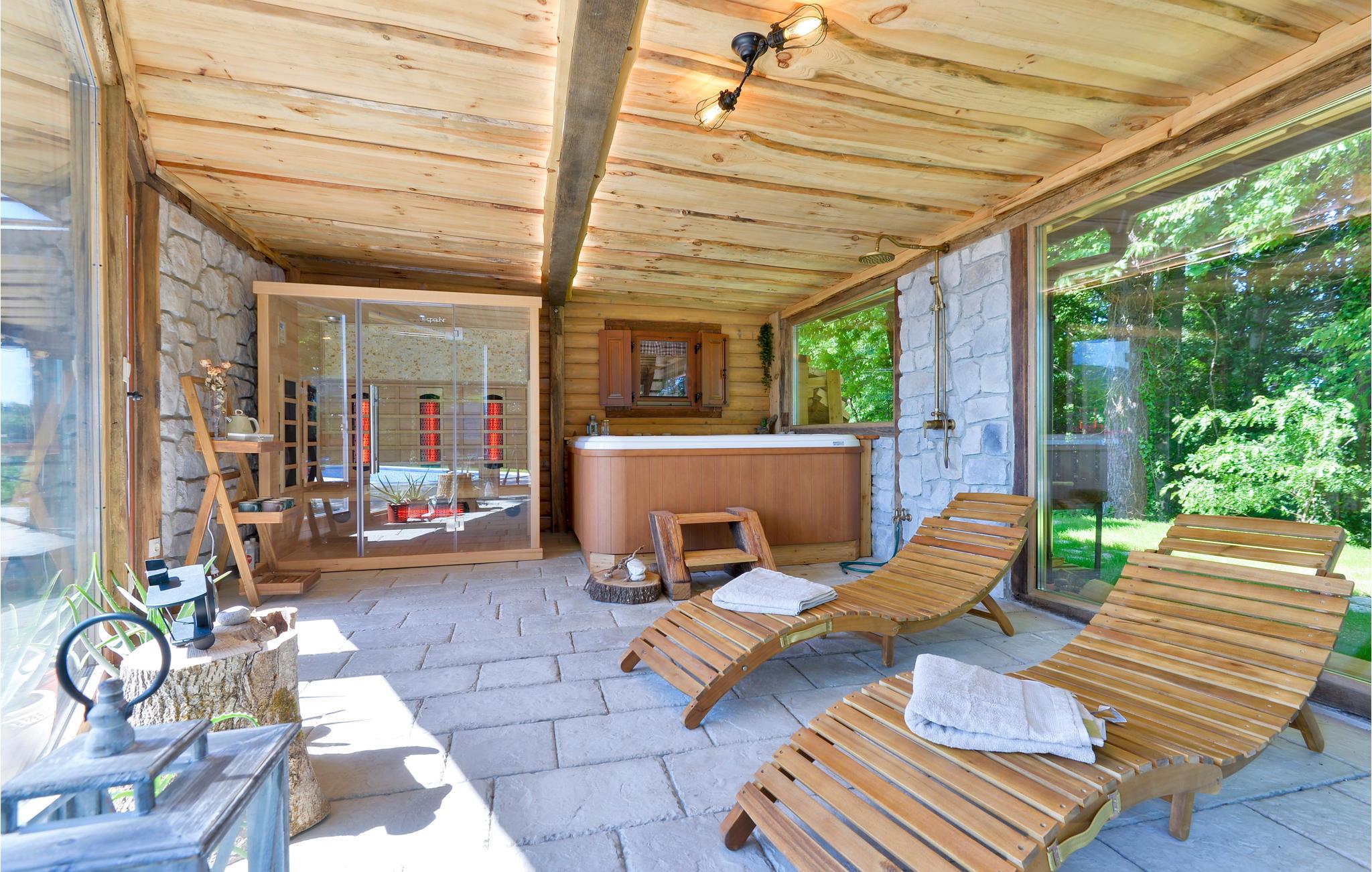 Wellnessområdet med spabad og sauna ligger i stueplan, hvilket også gør dette hus interessant om vinteren, mens den udendørs pool sørger for dejlige svømmeture om sommeren. Ligeledes i stueplan ligger opholdsstuen med tilhørende køkken og spiseplads samt et badeværelse. På overetagen ligger 2 soveværelser, 1 gæstetoilet samt en terrasse med udsigt over landskabet. Et af soveværelserne har en laveste loftshøjde på ca. 120 cm.