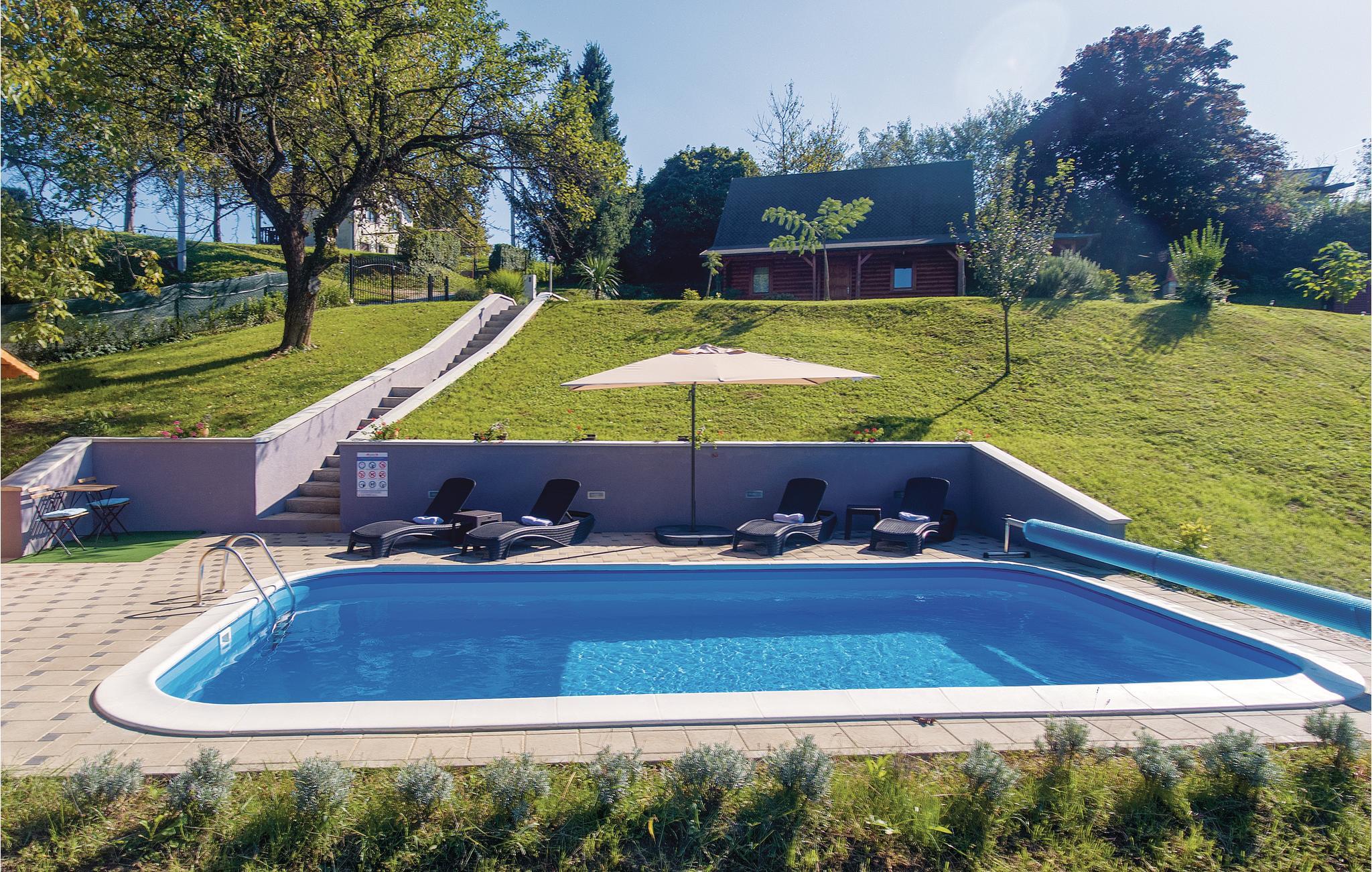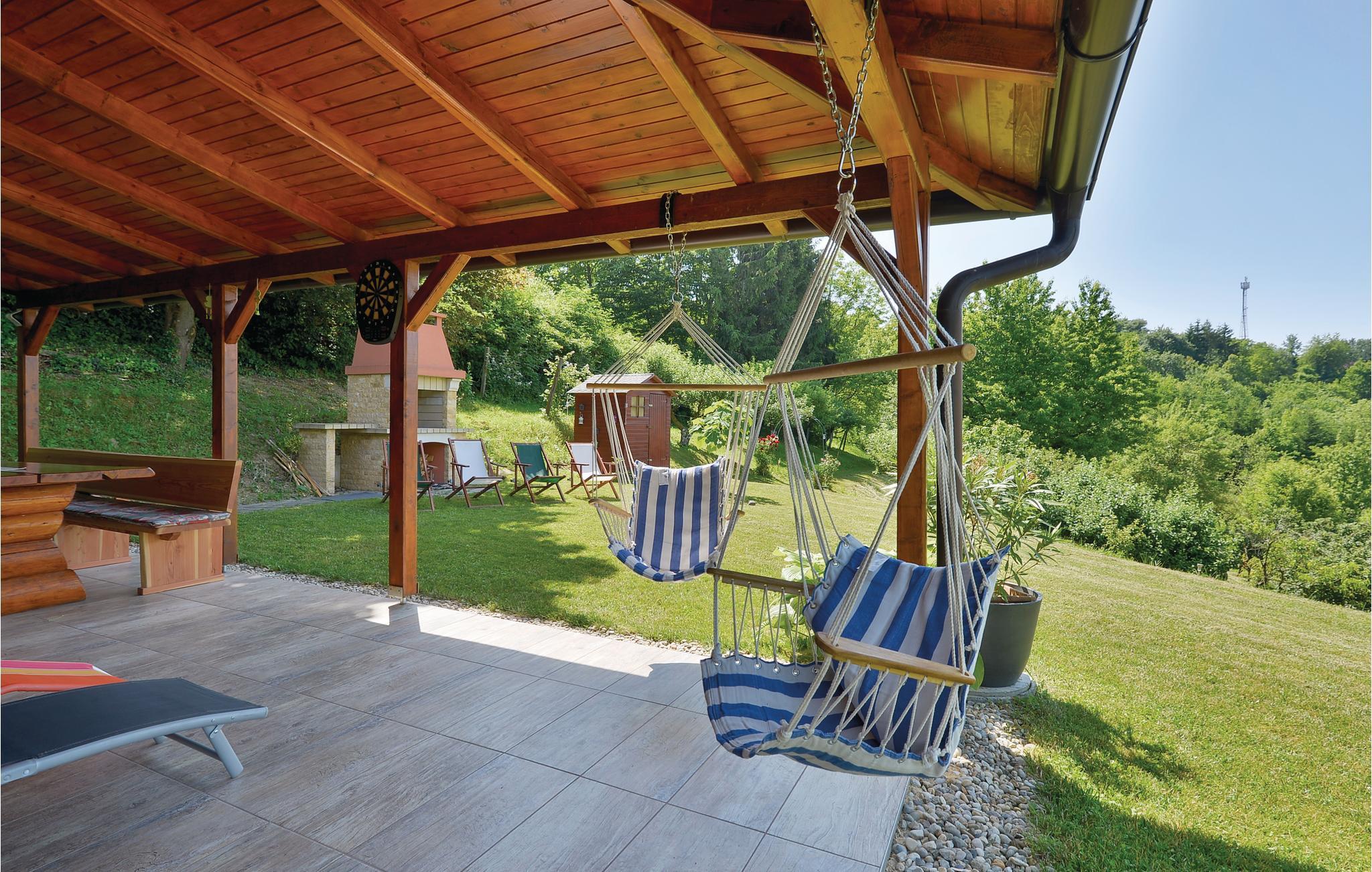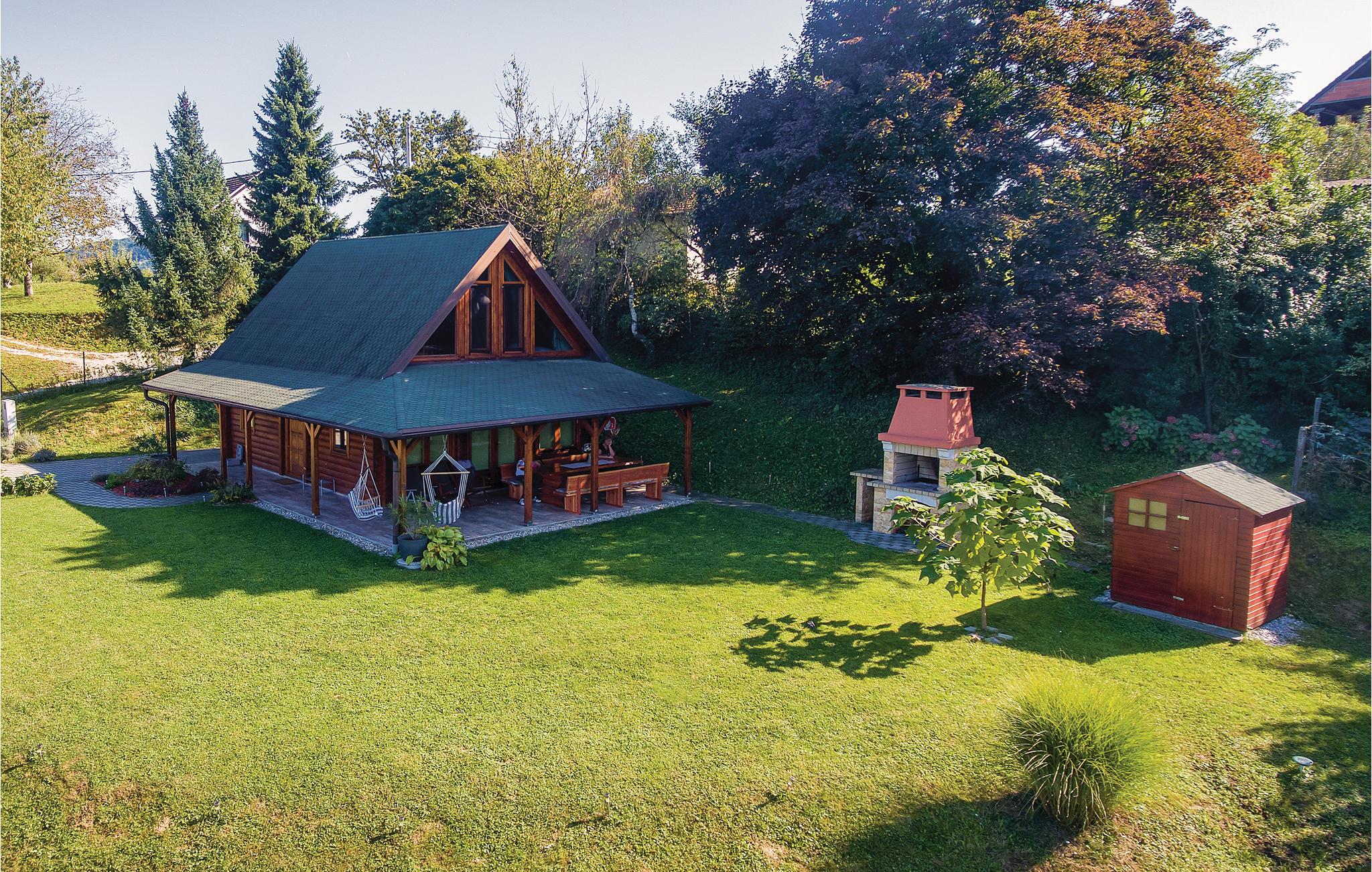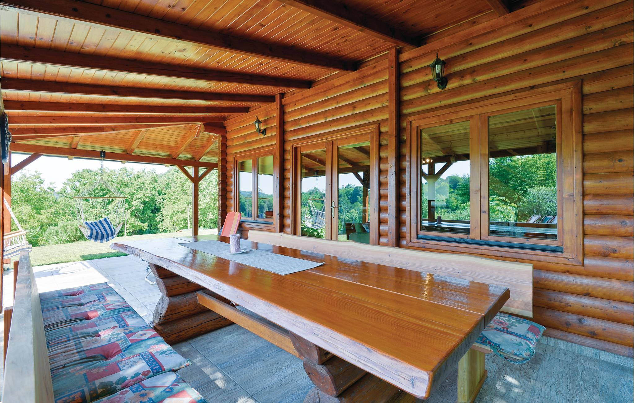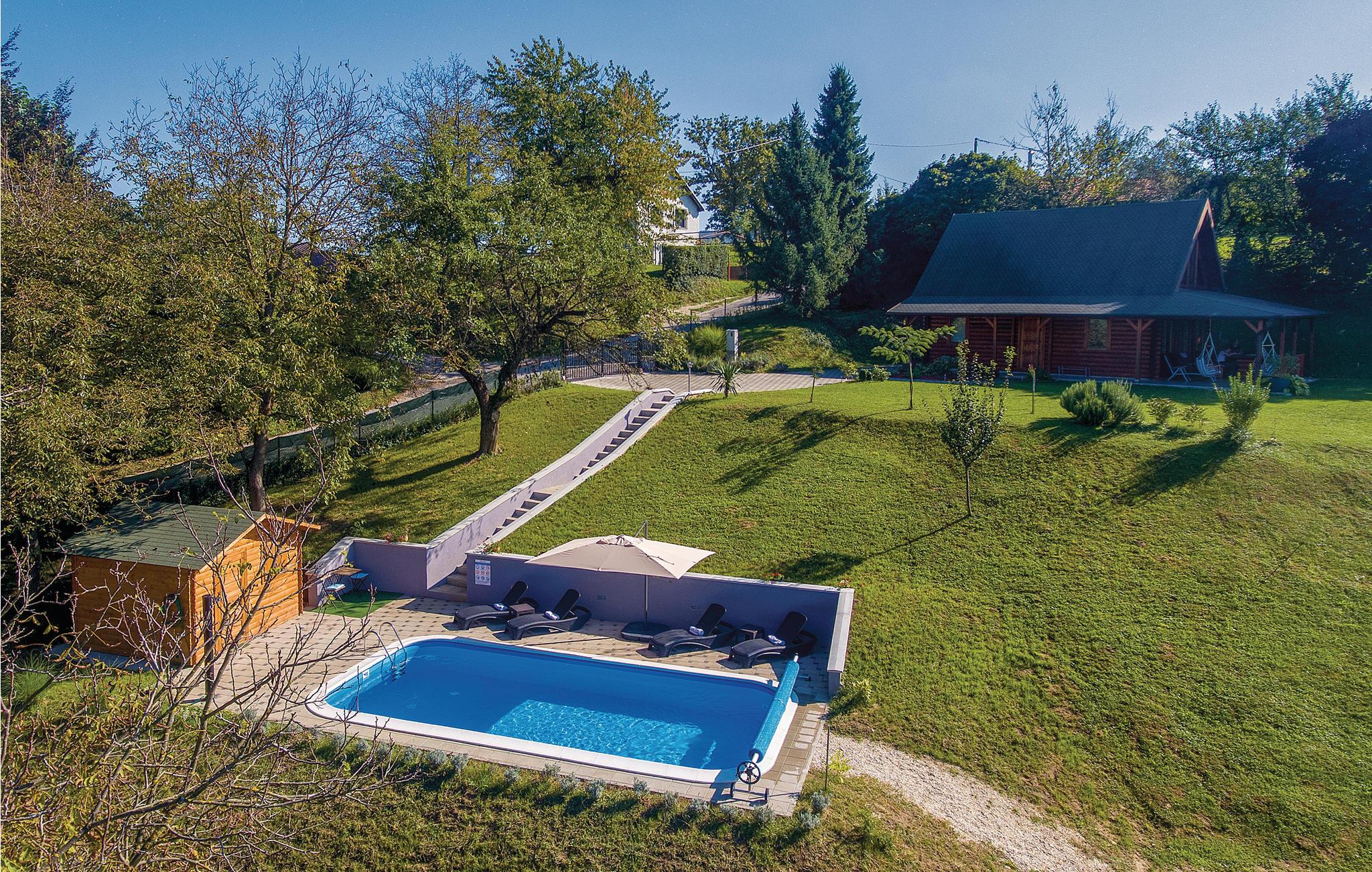 Lidt i afstand af Varazdinske Toplice ligger dette omhyggeligt indrettede hus bygget af træ. På den store grund ligger poolen, med et springvand og et uv-vandrensningsanlæg samt et stort legeomårde til børnene og en terrasse hvor I kan slappe af i den behagelige skygge. Husets indre er smukt og moderne indrettet og huset selv er udstyret med alle former for komfort, til en afslappet ferie. I stueplan er der et opholdsrum med udsigt over terrassen, køkken og spisestue og et badeværelse. På første sal med skrå vægge (60 cm i siden) er der to soveværelser, en hems og et badeværelse. Der er kun en km til Varazdinske toplice, et kurbad med mineralske kilder, wellness, sportsanlæg og mulighed for at gå afslappede ture i naturen. I løbet af ferien er der også oplagt at besøge byen Varazdin, hvis monumentale og kunstneriske fortid afspejles af barokarkitektur og de harmoniske pladser og de romantiske smalle stræder. Glem ikke at besøge englemuseet.