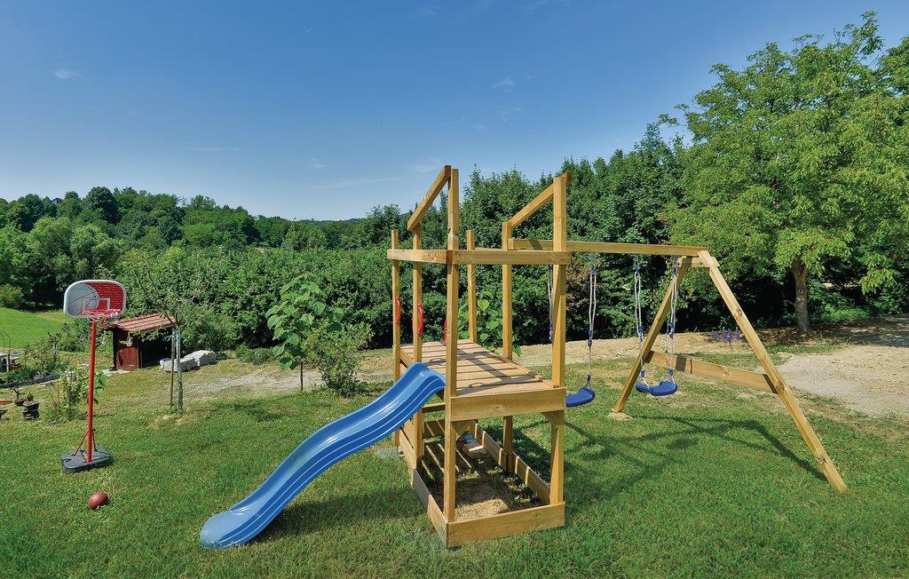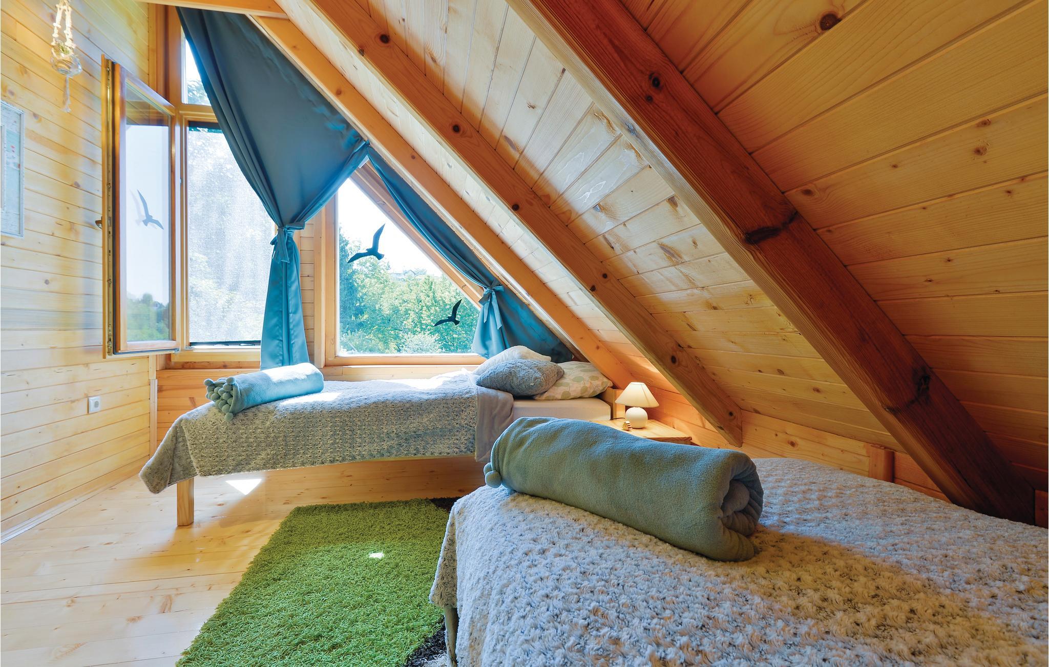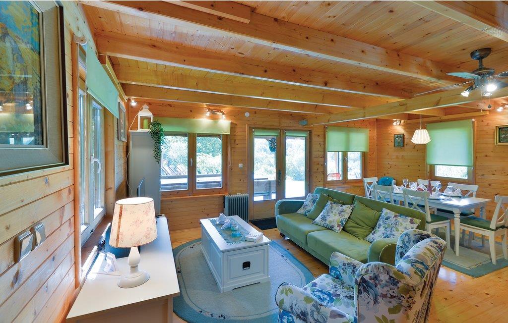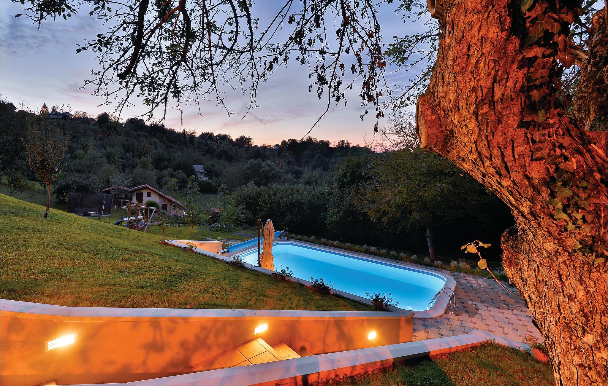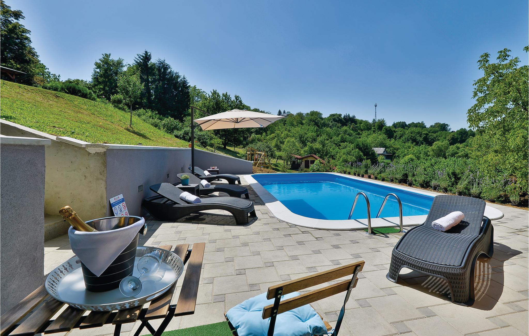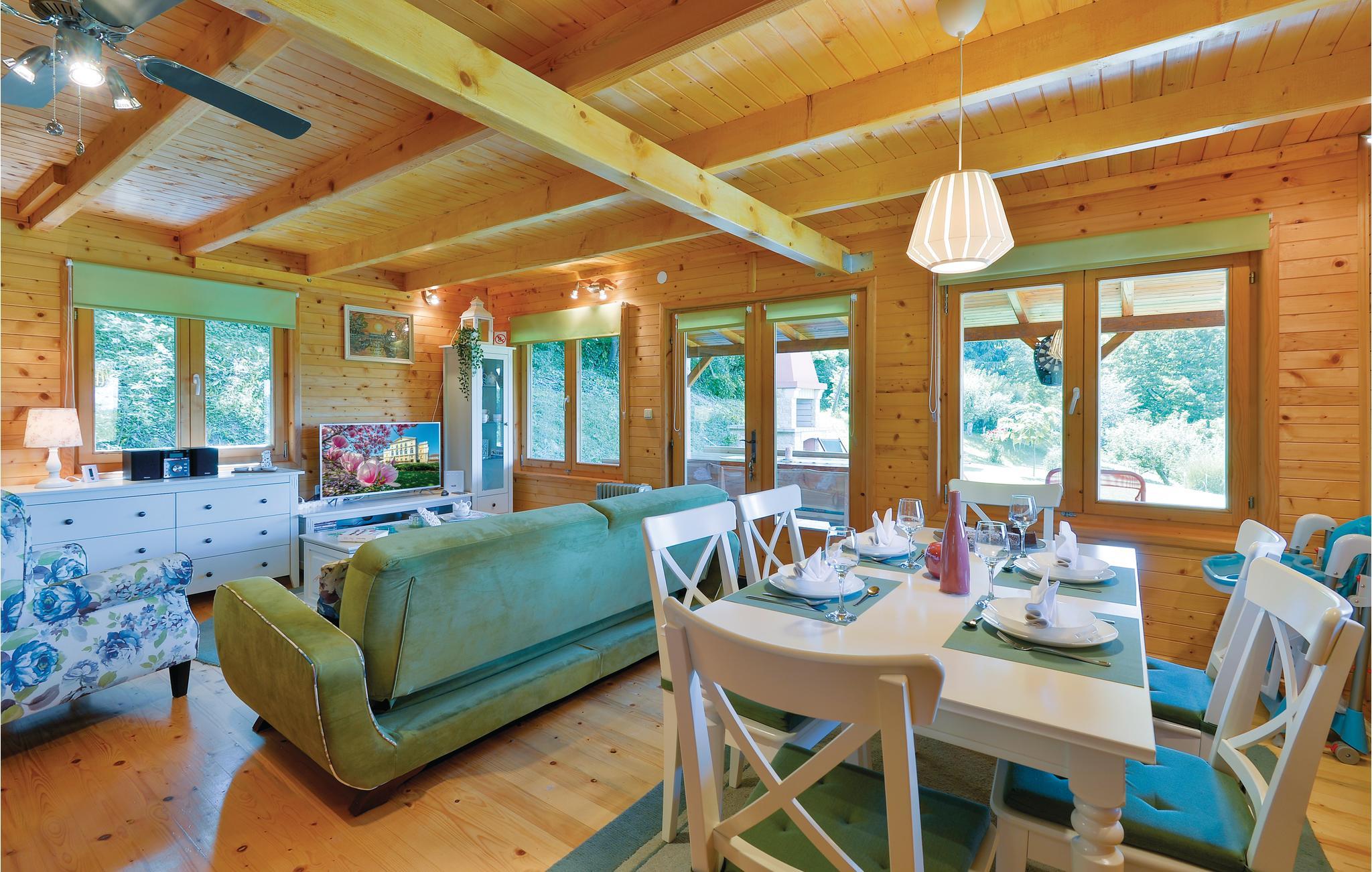Lidt i afstand af Varazdinske Toplice ligger dette omhyggeligt indrettede hus bygget af træ. På den store grund ligger poolen, med et springvand og et uv-vandrensningsanlæg samt et stort legeomårde til børnene og en terrasse hvor I kan slappe af i den behagelige skygge. Husets indre er smukt og moderne indrettet og huset selv er udstyret med alle former for komfort, til en afslappet ferie. I stueplan er der et opholdsrum med udsigt over terrassen, køkken og spisestue og et badeværelse. På første sal med skrå vægge (60 cm i siden) er der to soveværelser, en hems og et badeværelse. Der er kun en km til Varazdinske toplice, et kurbad med mineralske kilder, wellness, sportsanlæg og mulighed for at gå afslappede ture i naturen. I løbet af ferien er der også oplagt at besøge byen Varazdin, hvis monumentale og kunstneriske fortid afspejles af barokarkitektur og de harmoniske pladser og de romantiske smalle stræder. Glem ikke at besøge englemuseet.