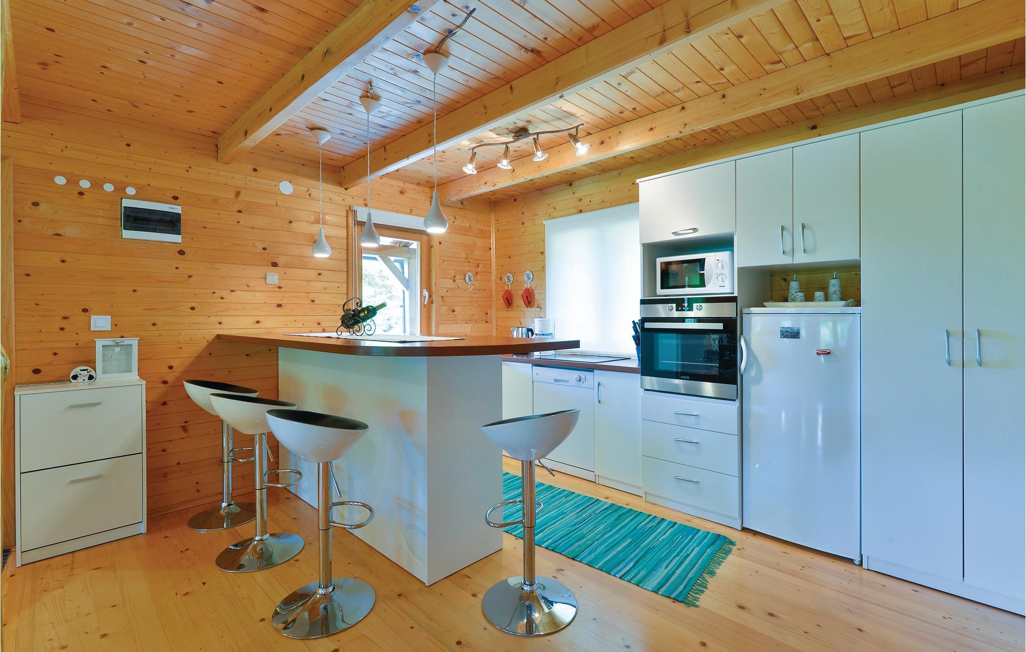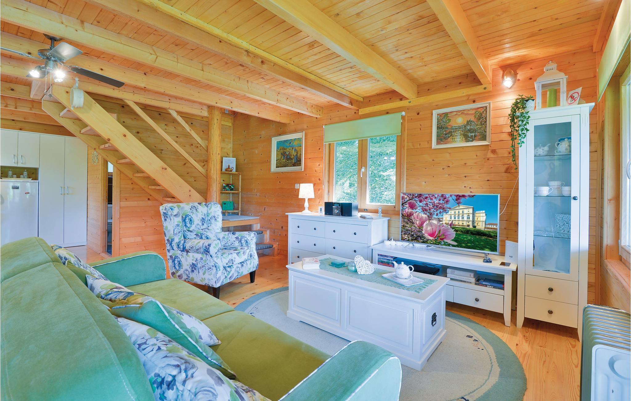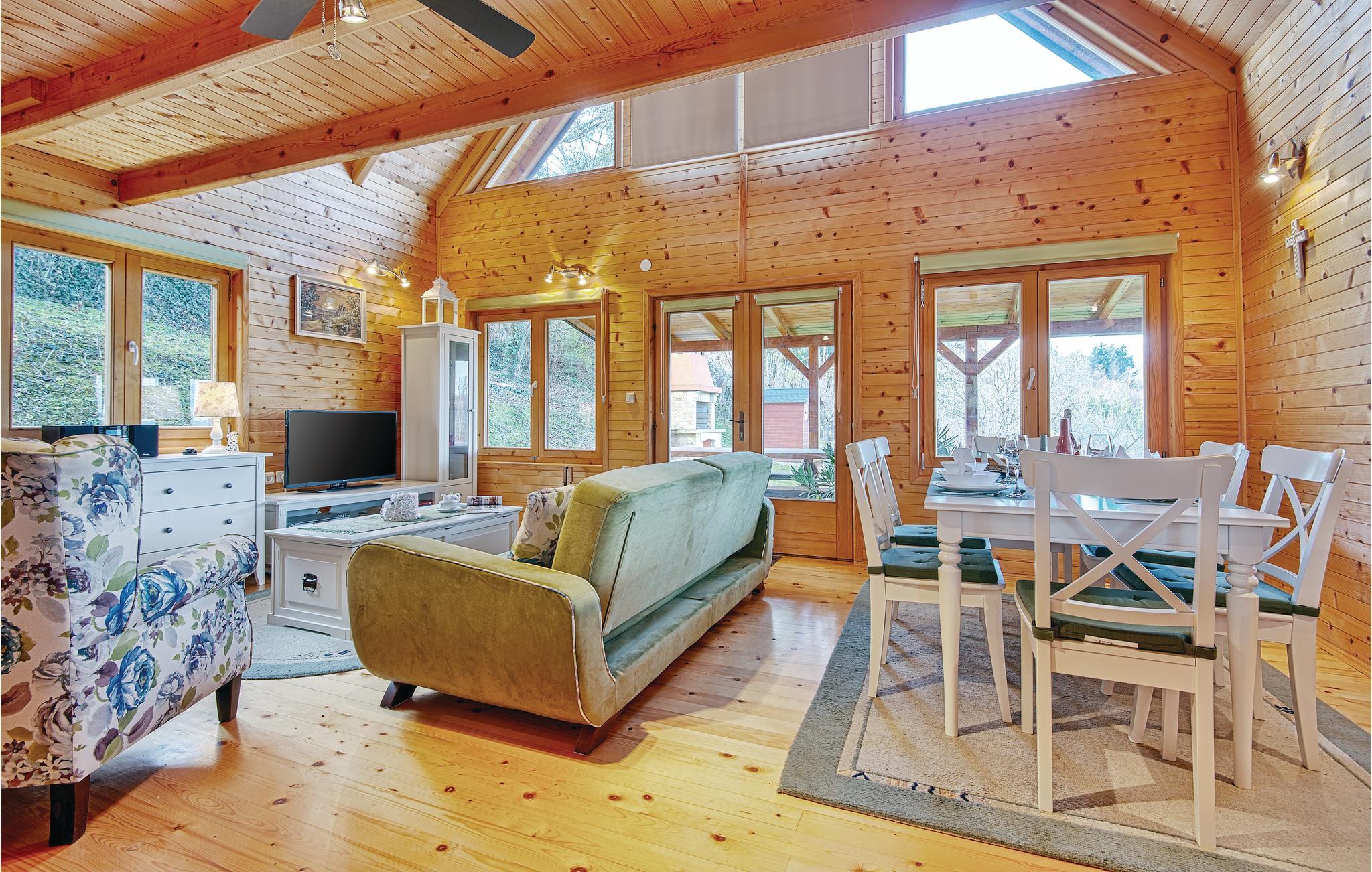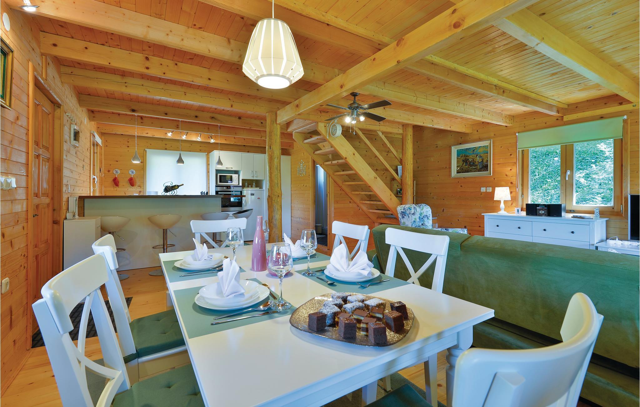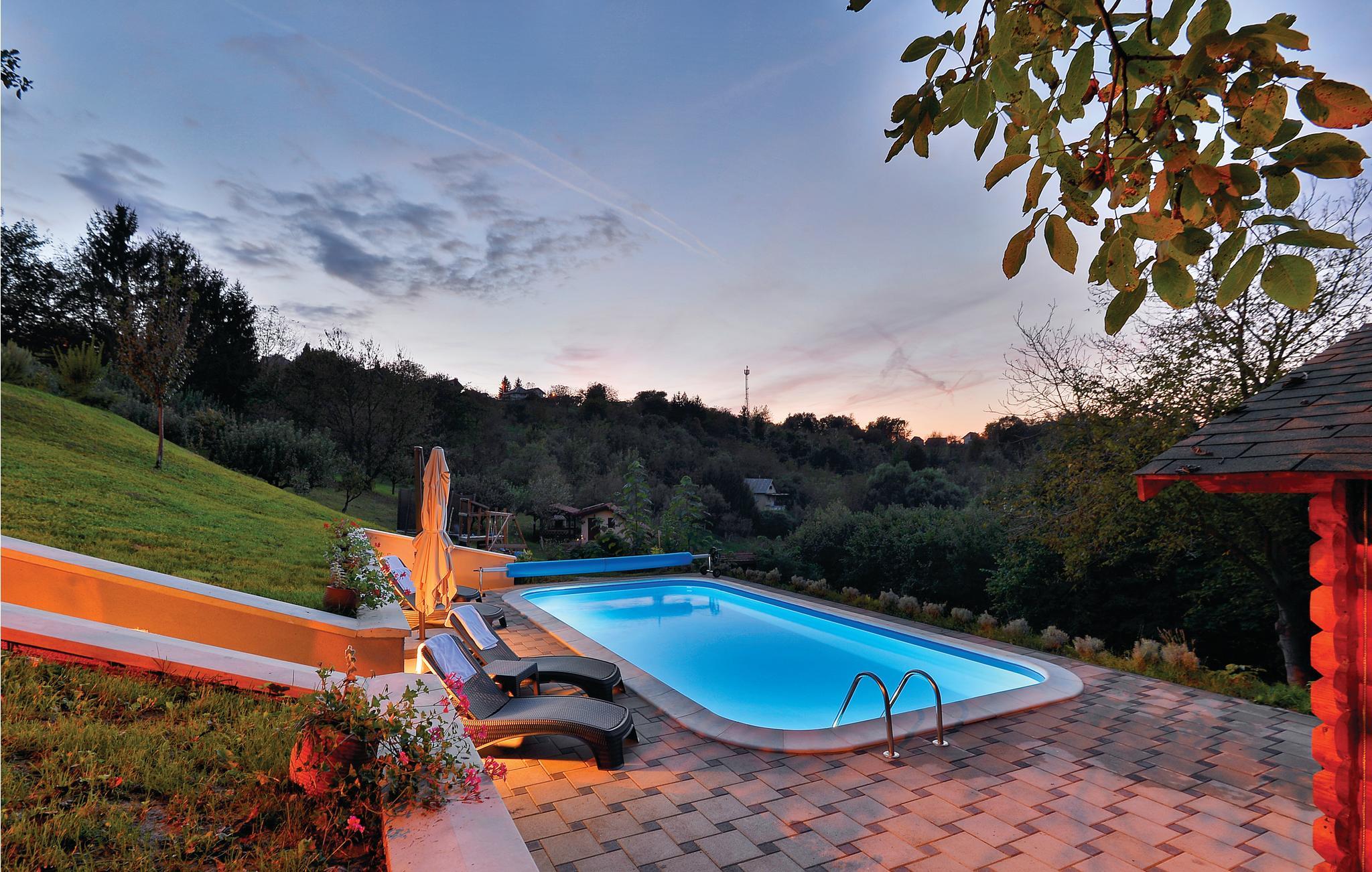 Lidt i afstand af Varazdinske Toplice ligger dette omhyggeligt indrettede hus bygget af træ. På den store grund ligger poolen, med et springvand og et uv-vandrensningsanlæg samt et stort legeomårde til børnene og en terrasse hvor I kan slappe af i den behagelige skygge. Husets indre er smukt og moderne indrettet og huset selv er udstyret med alle former for komfort, til en afslappet ferie. I stueplan er der et opholdsrum med udsigt over terrassen, køkken og spisestue og et badeværelse. På første sal med skrå vægge (60 cm i siden) er der to soveværelser, en hems og et badeværelse. Der er kun en km til Varazdinske toplice, et kurbad med mineralske kilder, wellness, sportsanlæg og mulighed for at gå afslappede ture i naturen. I løbet af ferien er der også oplagt at besøge byen Varazdin, hvis monumentale og kunstneriske fortid afspejles af barokarkitektur og de harmoniske pladser og de romantiske smalle stræder. Glem ikke at besøge englemuseet.