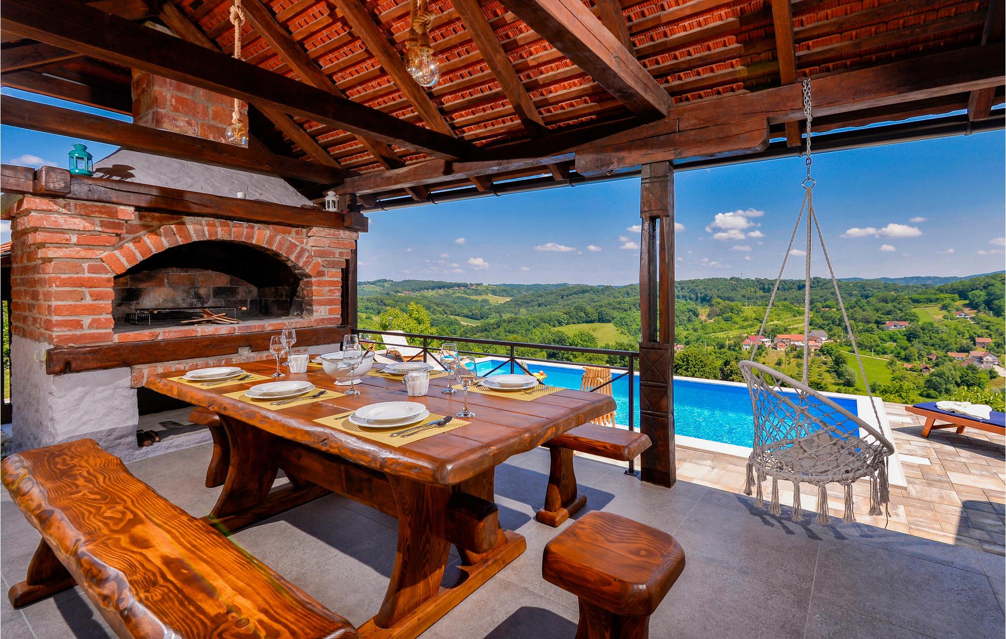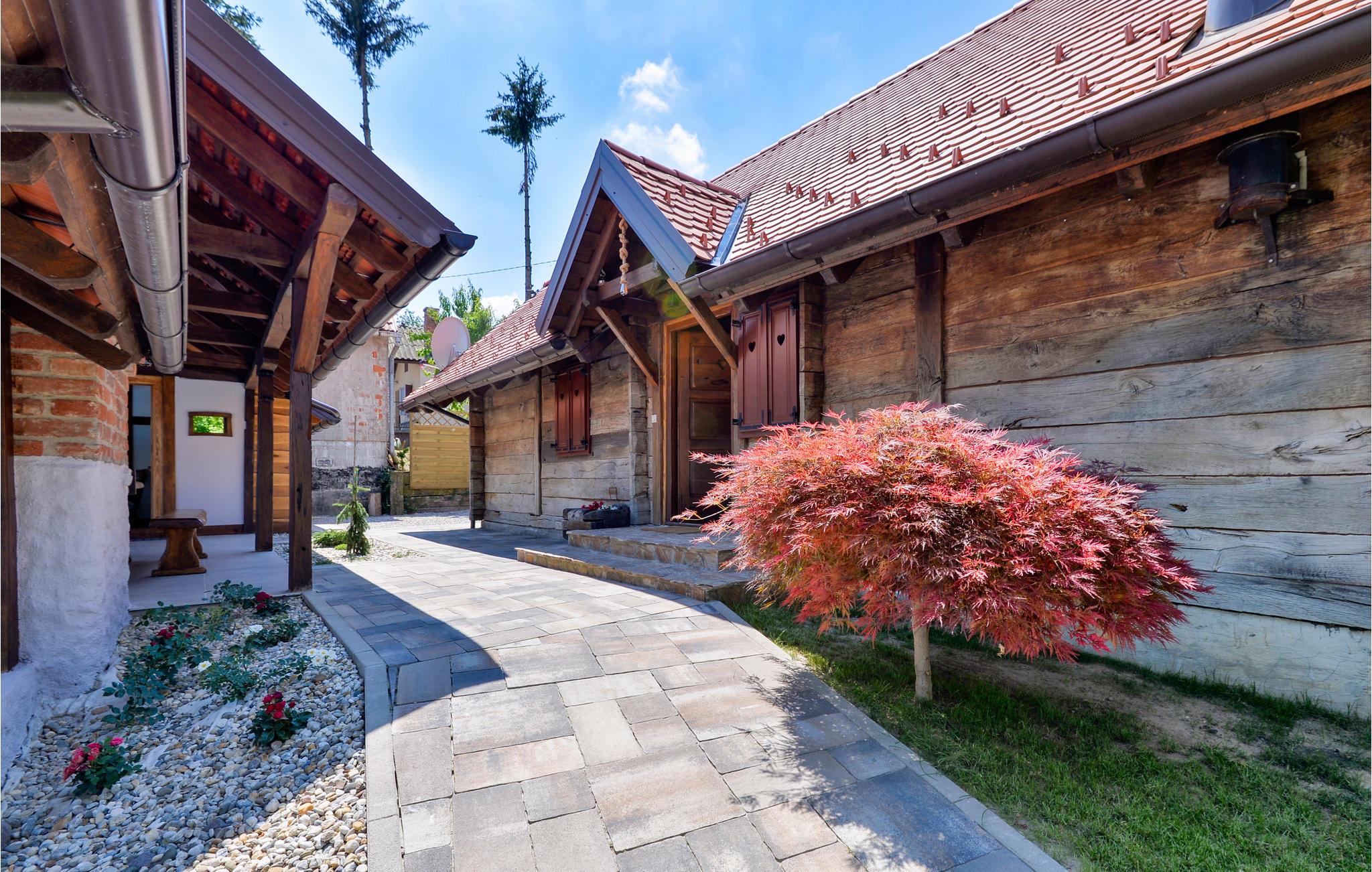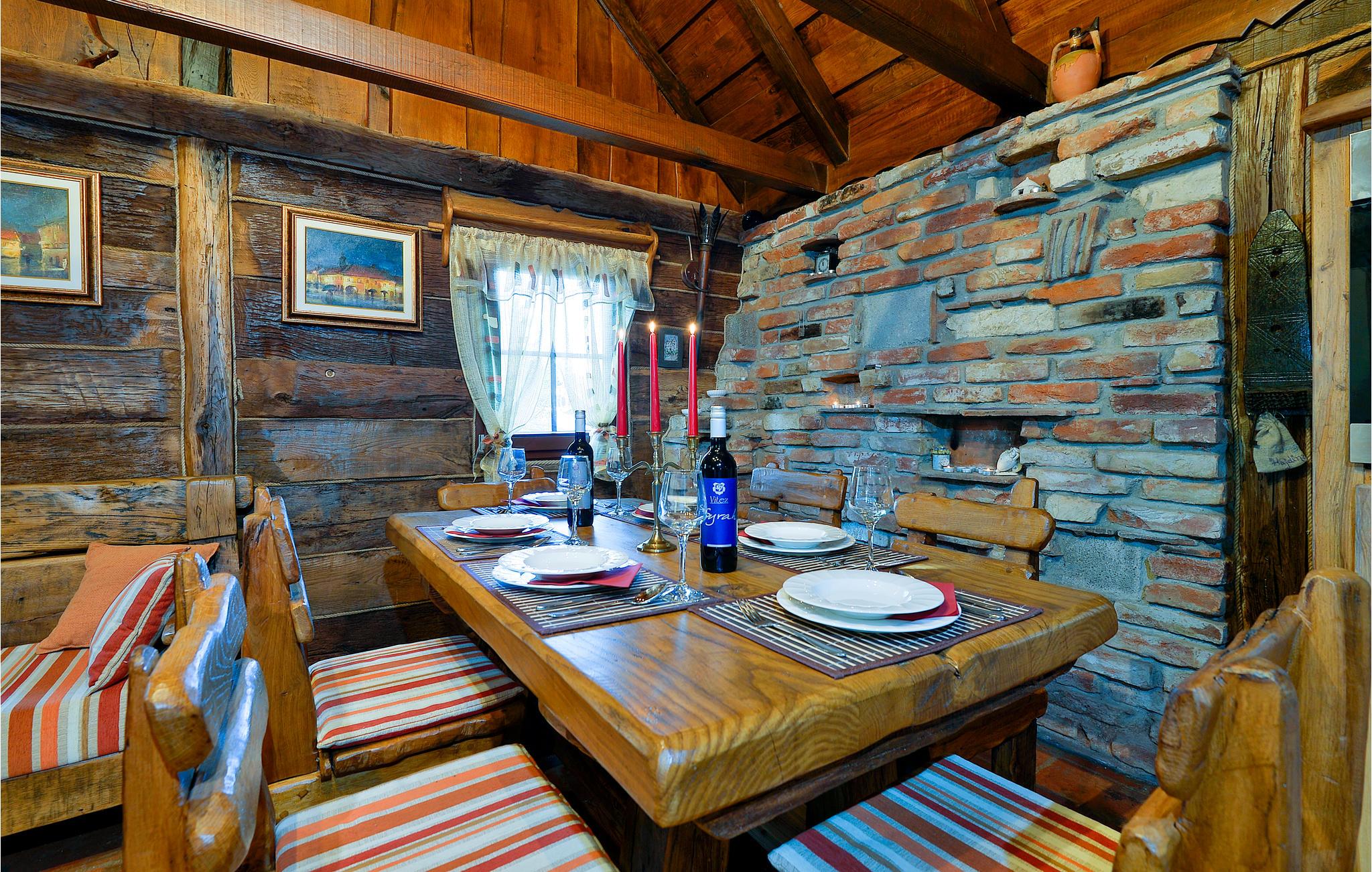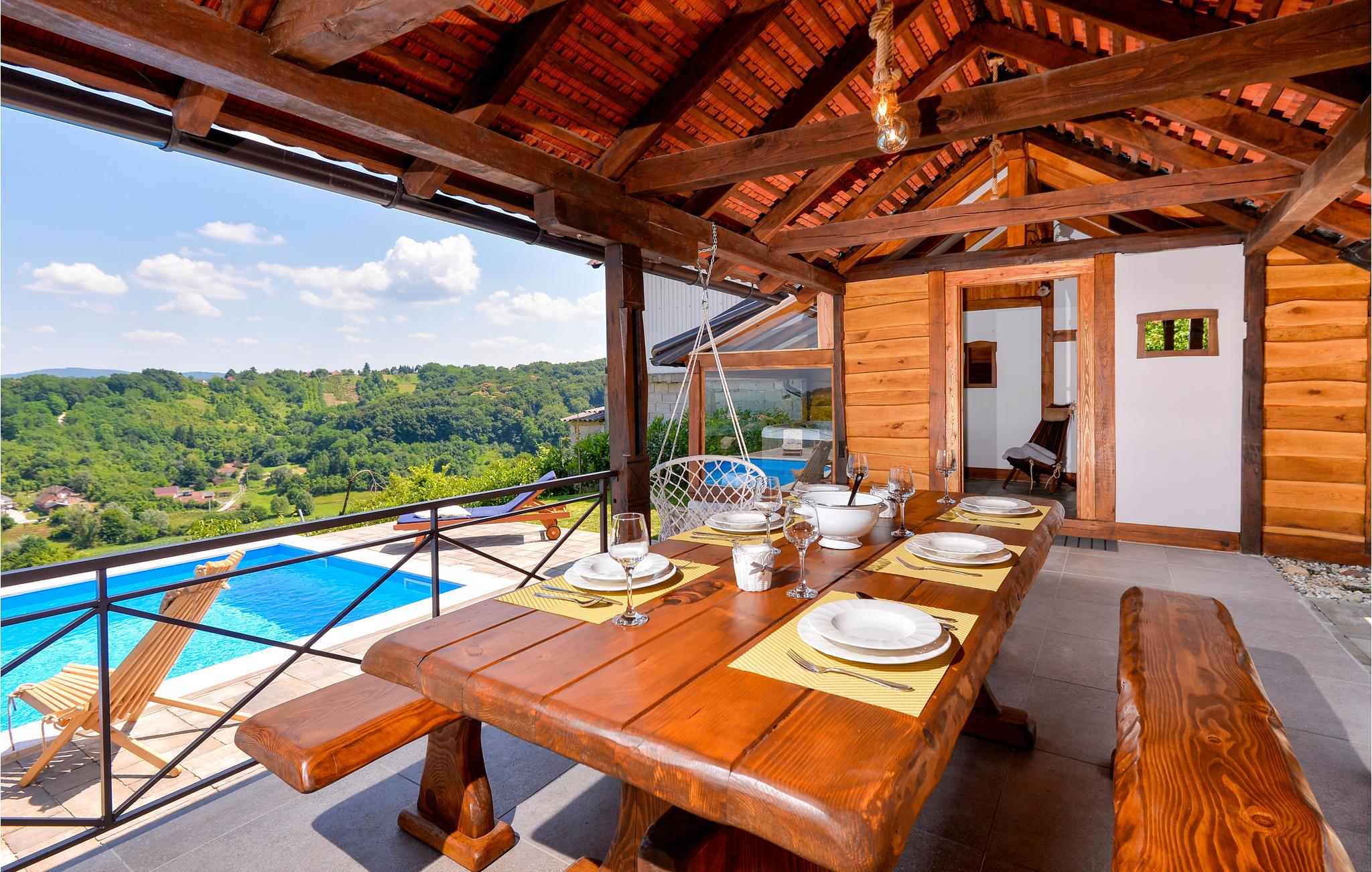 I nærheden af spaet i Varaždin ligger dette vidunderlige træhus. Det ligger på en bakke omgivet af vinmarker og tilbyder smuk udsigt over landskabet. Ren luft, fredelige omgivelser og et sommerhus lavet af naturlige materialer sikrer en afslappende ferie. I stueetagen består huset af et køkken med stue, badeværelse og et soveværelse med eget badeværelse, mens der ovenpå er et andet soveværelse og et ekstra værelse med to ekstra enkeltsenge. Foran huset er der en overdækket terrasse med grillplads og en glasindrammet del, hvor der er et boblebad med vidunderlig udsigt over dalen. Der er også en swimmingpool i haven, hvor du kan opfriske dig på varme sommerdage. I kælderen er der en sauna til fire personer og et afslapningsområde med bruser. Da feriehuset ligger i et vindyrkningsområde, er det muligt at prøve lokale vine med værterne og arrangere catering mod et tillægsgebyr. Det er også værd at besøge den smukke by Varaždin, hvis kunstneriske arv med sin bevarede og frodige barokke arkitektur såvel som dens harmoniske pladser og romantiske gader kan skabe begejstring. Gå ikke glip af at besøge Museum of Angels og insektens verdenssamling. I nærheden finder du de termiske bade i Varaždin, hvor du kan nyde fordelene ved termisk vand og wellness.