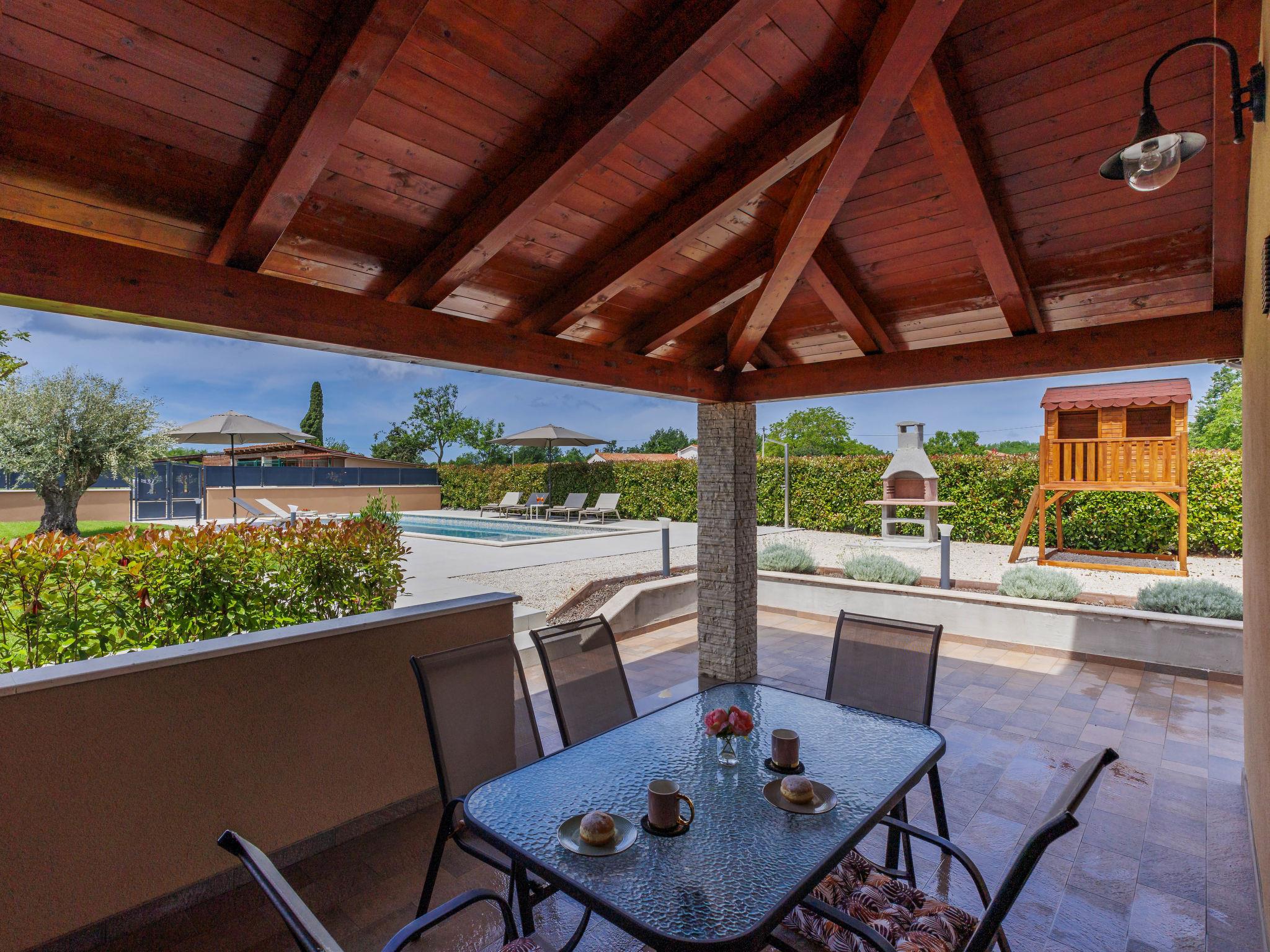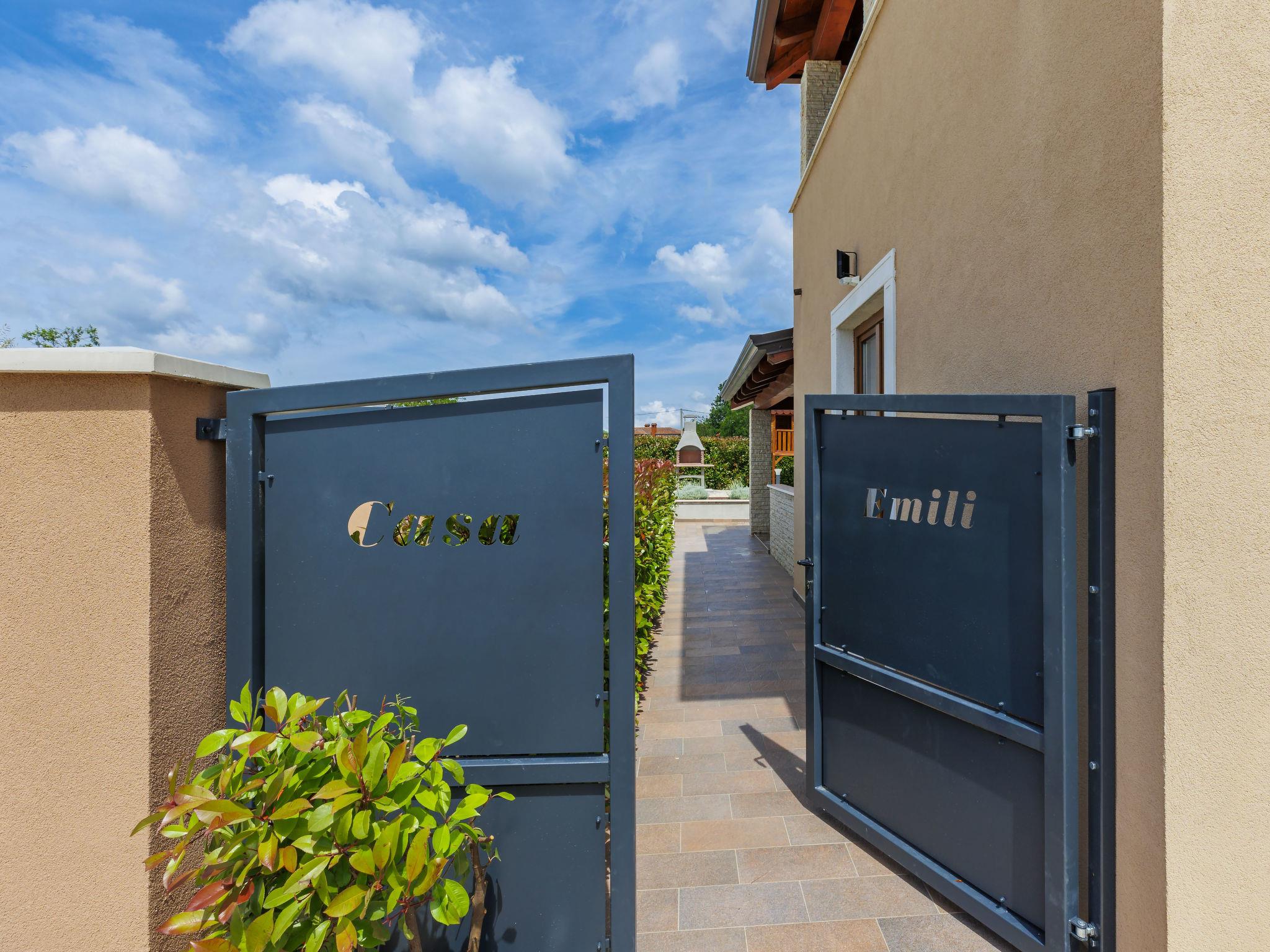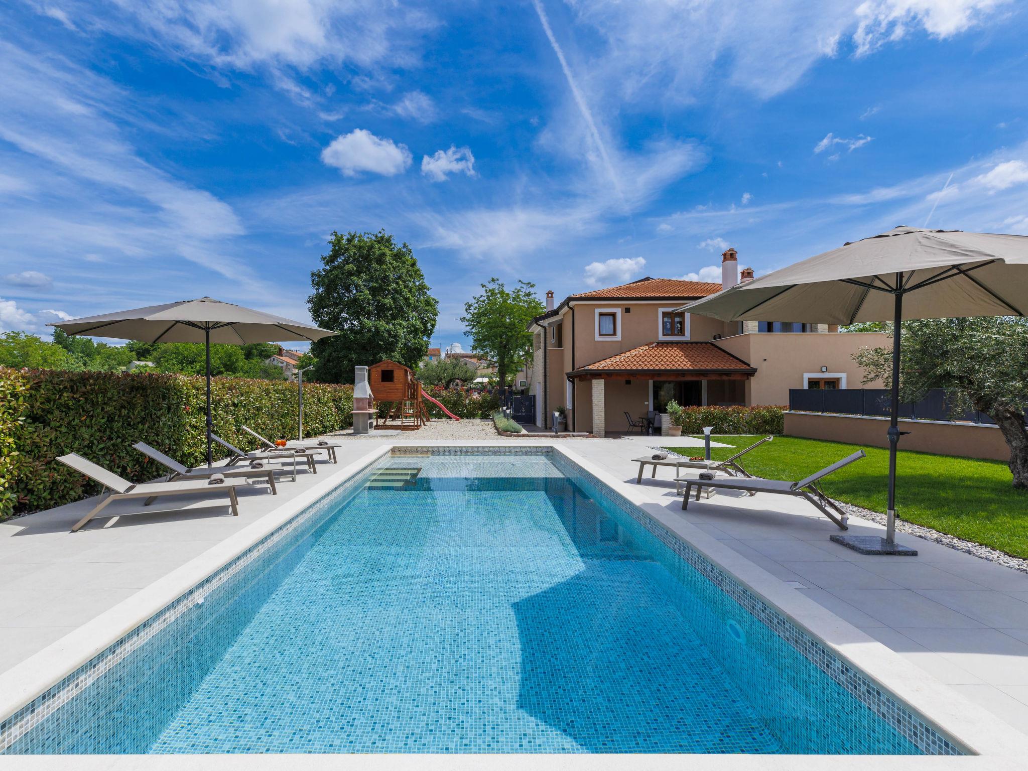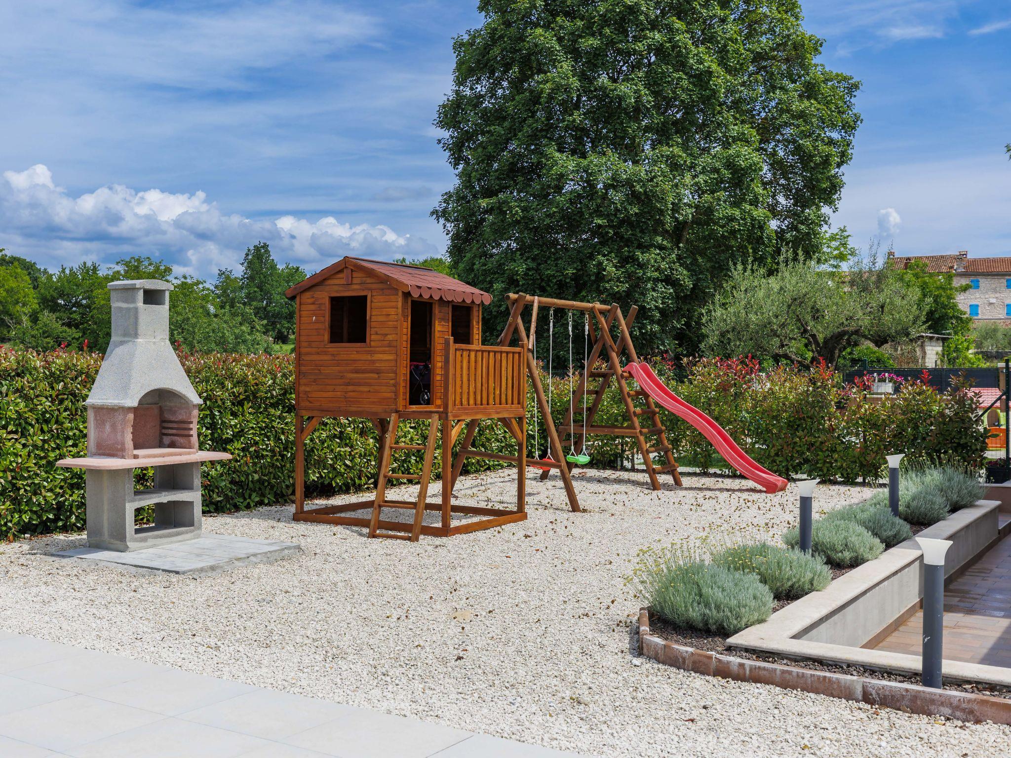 Beautiful 2-family house "Emili", built in 2022. In the hamlet Jadruhi 4 km from the centre of Vižinada, 5 km from the centre of Višnjan, 10 km from the centre of Kaštelir, in a sunny position, 19 km from the sea. Private: property 400 m2, swimming pool angular (52 m2, depth 150 cm, seasonal availability: 01.May. - 01.Oct.) with internal staircase. Paddling pool, outdoor shower, terrace (20 m2), garden furniture, children's playground (slide, swing), pool maintenance by the owner/gardener. In the house: internet access. Parking (for 2 cars) at the house on the premises. Shop 4 km, restaurant 100 m, bus stop 3.9 km, rocky beach 19 km. Walking paths from the house 100 m, cycle lane 150 m.