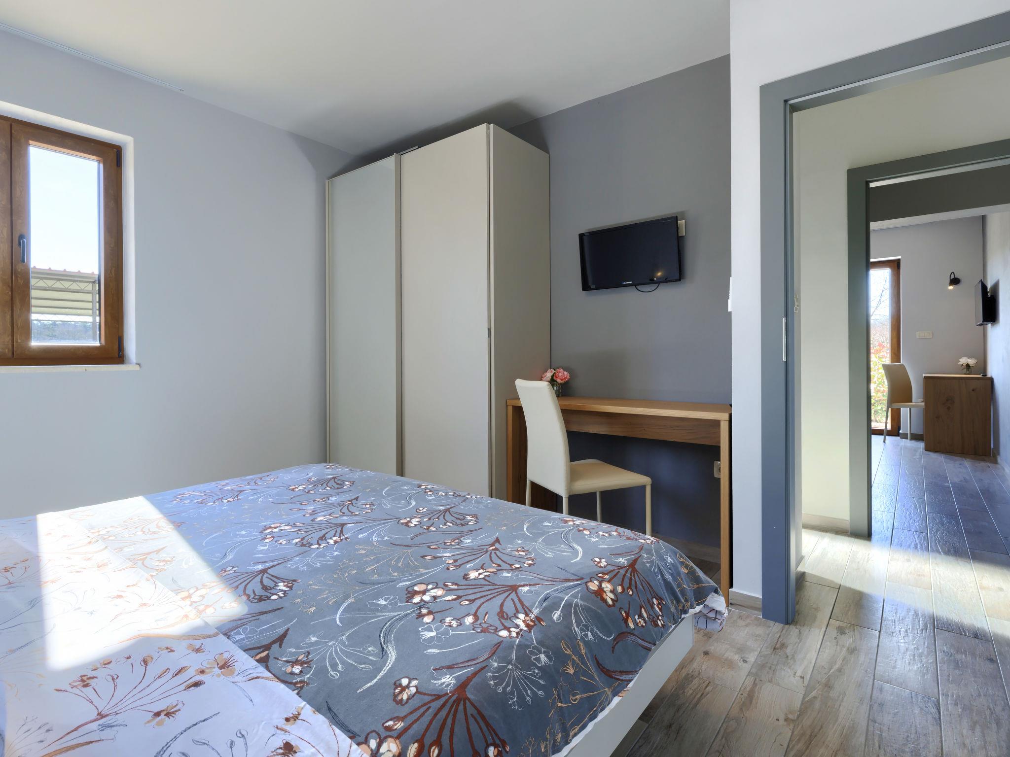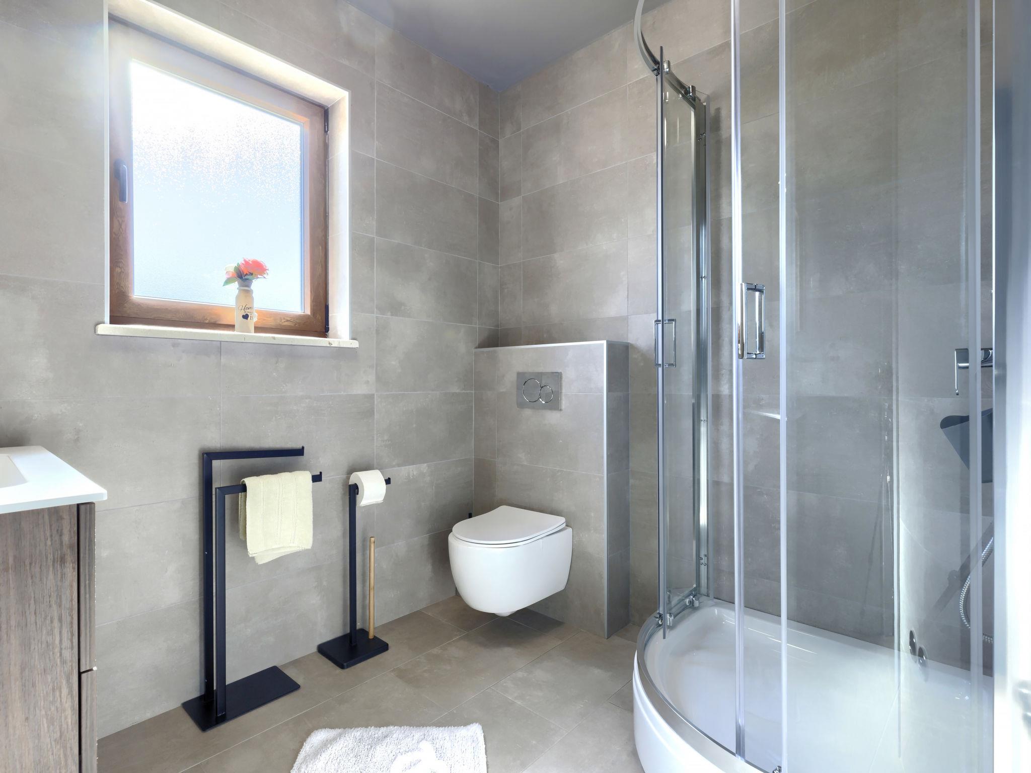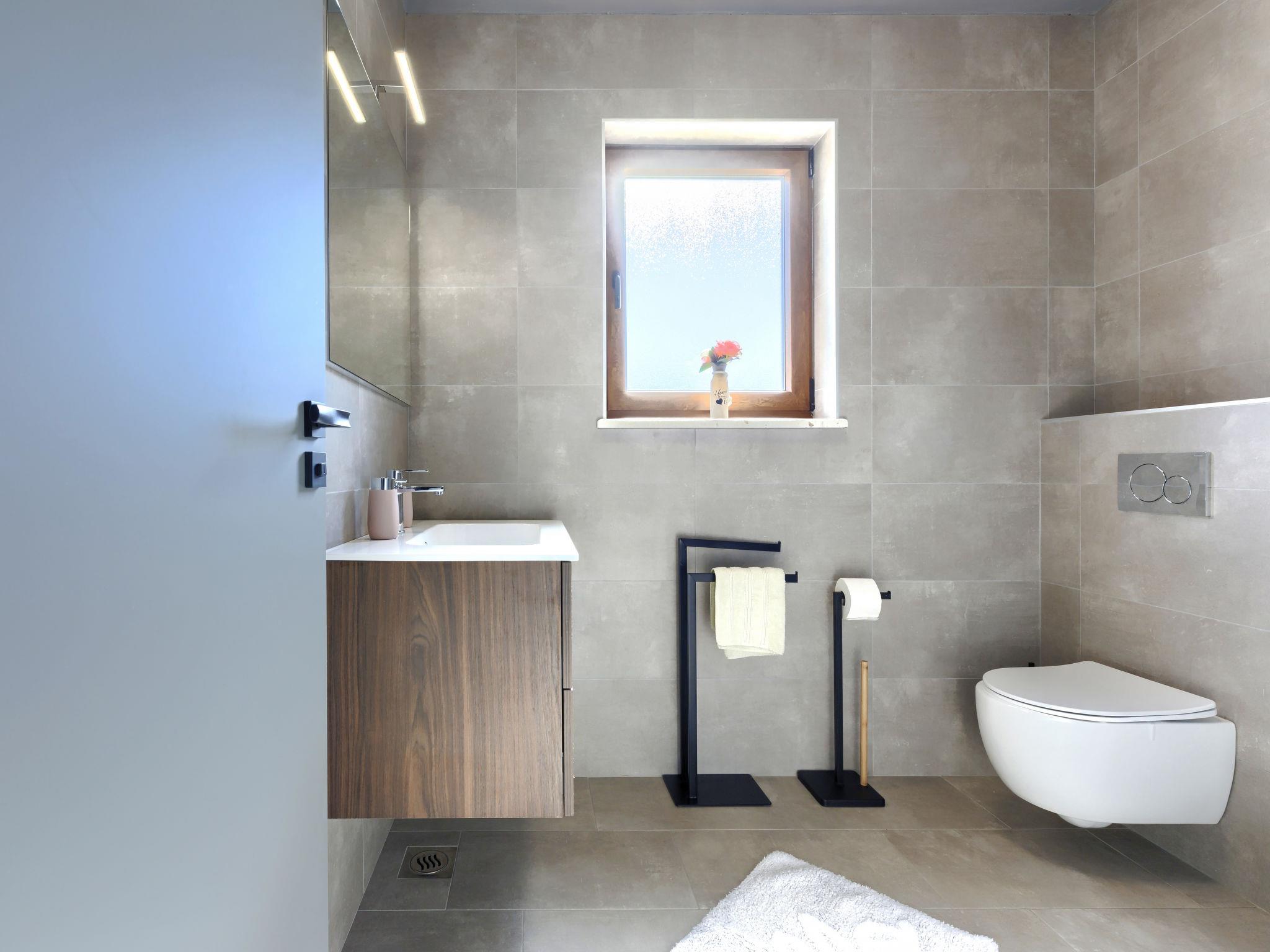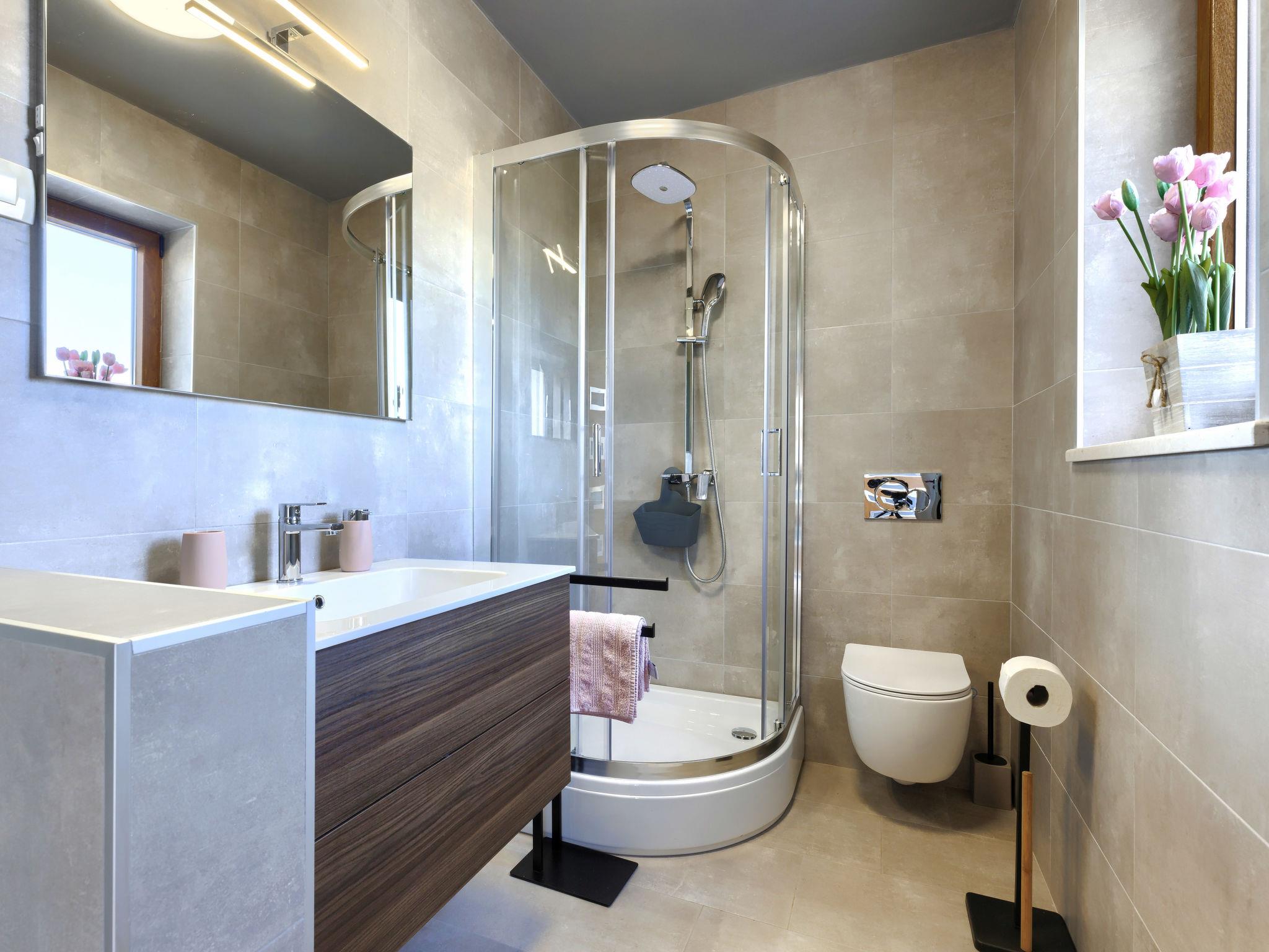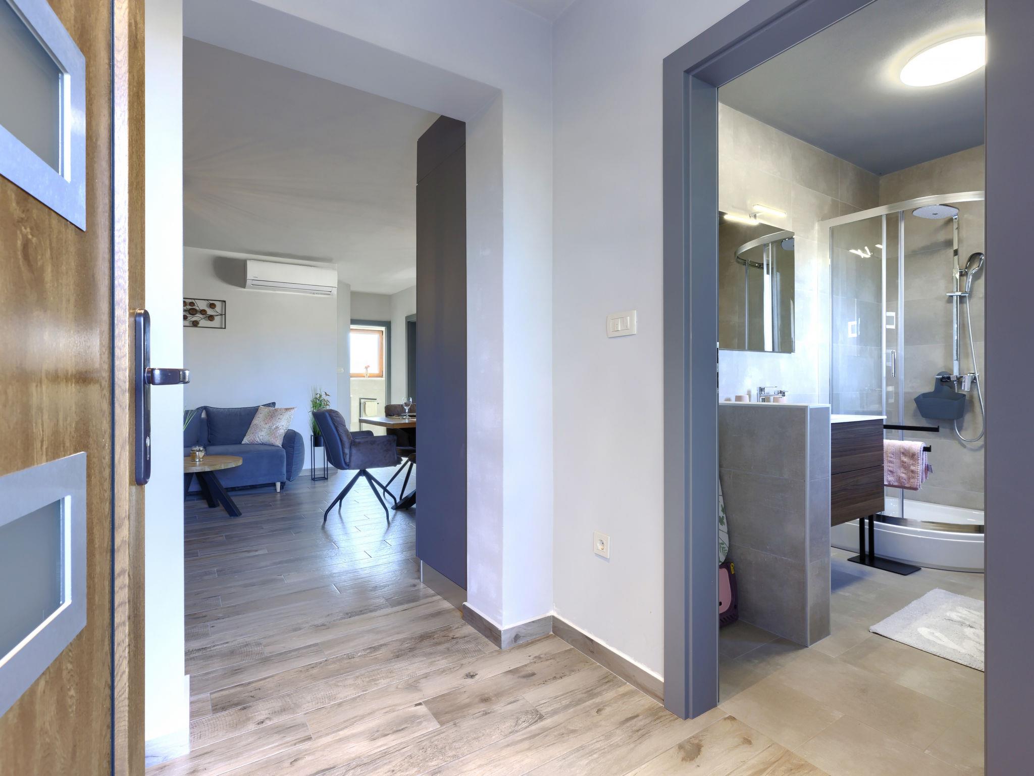Beautiful 2-family house "Emili", built in 2022. In the hamlet Jadruhi 4 km from the centre of Vižinada, 5 km from the centre of Višnjan, 10 km from the centre of Kaštelir, in a sunny position, 19 km from the sea. Private: property 400 m2, swimming pool angular (52 m2, depth 150 cm, seasonal availability: 01.May. - 01.Oct.) with internal staircase. Paddling pool, outdoor shower, terrace (20 m2), garden furniture, children's playground (slide, swing), pool maintenance by the owner/gardener. In the house: internet access. Parking (for 2 cars) at the house on the premises. Shop 4 km, restaurant 100 m, bus stop 3.9 km, rocky beach 19 km. Walking paths from the house 100 m, cycle lane 150 m.