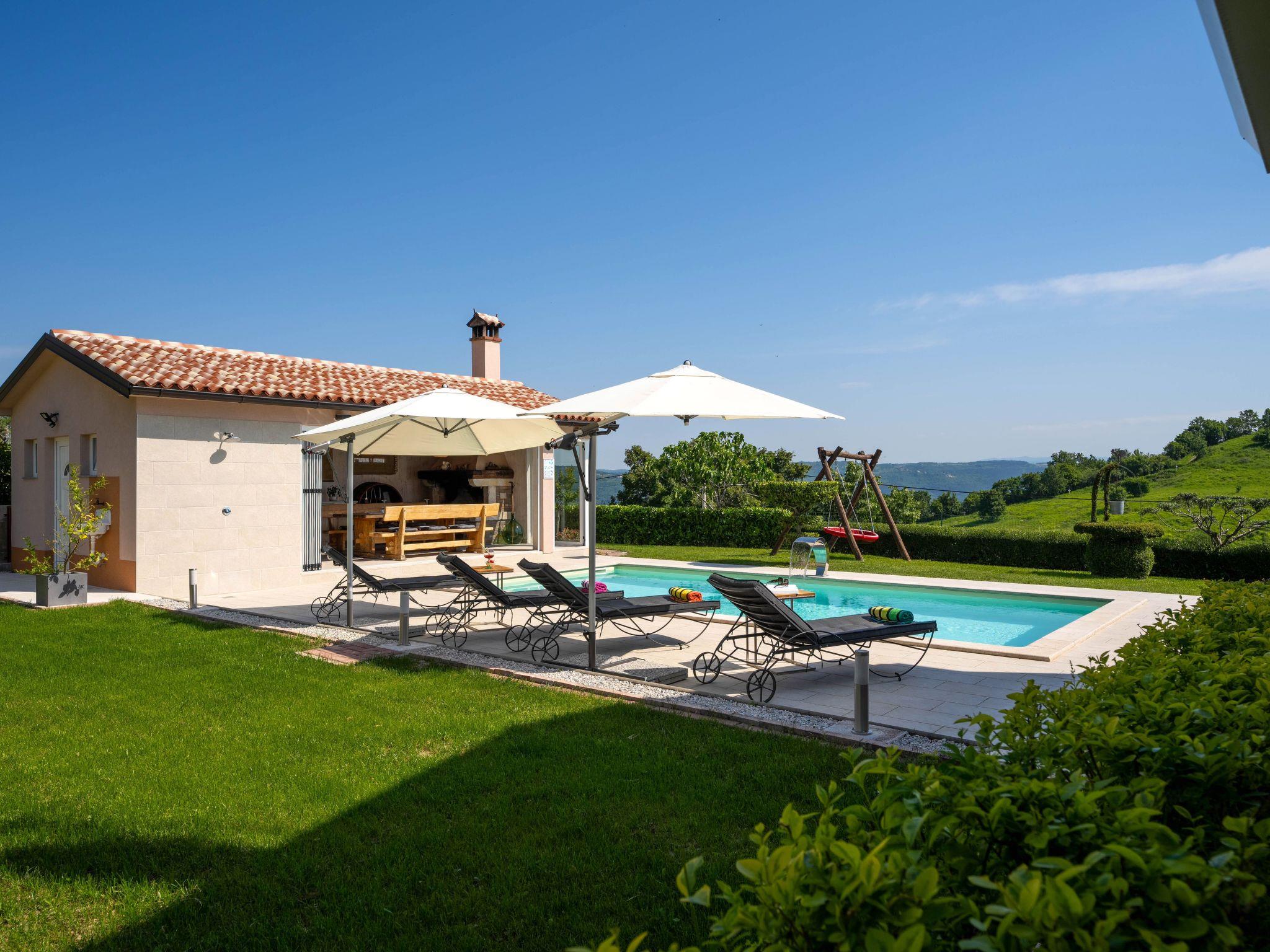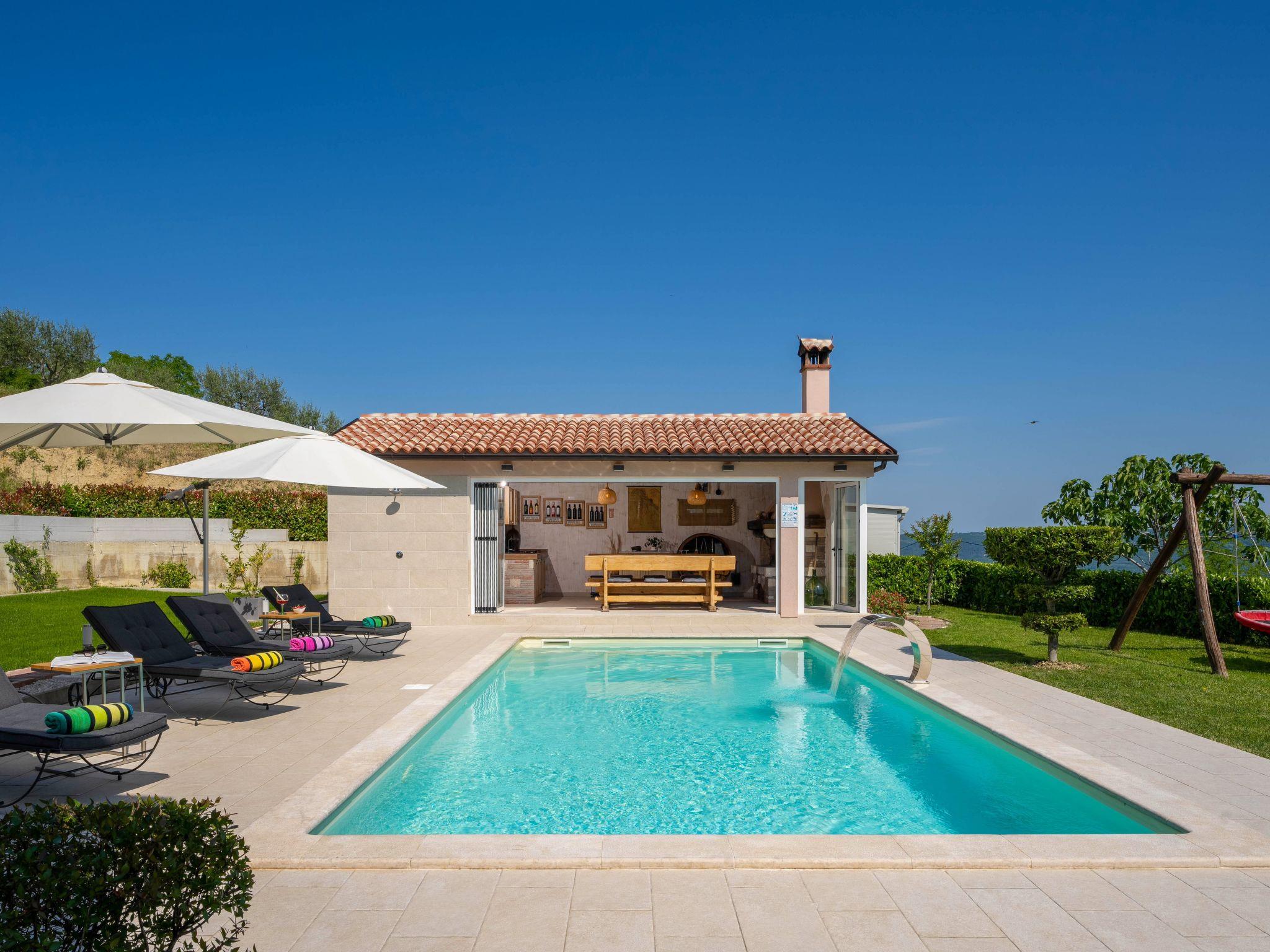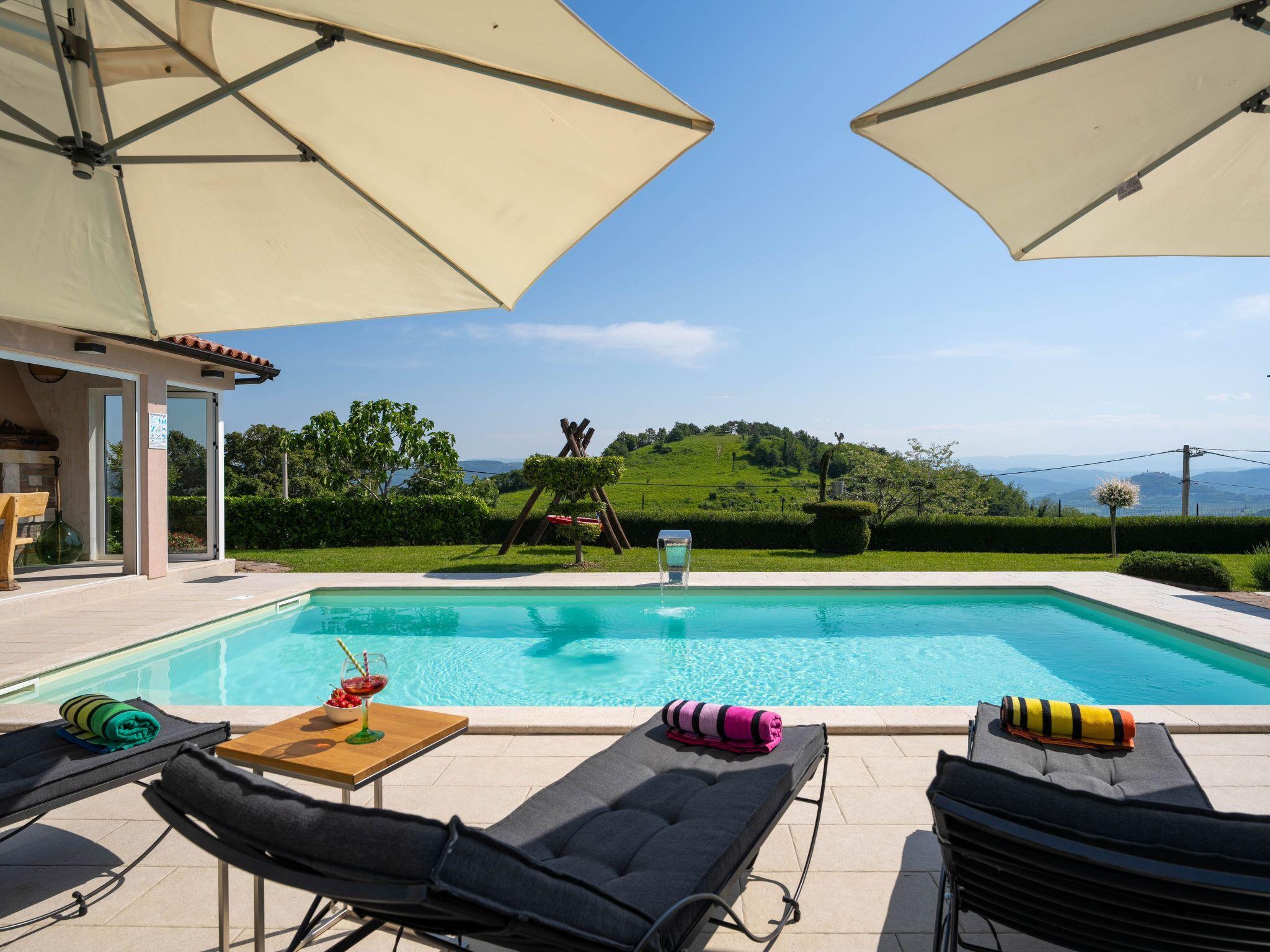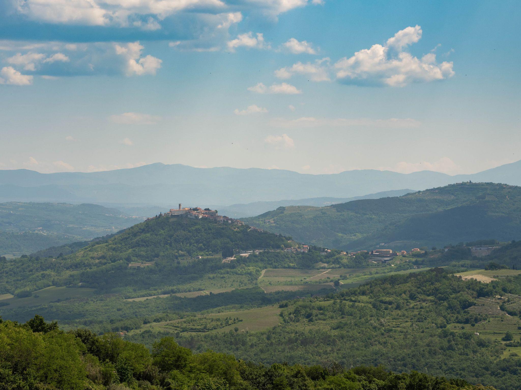 This beautiful holiday home with a swimming pool covers a total of 100m2 living area on two air-conditioned floors. On the ground floor there is a living area with a fully equipped kitchen, a dining table, living room, and a separate toilet. At the entrance to the house, there is a nice covered terrace with lounge furniture and a beautiful view. On the first floor there is one bedroom with a double bed, two single rooms and a bathroom with a shower/toilet. One room leads to a spacious balcony with seating, from which there is a wonderful view of Motovun and the green landscape.