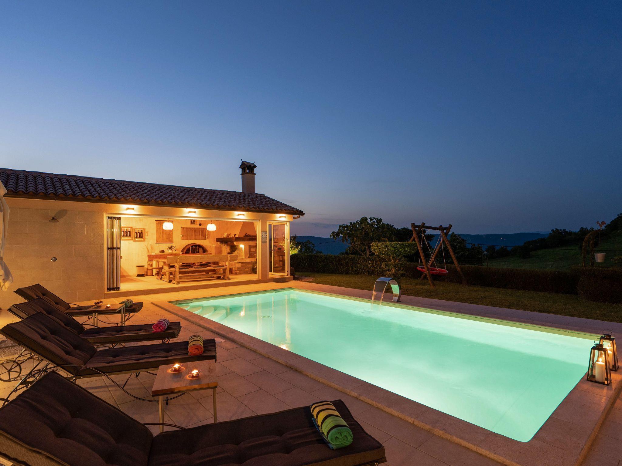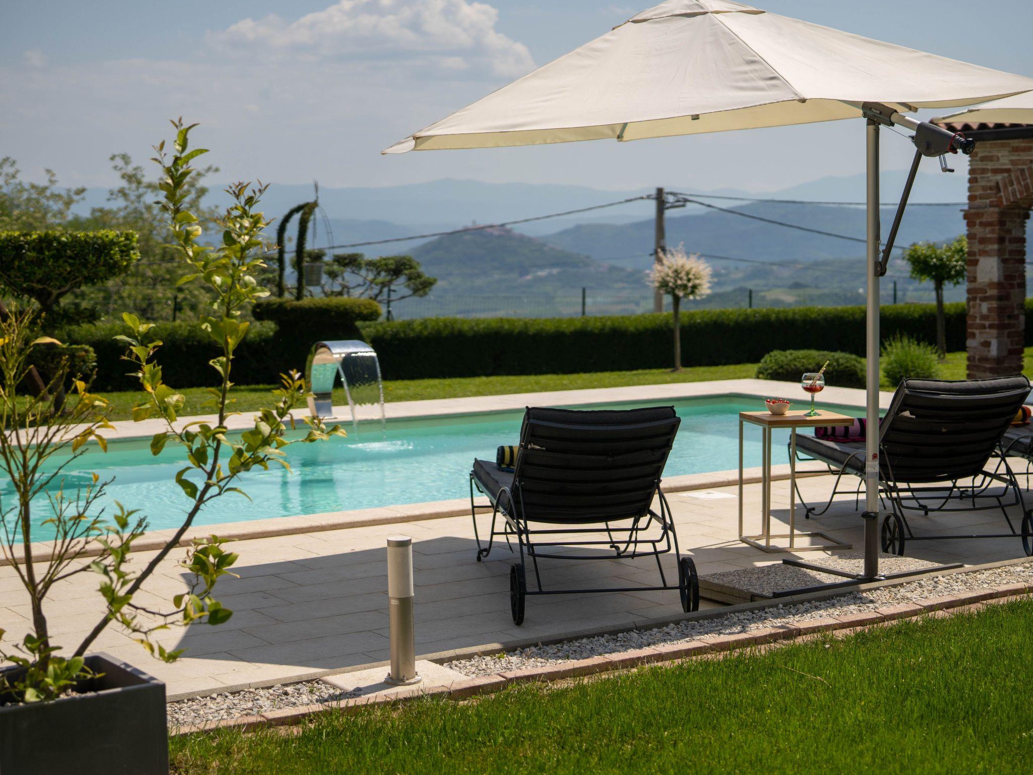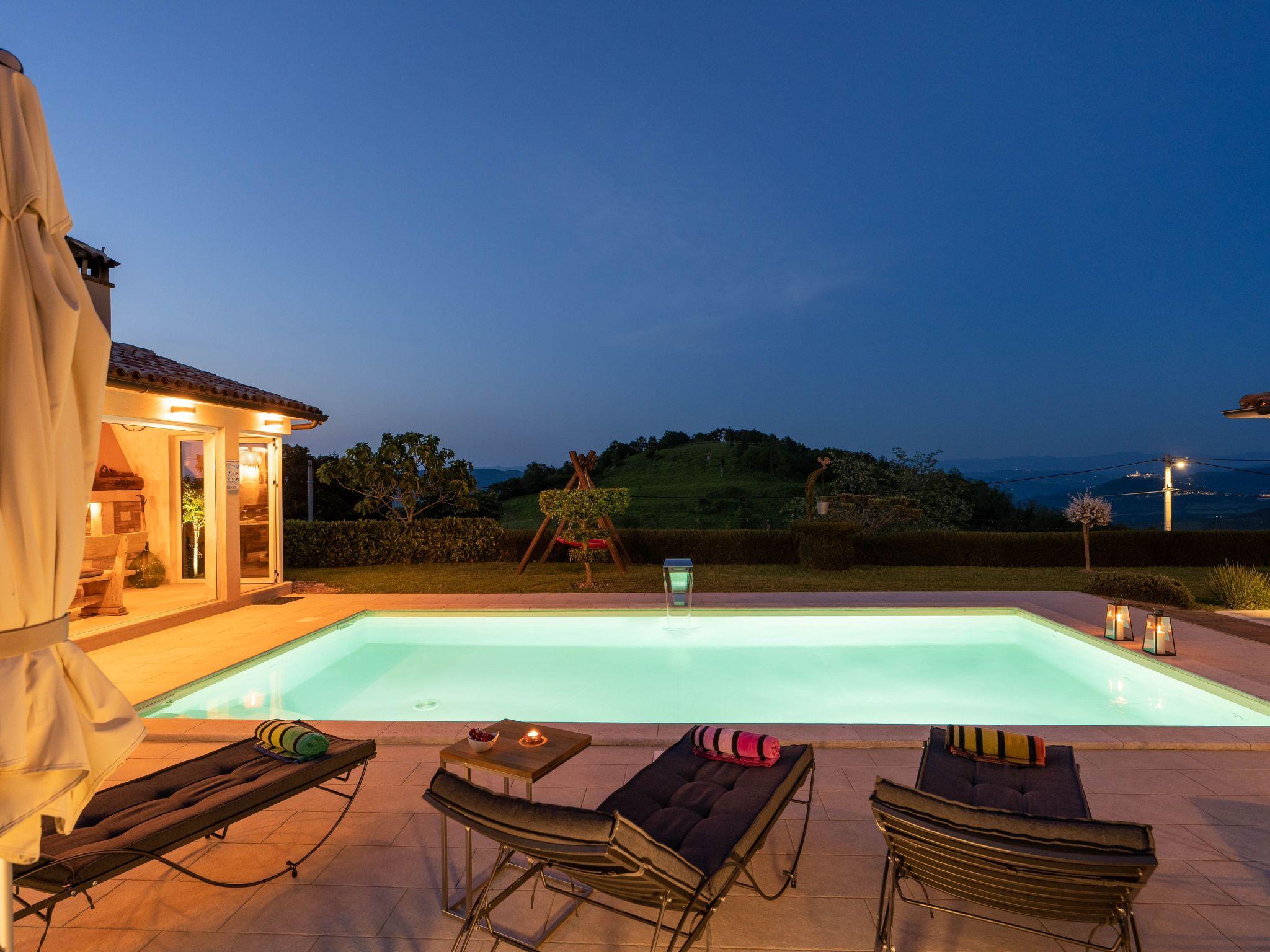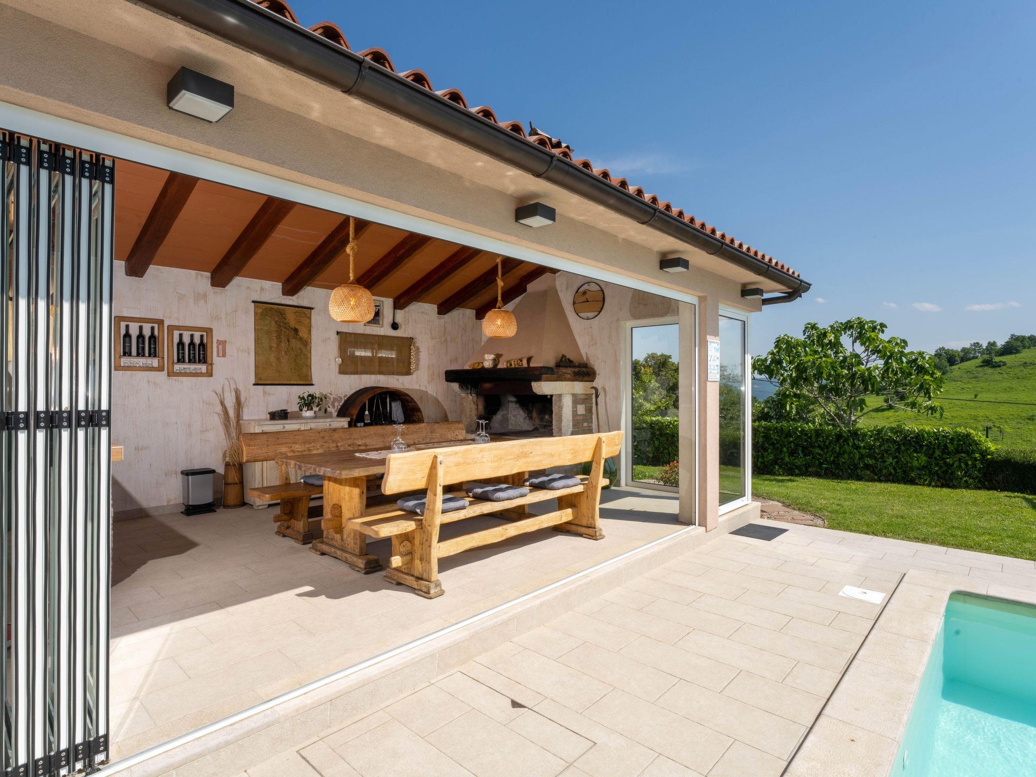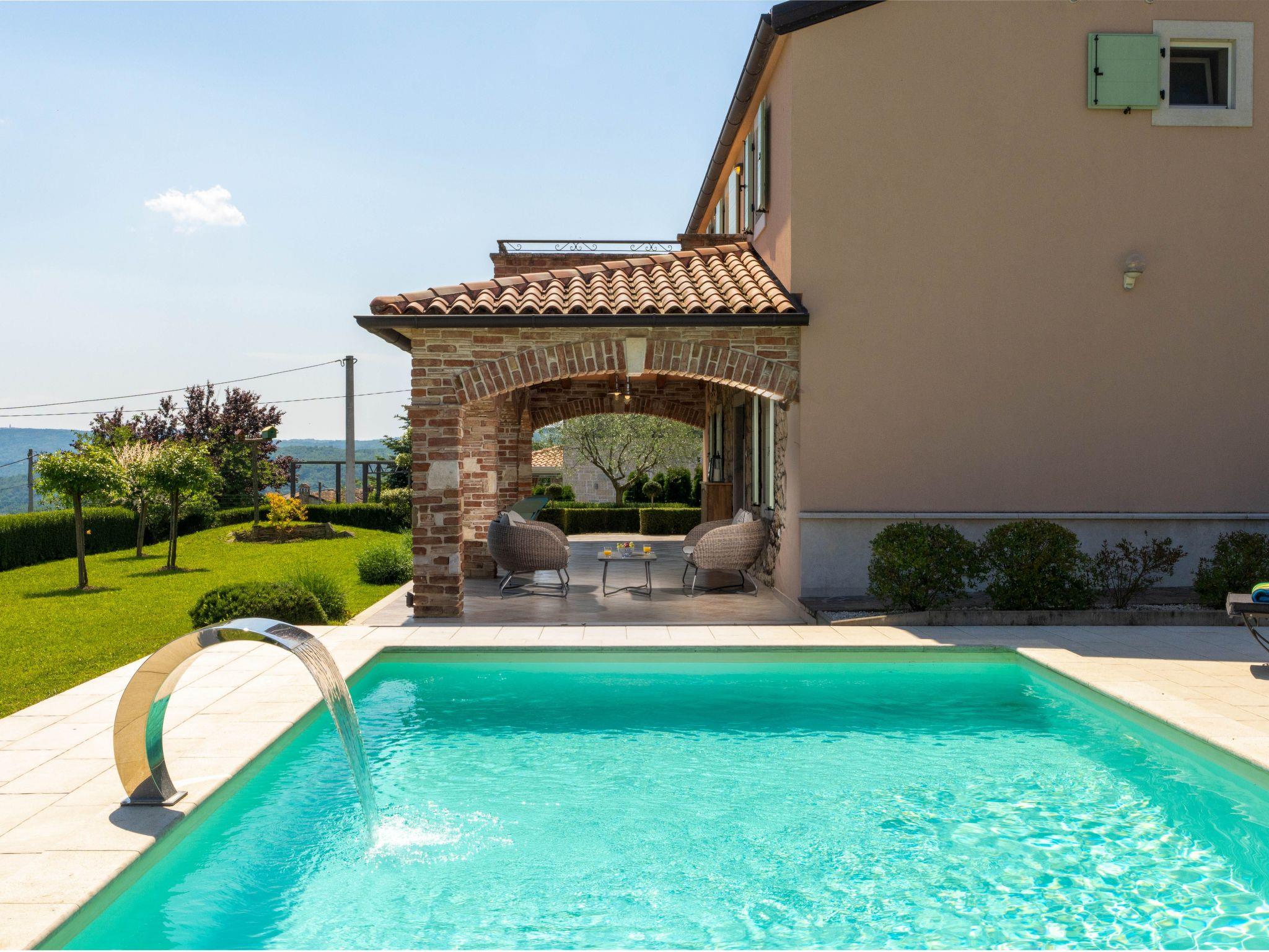 This beautiful holiday home with a swimming pool covers a total of 100m2 living area on two air-conditioned floors. On the ground floor there is a living area with a fully equipped kitchen, a dining table, living room, and a separate toilet. At the entrance to the house, there is a nice covered terrace with lounge furniture and a beautiful view. On the first floor there is one bedroom with a double bed, two single rooms and a bathroom with a shower/toilet. One room leads to a spacious balcony with seating, from which there is a wonderful view of Motovun and the green landscape.