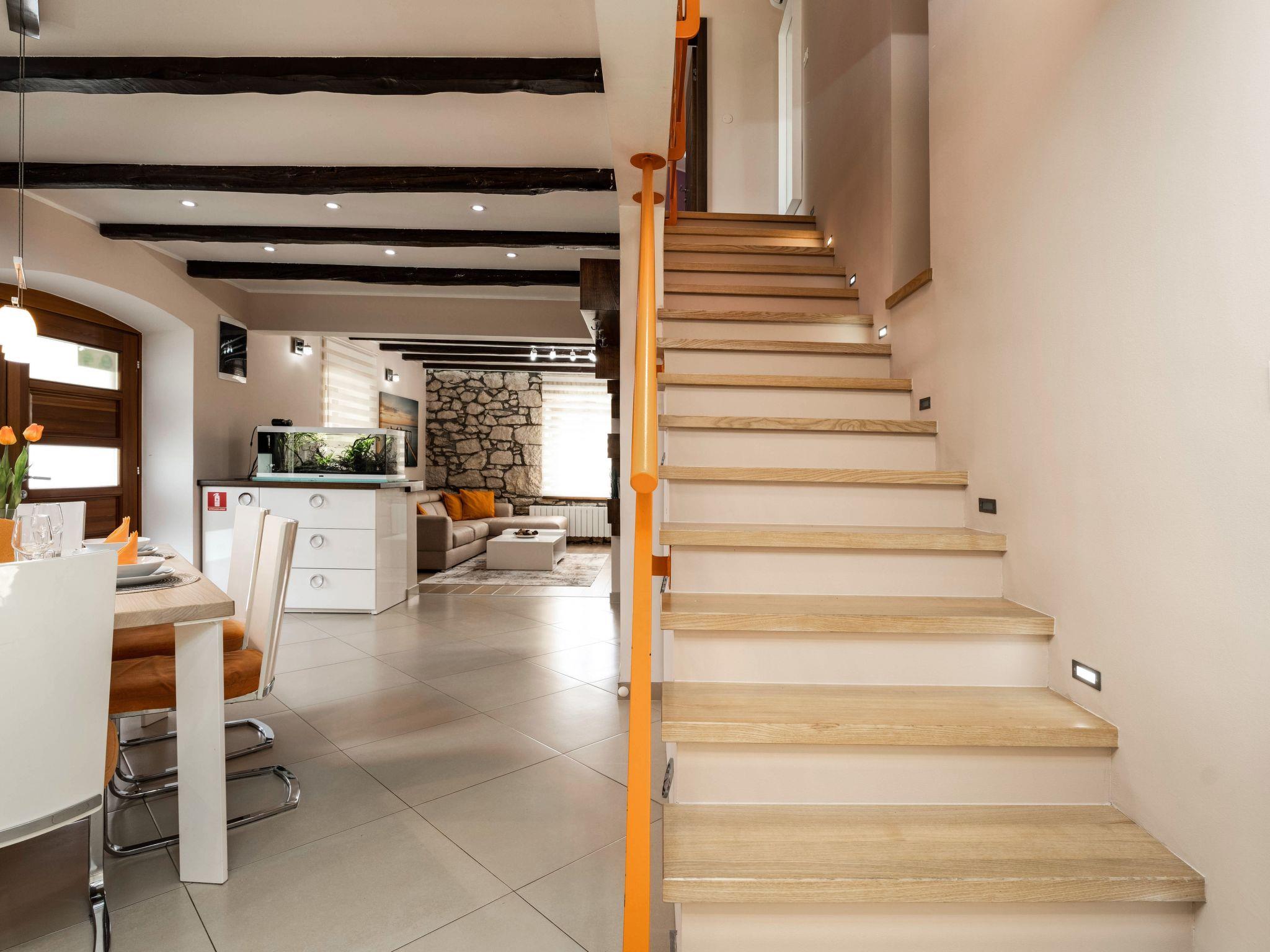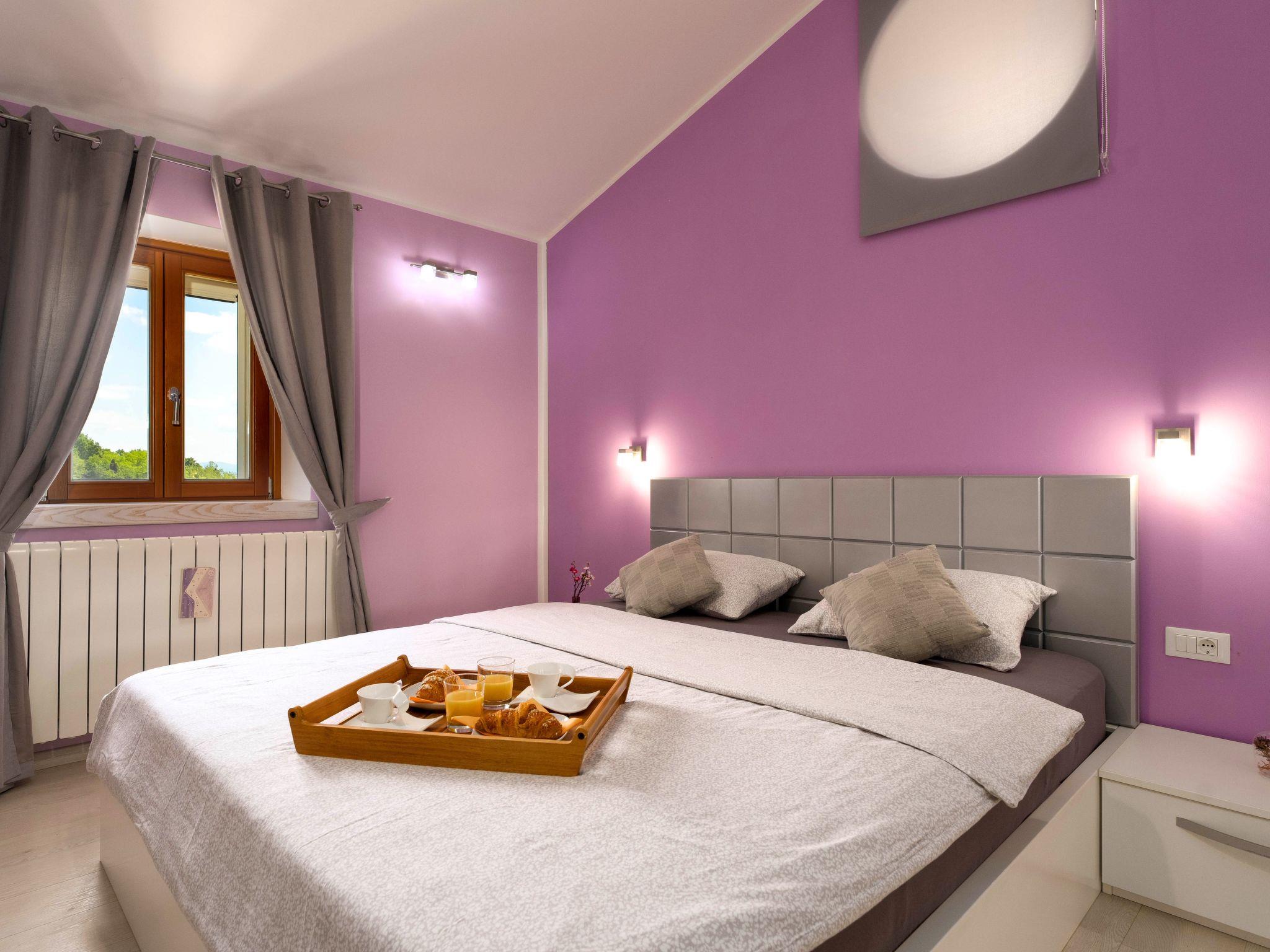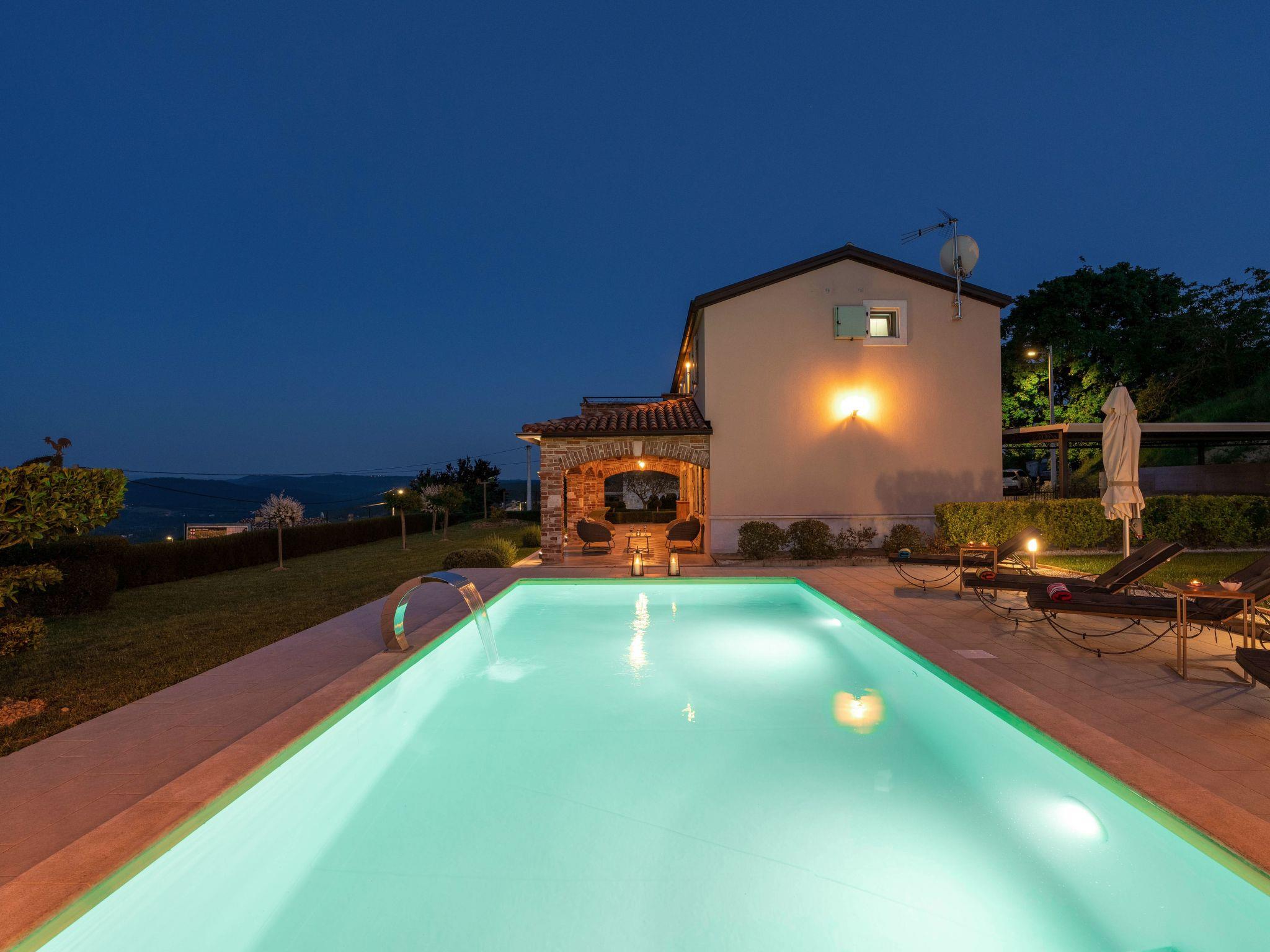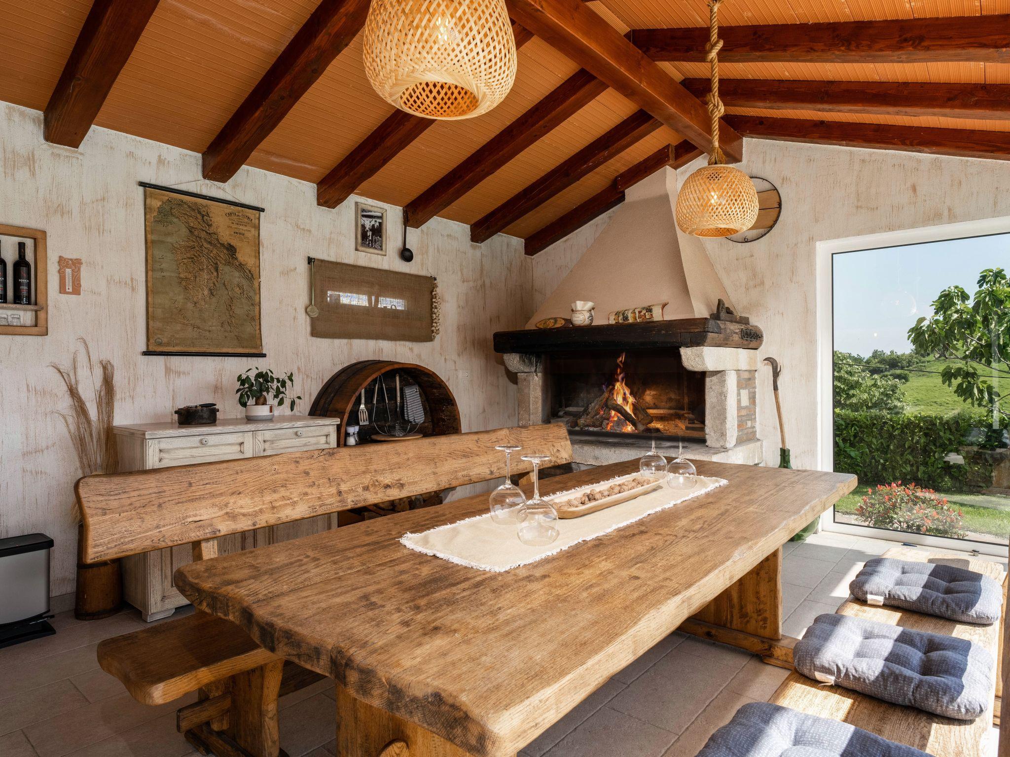 This beautiful holiday home with a swimming pool covers a total of 100m2 living area on two air-conditioned floors. On the ground floor there is a living area with a fully equipped kitchen, a dining table, living room, and a separate toilet. At the entrance to the house, there is a nice covered terrace with lounge furniture and a beautiful view. On the first floor there is one bedroom with a double bed, two single rooms and a bathroom with a shower/toilet. One room leads to a spacious balcony with seating, from which there is a wonderful view of Motovun and the green landscape.