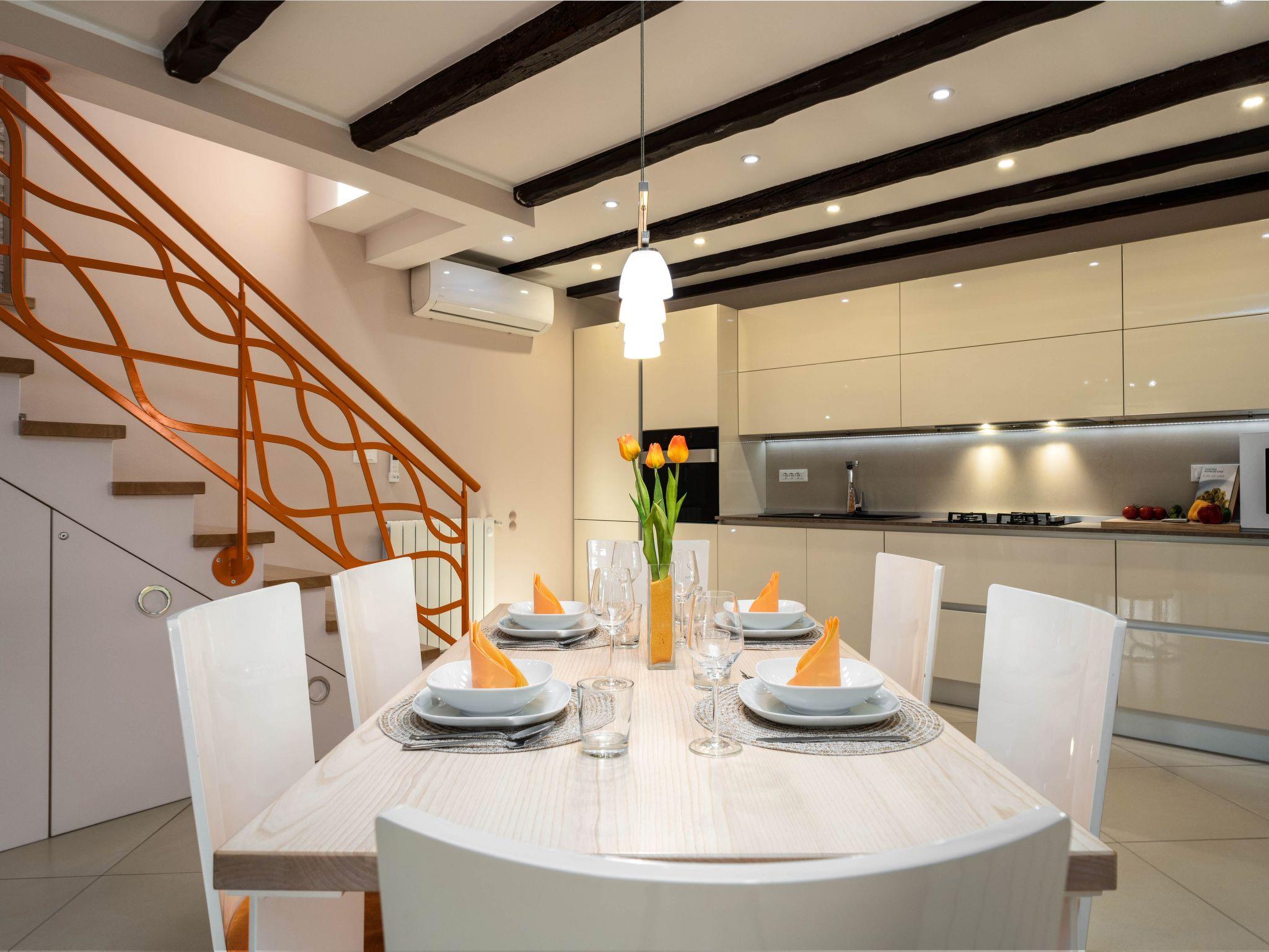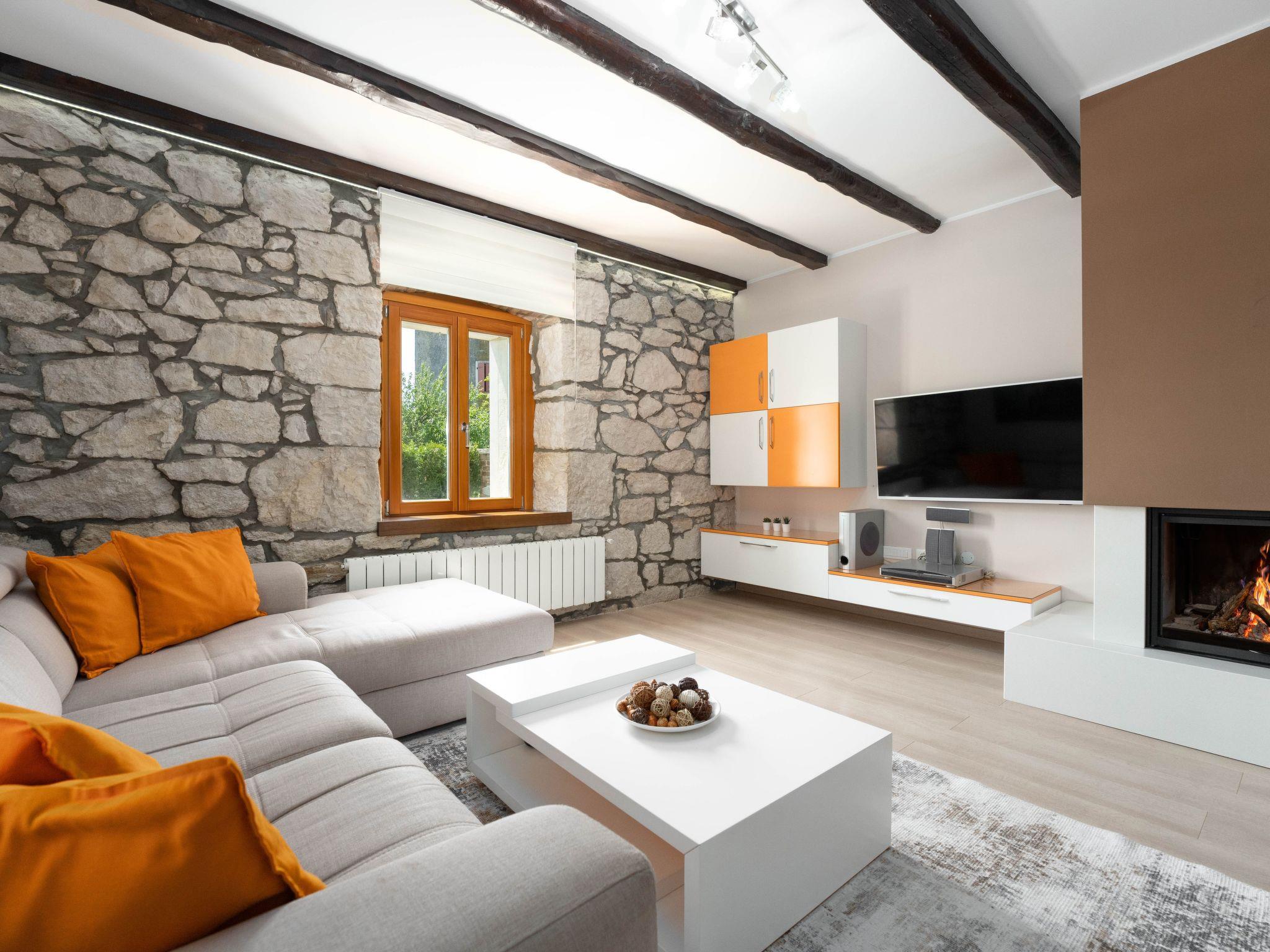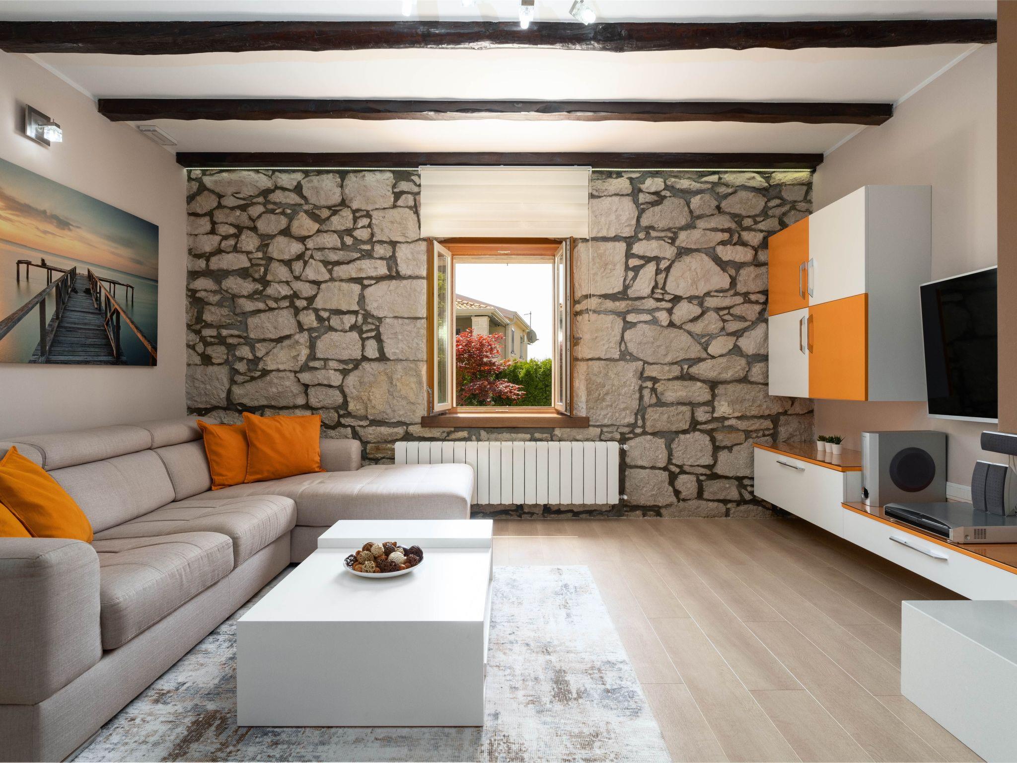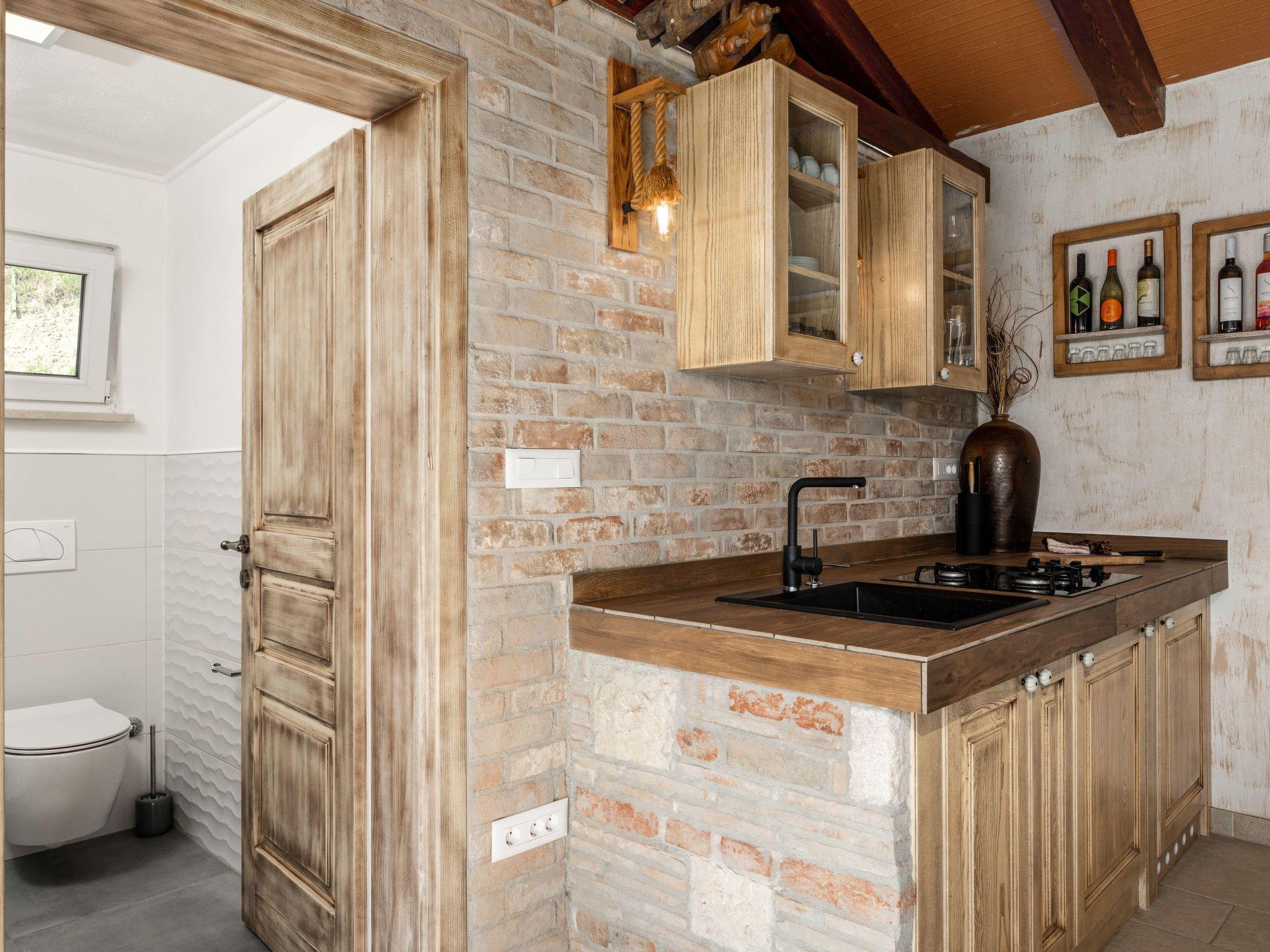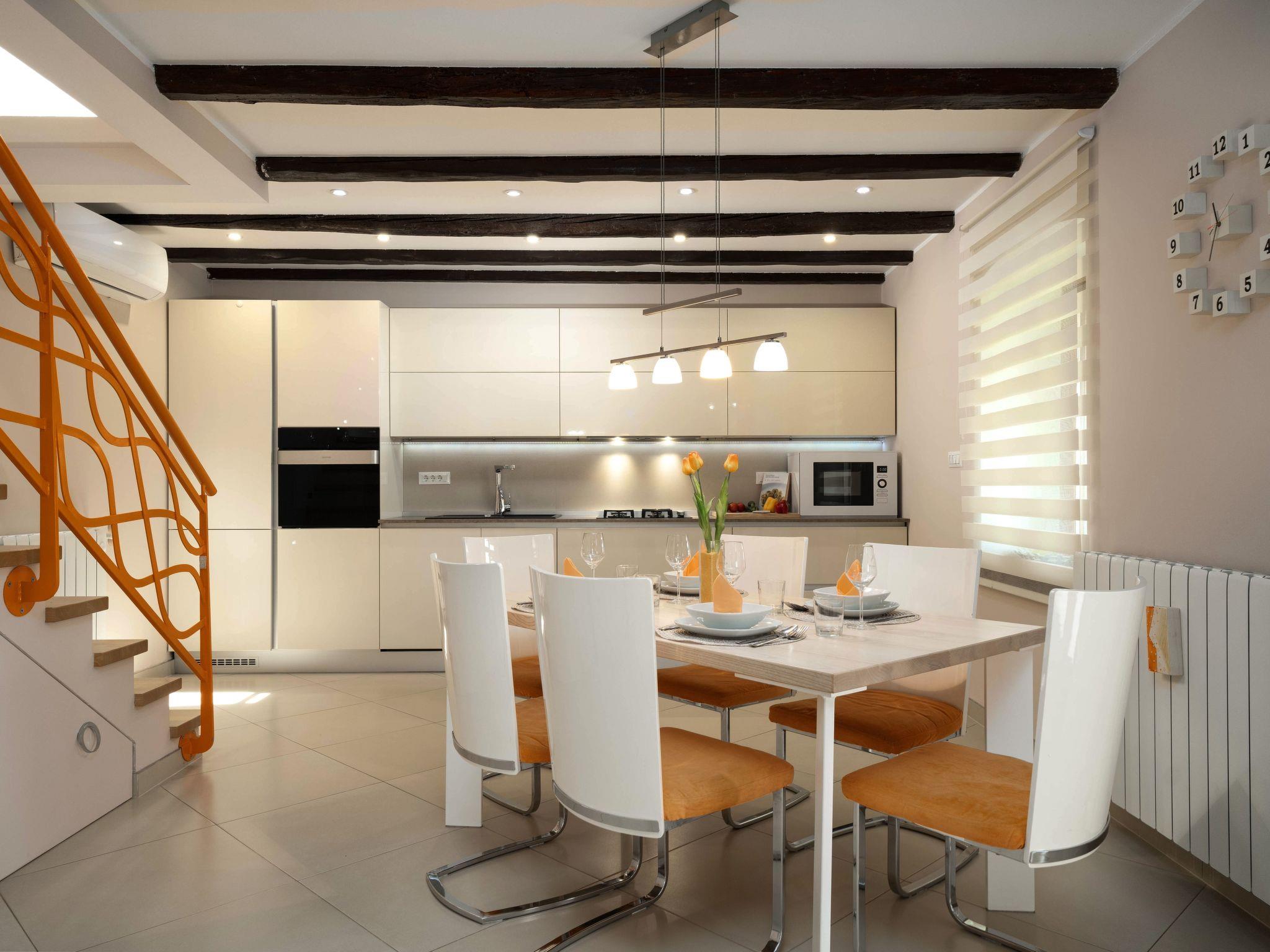 This beautiful holiday home with a swimming pool covers a total of 100m2 living area on two air-conditioned floors. On the ground floor there is a living area with a fully equipped kitchen, a dining table, living room, and a separate toilet. At the entrance to the house, there is a nice covered terrace with lounge furniture and a beautiful view. On the first floor there is one bedroom with a double bed, two single rooms and a bathroom with a shower/toilet. One room leads to a spacious balcony with seating, from which there is a wonderful view of Motovun and the green landscape.