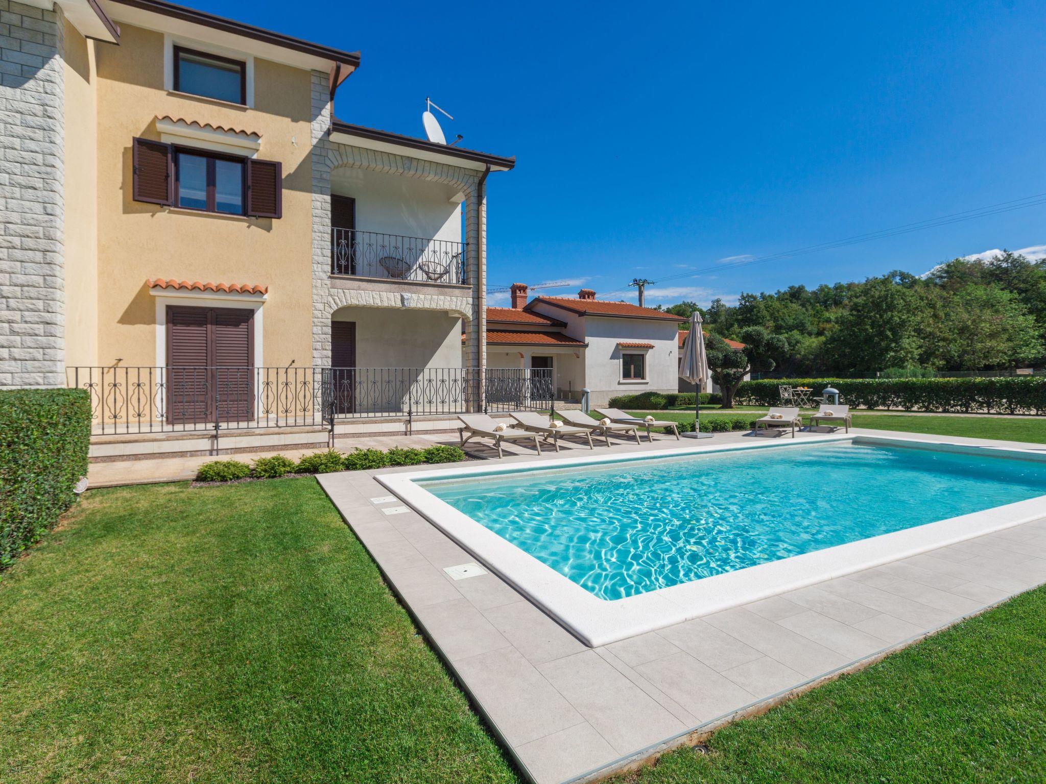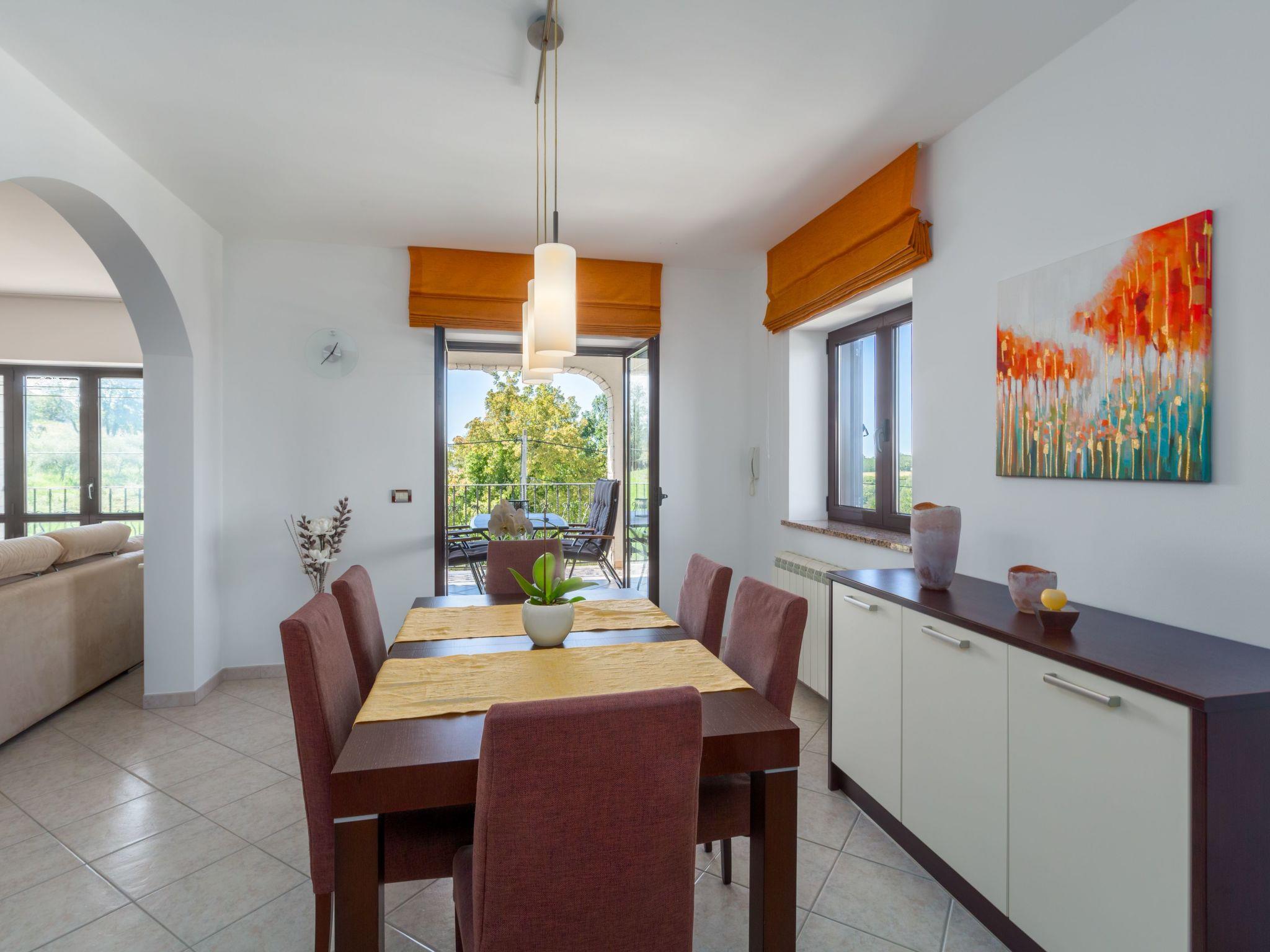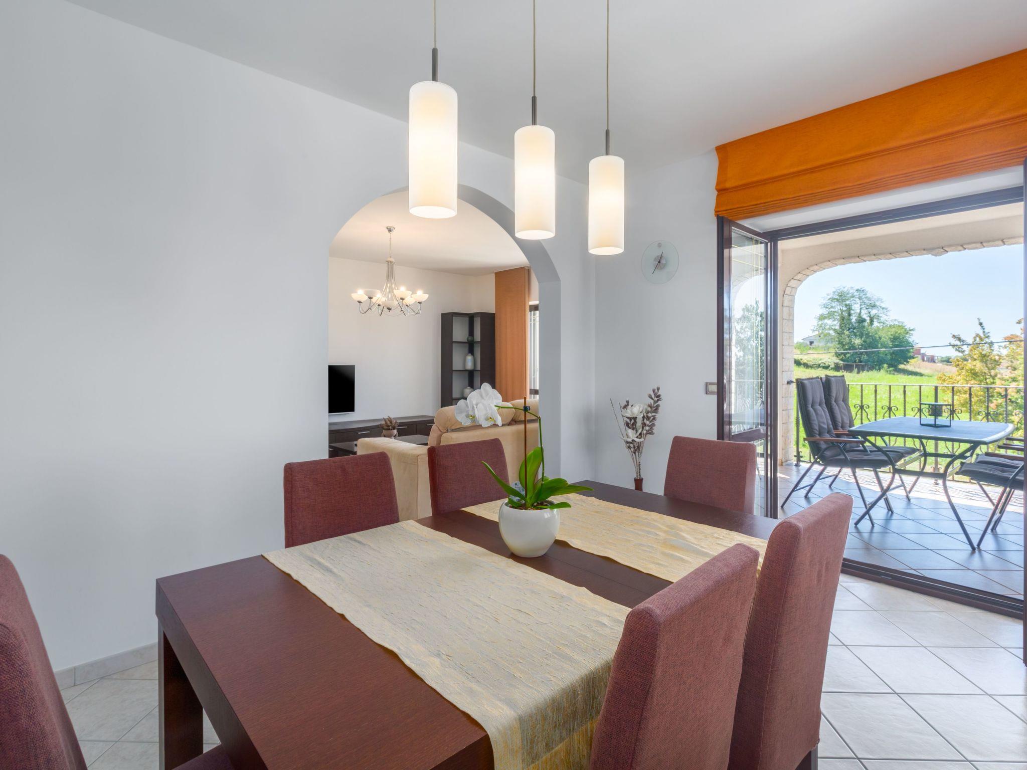 This beautiful detached house with pool is located on a hill with stunning panoramic views of the wooded hills and vineyards. It is located on the edge of the village of Mekisi 4km from the picturesque medieval town of Vizinada, where there is a shop, cafe, ATM, while a farm is just 300m from the house. There are several wineries in the neighbourhood and the attractive Parenzana cycling/hiking trail runs nearby.