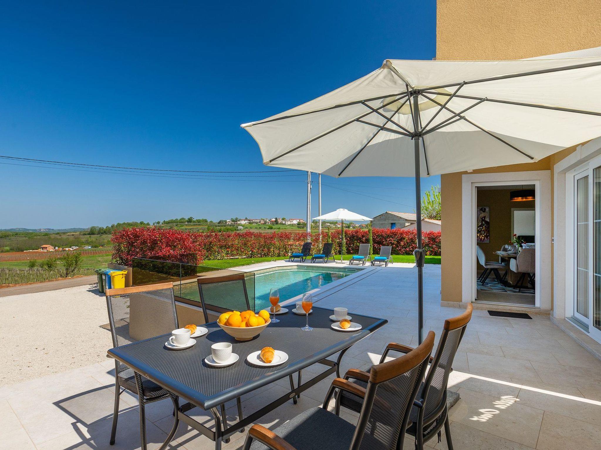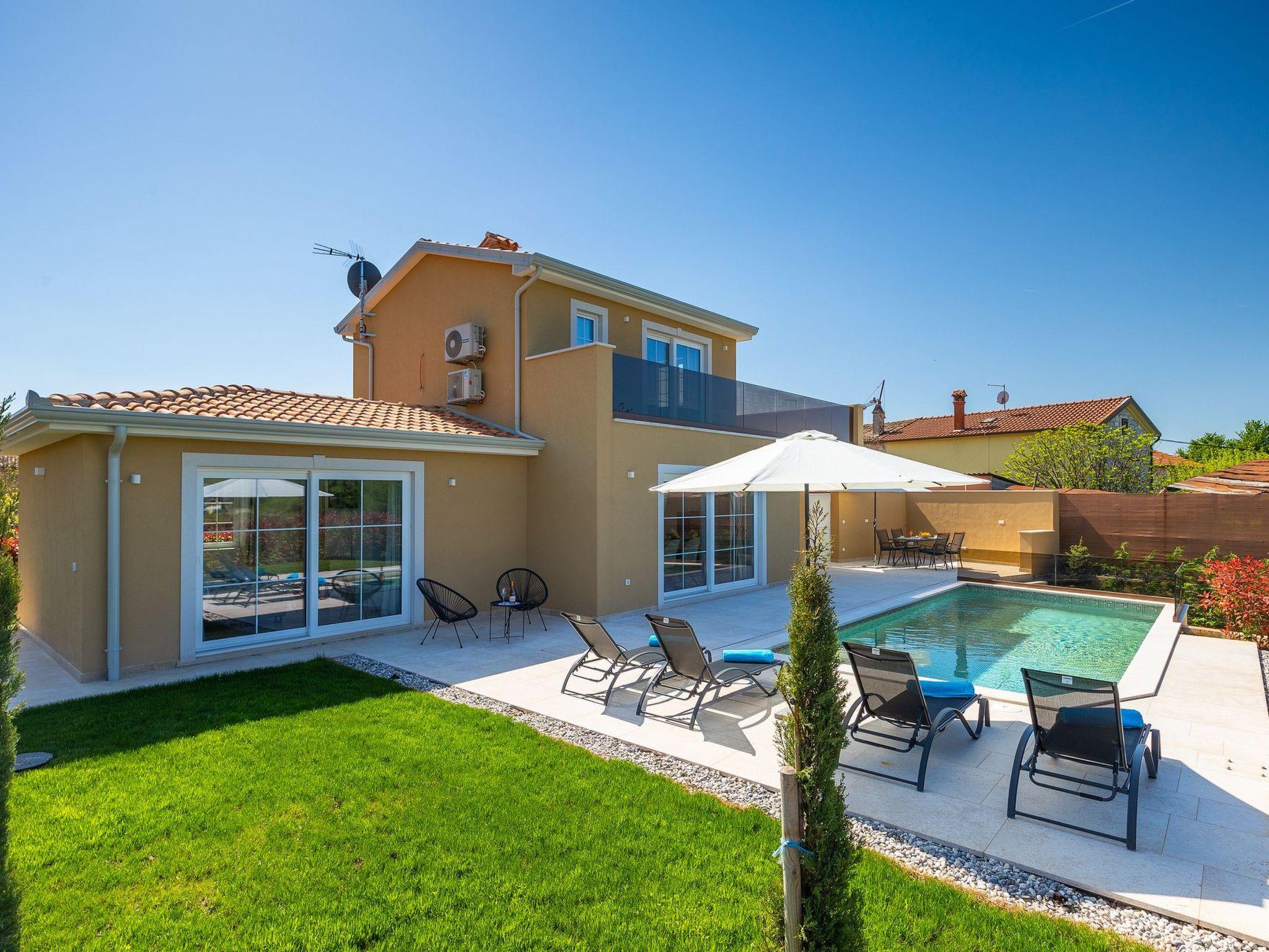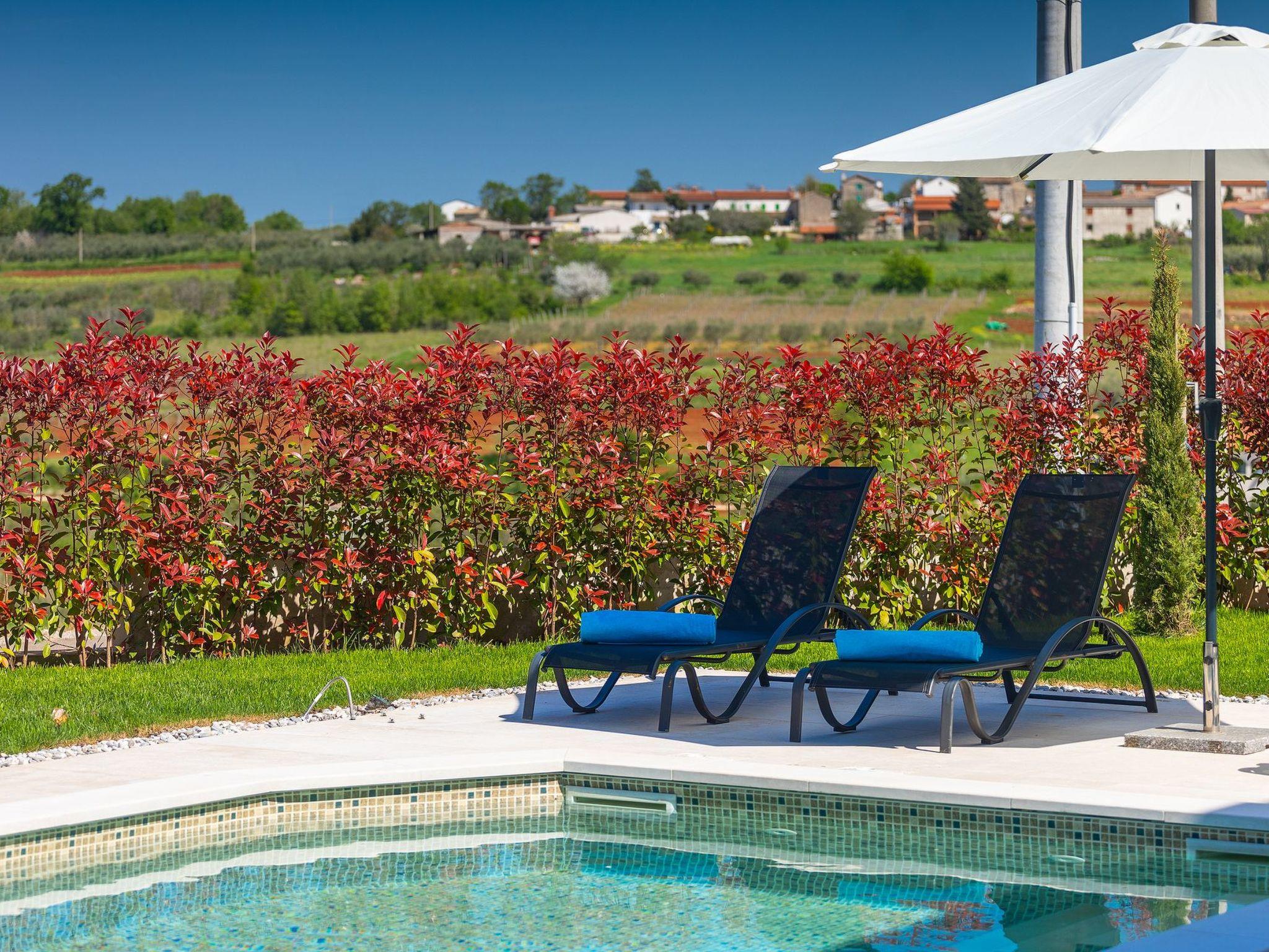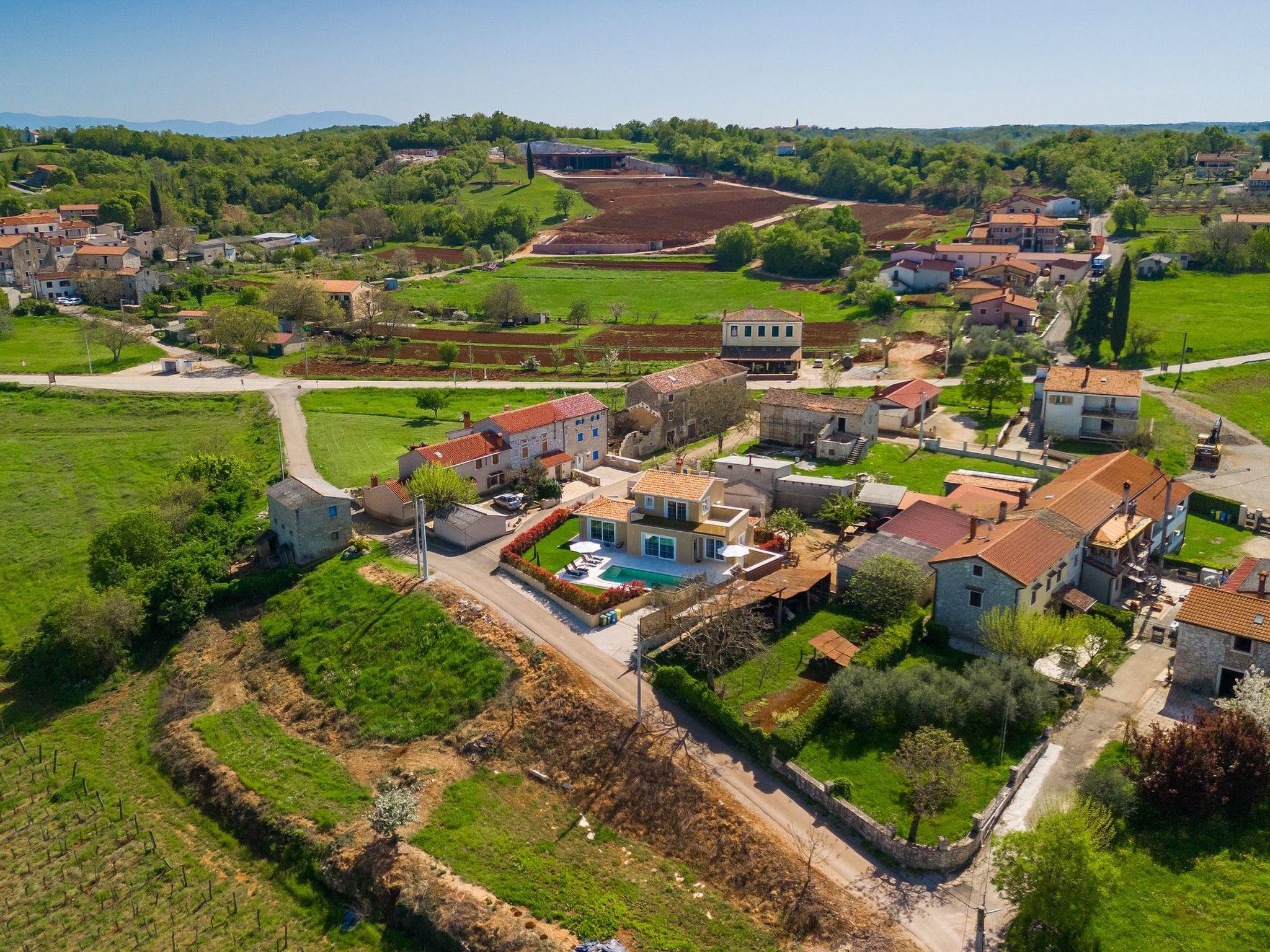 Villa Marilena is a newly built holiday home with a pool and a beautiful panoramic view. The agrotourism Mekiši with a rich gastronomic offer of Istrian specialities is only 800 m away and in Vižinada, 2 km away, there is the nearest shop, coffee bar and ATM. For lovers of active holidays, there is an attractive hiking and cycling trail Parenzana nearby, as well as several well-known wine cellars. It is only 20 minutes by car from Porec and the nearest beach. The house is situated on a partially fenced garden plot of 250 m² with manicured lawn and flowers, a 32 m² pool and sun loungers. Next to the pool there is a lovely terrace with dining table and barbecue as well as 2 parking spaces.