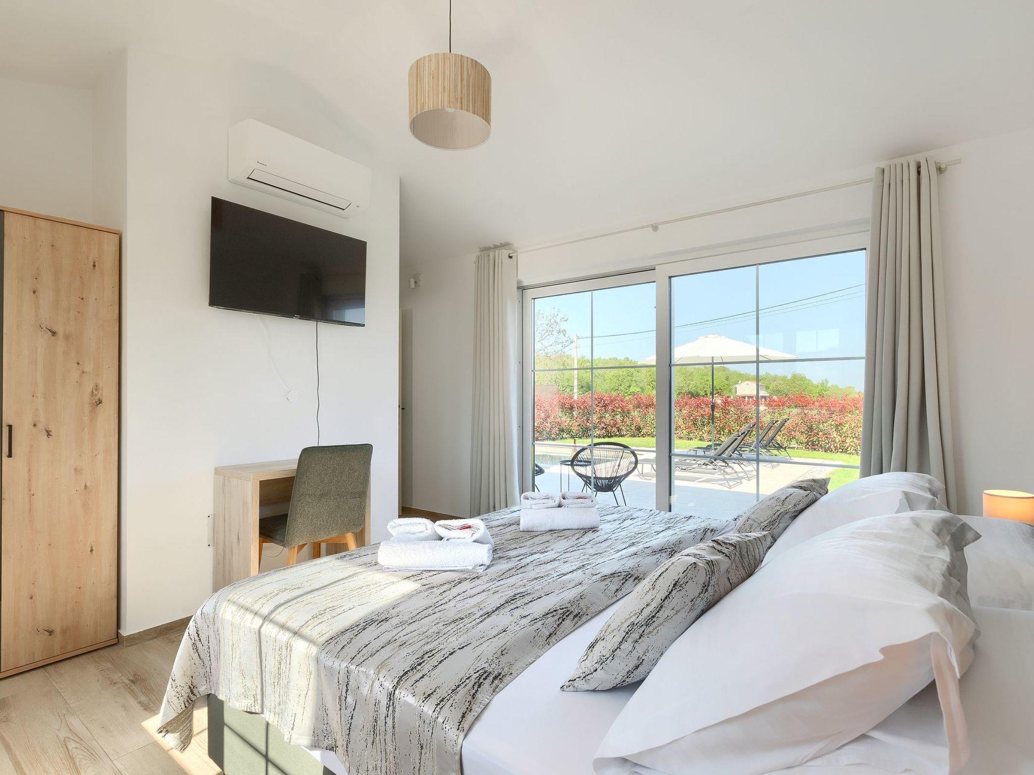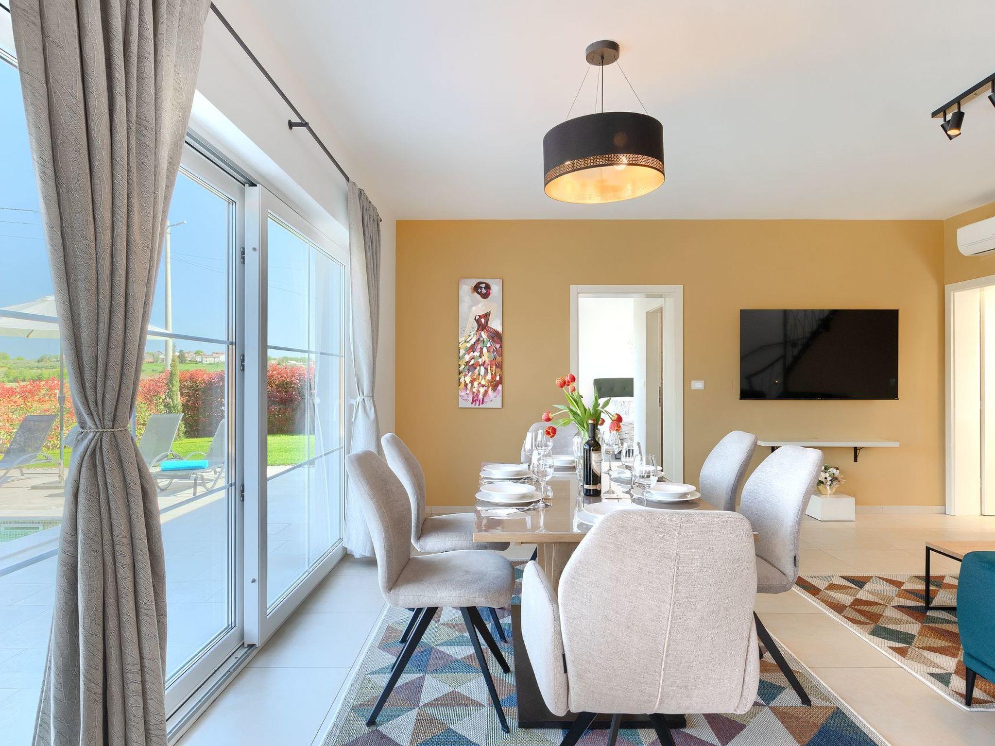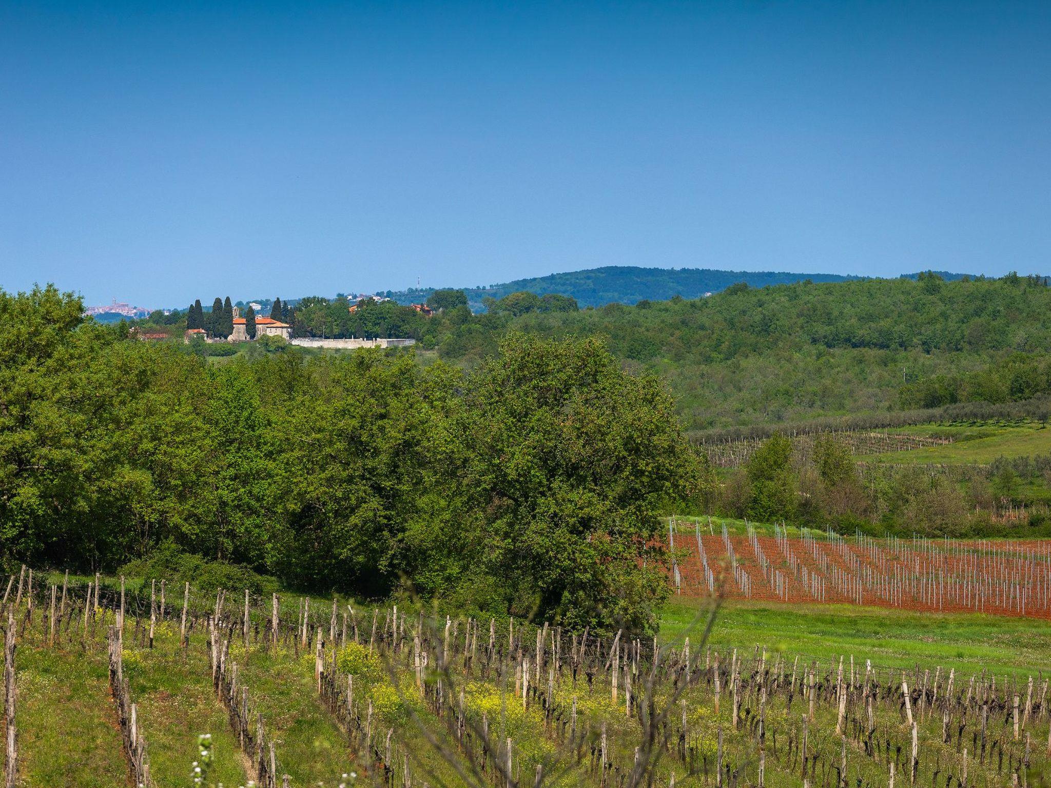 Villa Marilena is a newly built holiday home with a pool and a beautiful panoramic view. The agrotourism Mekiši with a rich gastronomic offer of Istrian specialities is only 800 m away and in Vižinada, 2 km away, there is the nearest shop, coffee bar and ATM. For lovers of active holidays, there is an attractive hiking and cycling trail Parenzana nearby, as well as several well-known wine cellars. It is only 20 minutes by car from Porec and the nearest beach. The house is situated on a partially fenced garden plot of 250 m² with manicured lawn and flowers, a 32 m² pool and sun loungers. Next to the pool there is a lovely terrace with dining table and barbecue as well as 2 parking spaces.