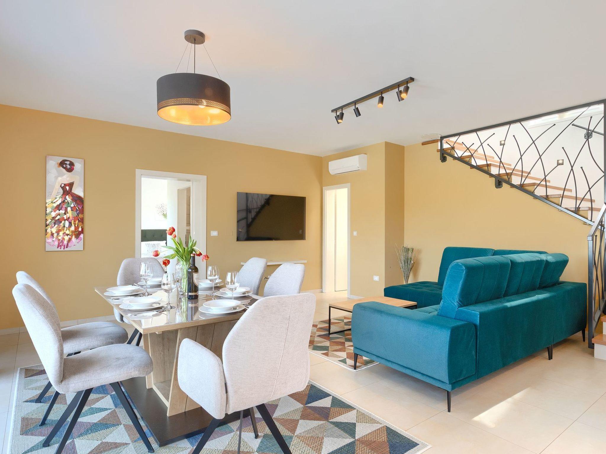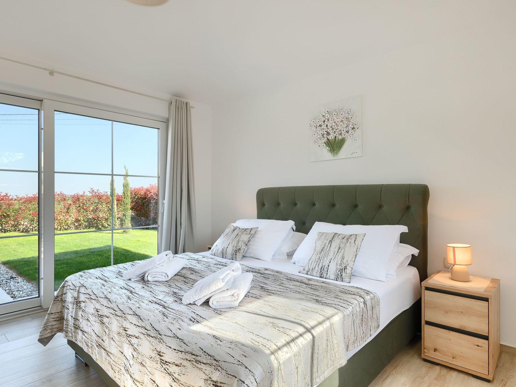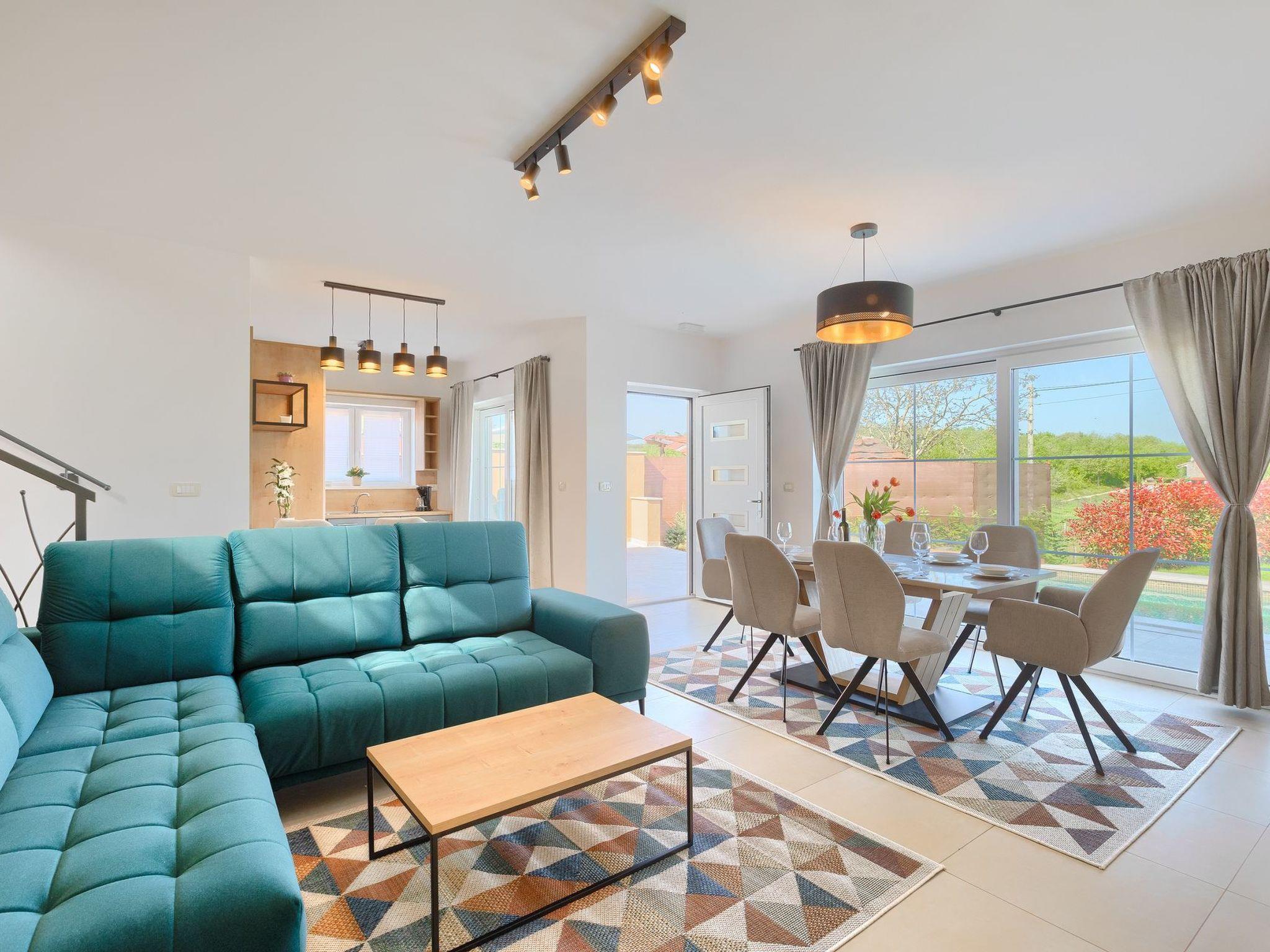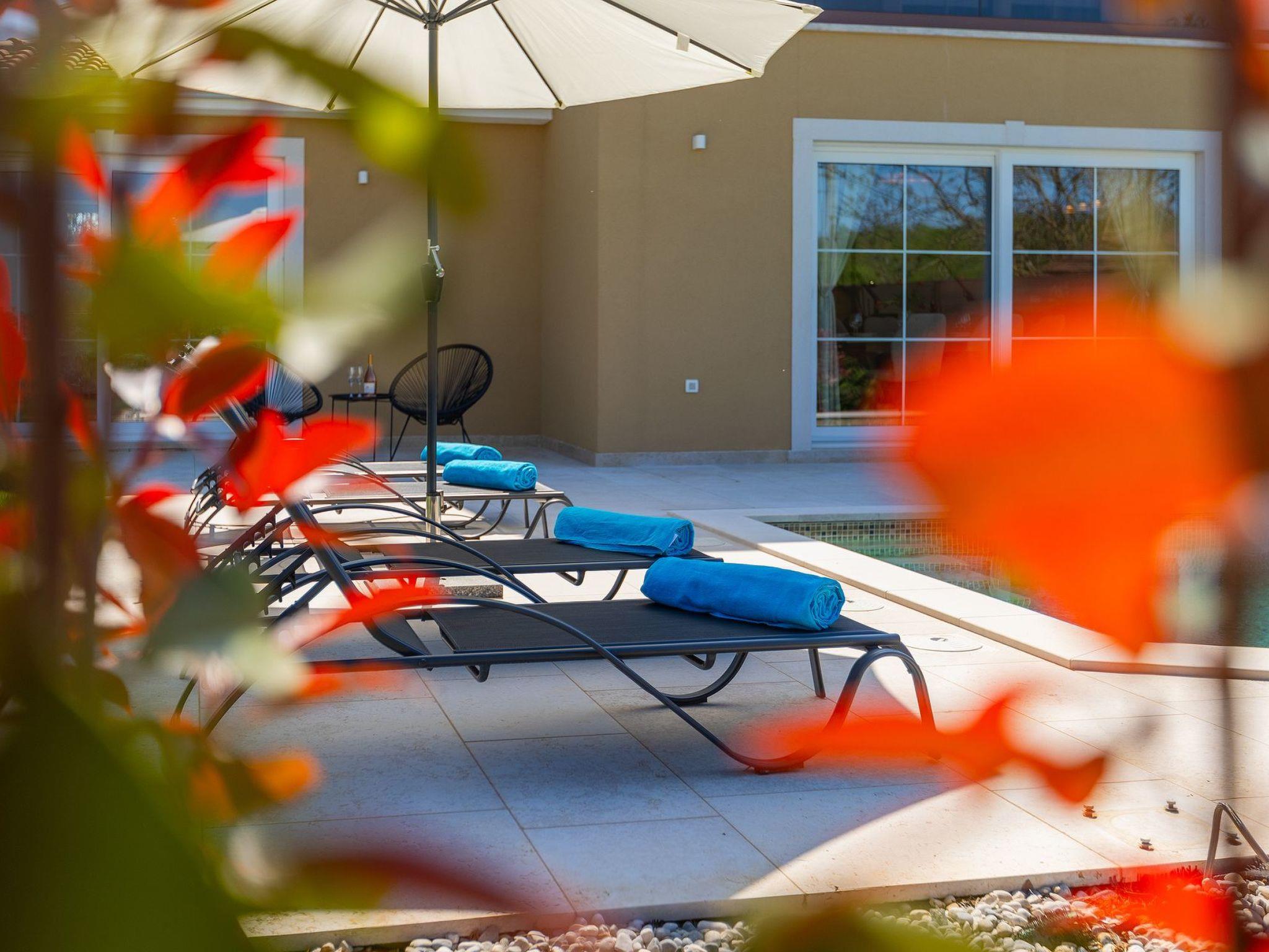 Villa Marilena is a newly built holiday home with a pool and a beautiful panoramic view. The agrotourism Mekiši with a rich gastronomic offer of Istrian specialities is only 800 m away and in Vižinada, 2 km away, there is the nearest shop, coffee bar and ATM. For lovers of active holidays, there is an attractive hiking and cycling trail Parenzana nearby, as well as several well-known wine cellars. It is only 20 minutes by car from Porec and the nearest beach. The house is situated on a partially fenced garden plot of 250 m² with manicured lawn and flowers, a 32 m² pool and sun loungers. Next to the pool there is a lovely terrace with dining table and barbecue as well as 2 parking spaces.