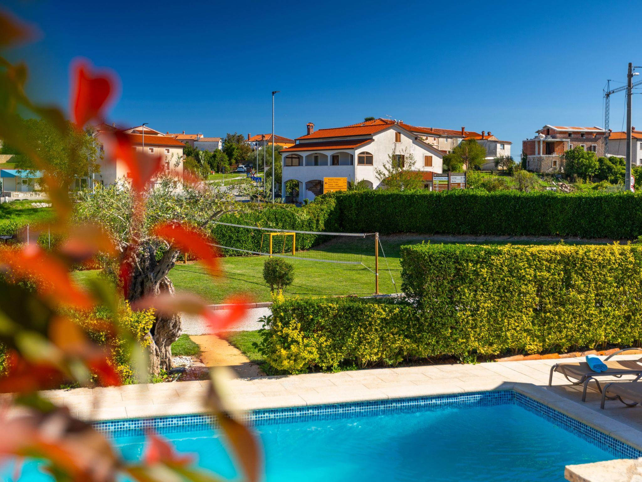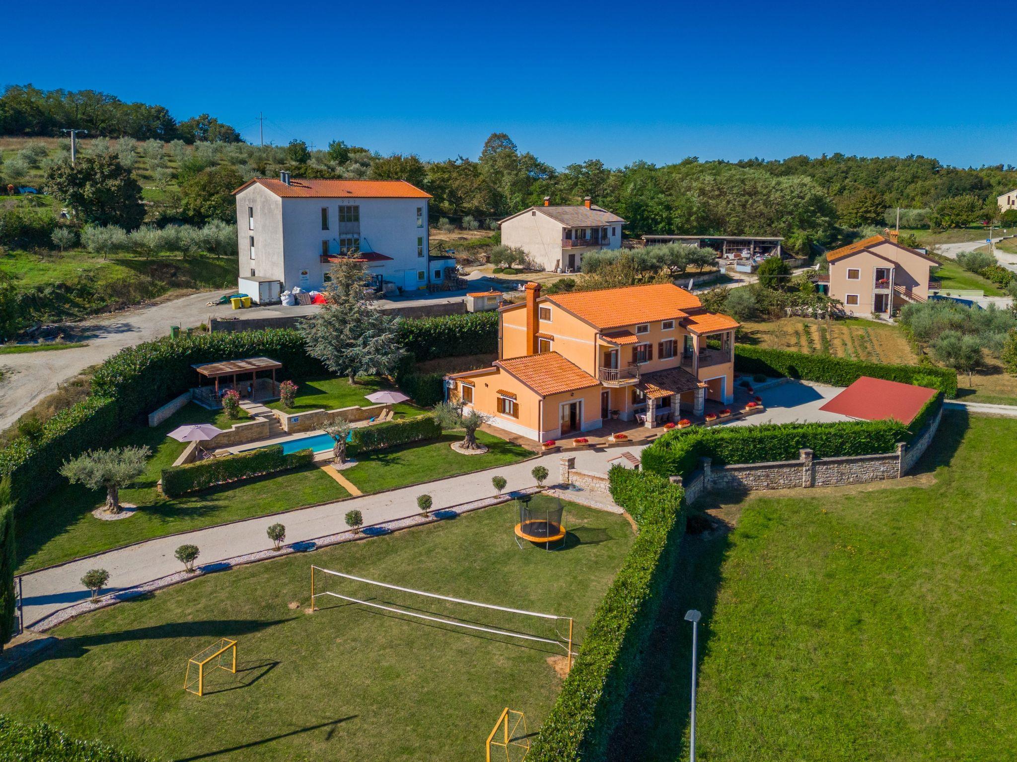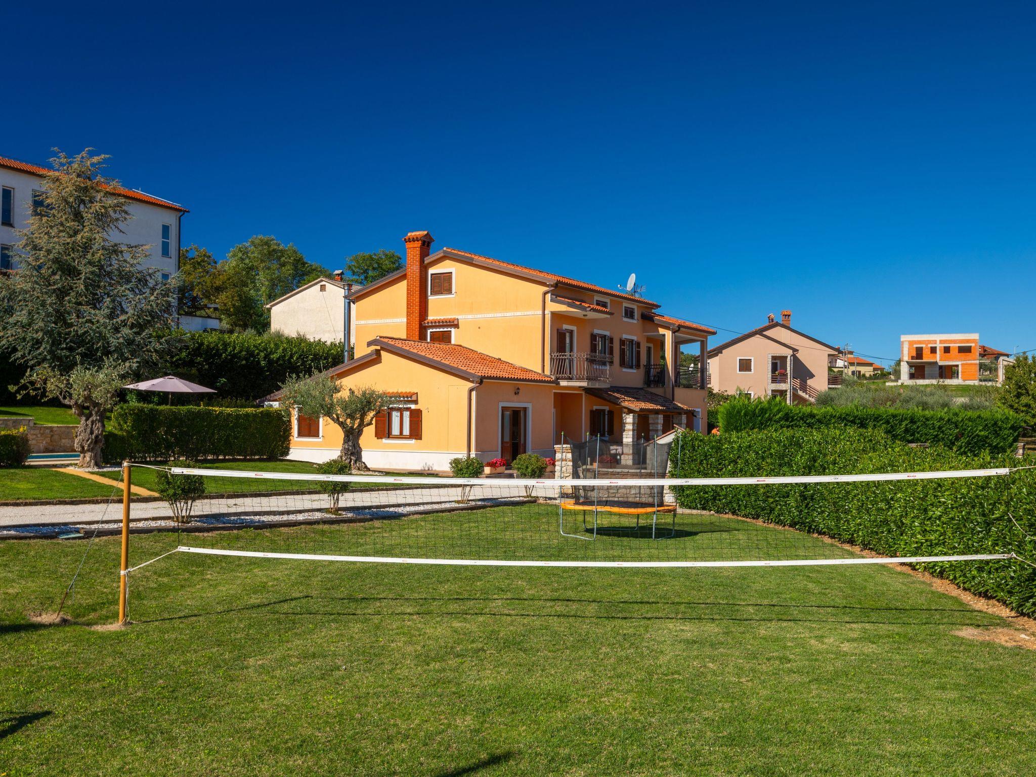 The house is located on a completely fenced garden of 2000 m² ,with a well-kept lawn and flowers, and guests have at their disposal a 32 m² swimming pool, sun loungers, barbecue and a beautiful covered terrace with garden furniture, as well as several covered parking spaces. There is also a volleyball court, football (small) and a trampoline.