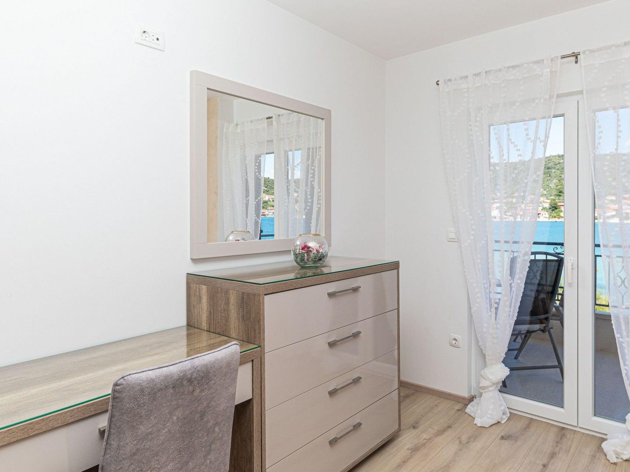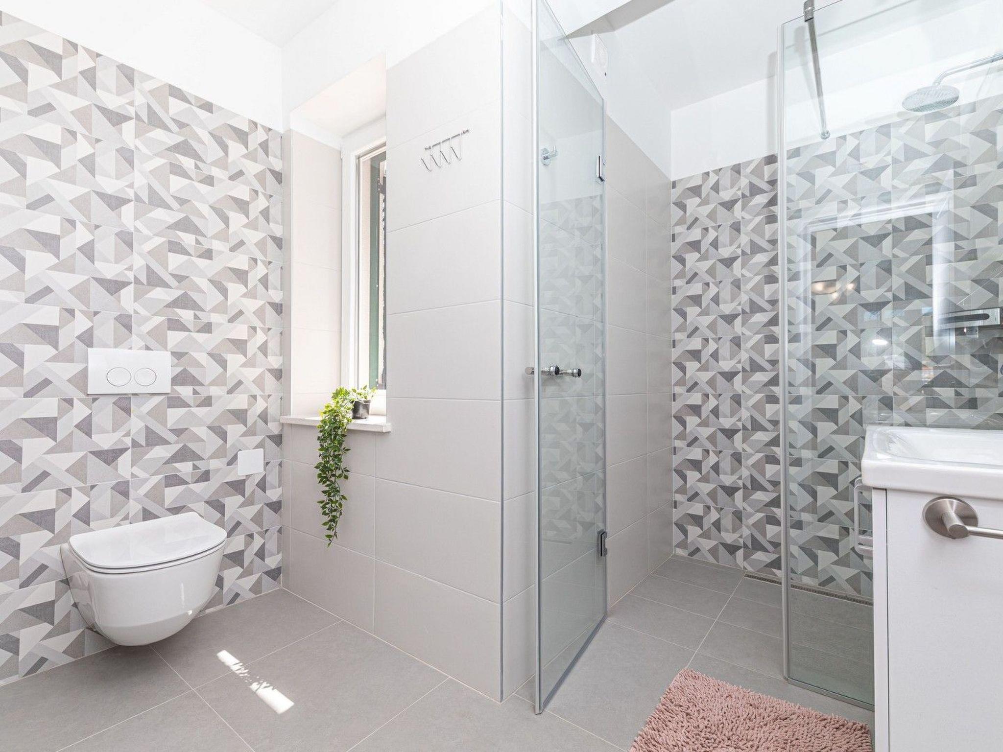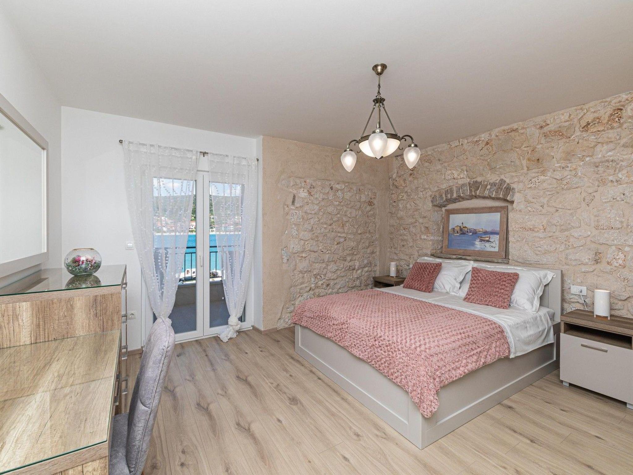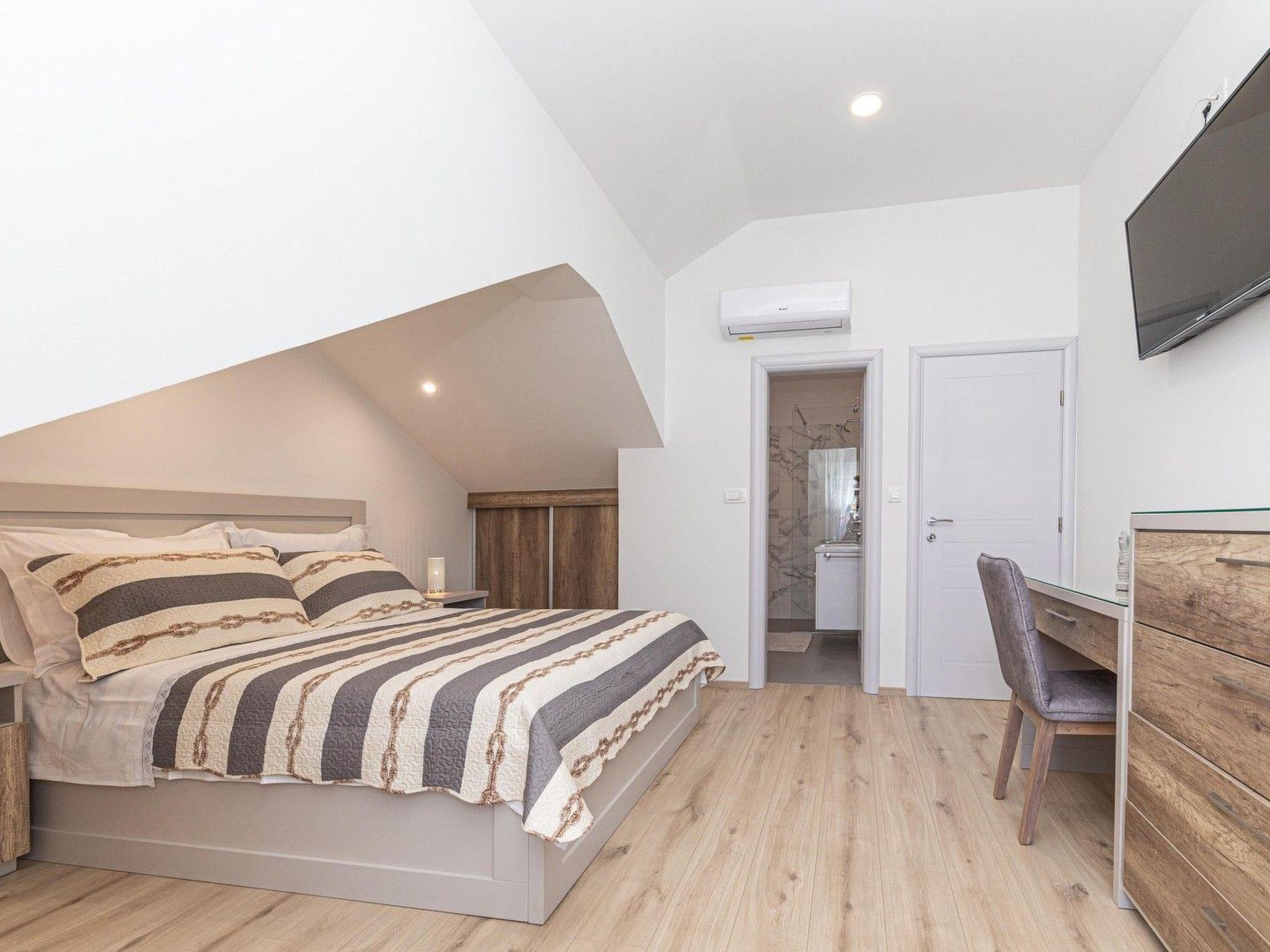 Villa Nina spreads on 240 m2 divided on the ground floor, first floor and high attic levels. It consists of 4 bedrooms, 5 bathrooms and can comfortably accommodate up to 8 persons. Carefully designed interior rich with warm tones creates the ambience of a comfortable and authentic dalmatian home where every guest feels welcome. Ground floor consists of a spacious open concept living room, fully equipped kitchen with dining area and 1 bathroom with shower. Ground floor has access to a spacious covered terrace with an outdoor table where guests can dine al fresco while enjoying the breathtaking sea viewUpper floors are designed as a resting area with 2 air conditioned bedrooms with queen size double beds (160 x 200 cm) located on the first floor, while the remaining 2 bedrooms – one with a queen size double bed (160 x 200 cm) and one with 2 single beds (90 x 200 cm) which can be pulled together if necessary – are located on the high attic. Each bedroom has an en suite bathroom with a shower and access to a seaview balcony equipped with an outdoor table and chairs which is shared with the other bedroom on the floor, perfect for sipping coffee in the morning while admiring the crystal clear sea of Vinišce bay.