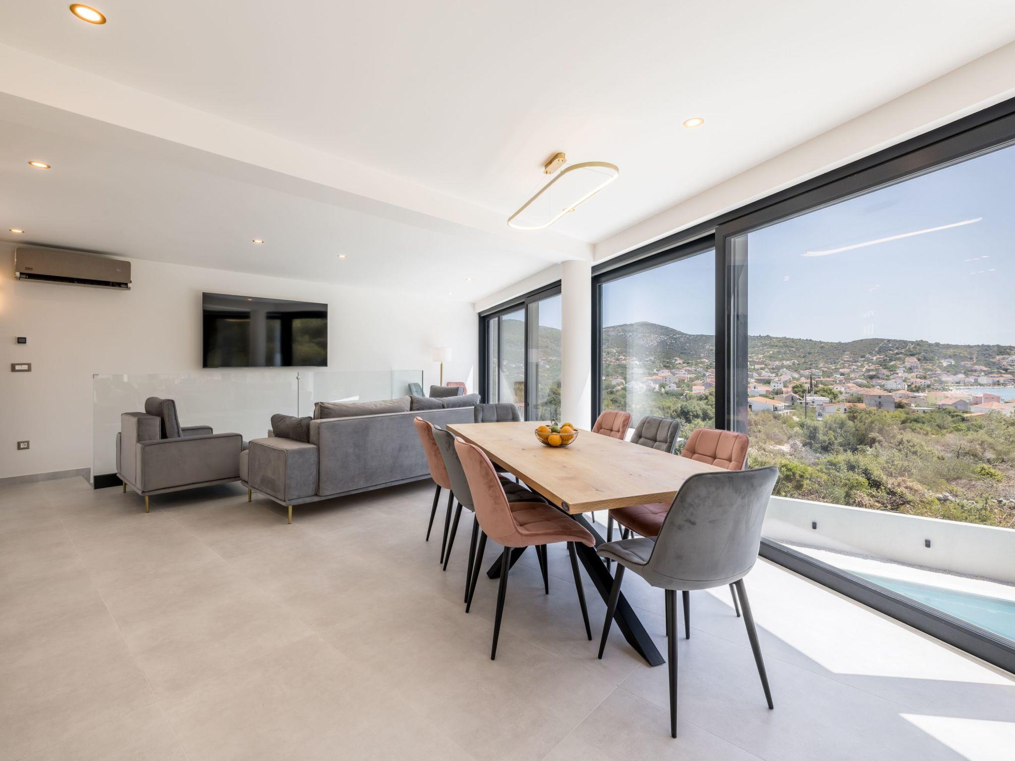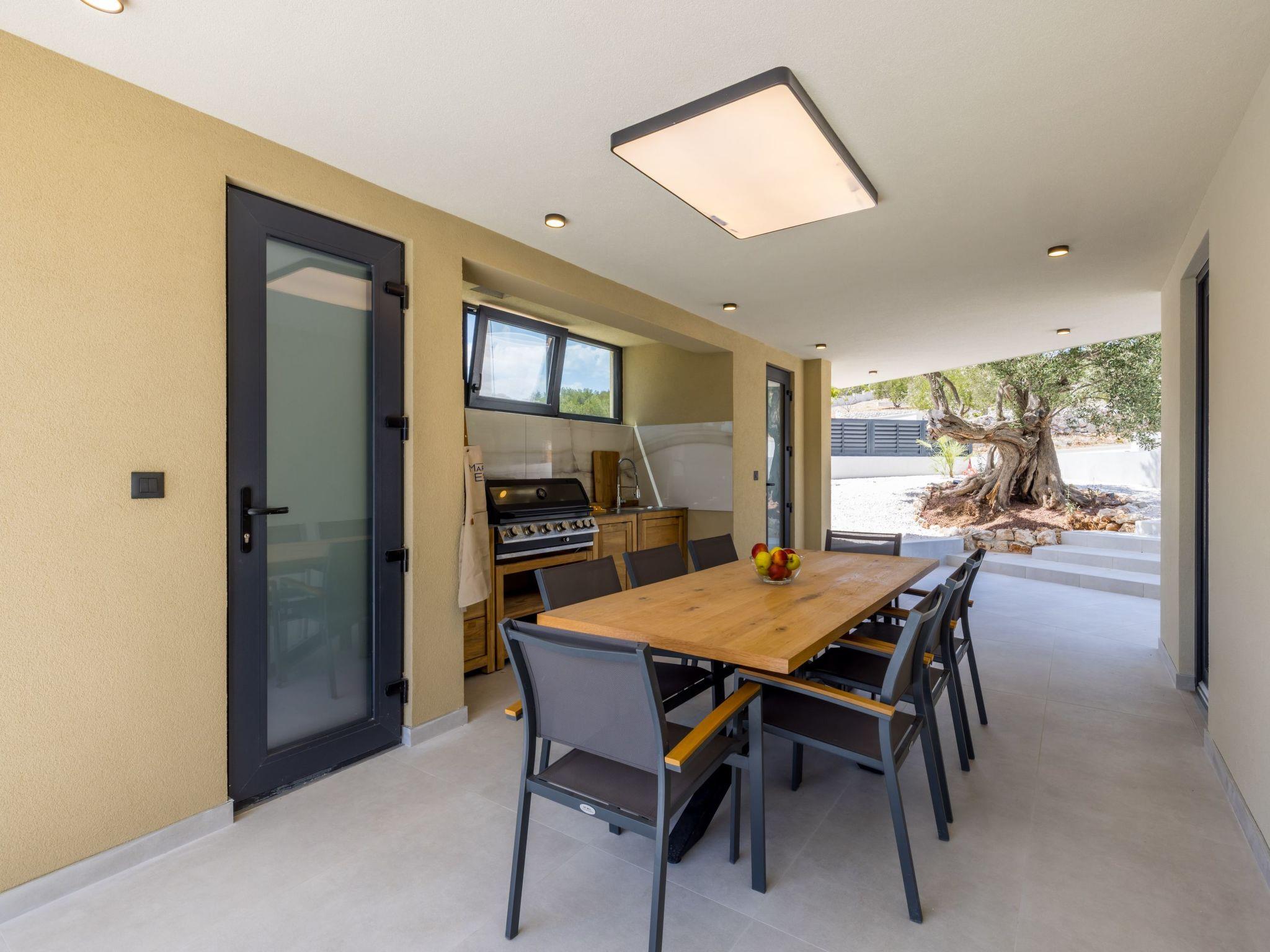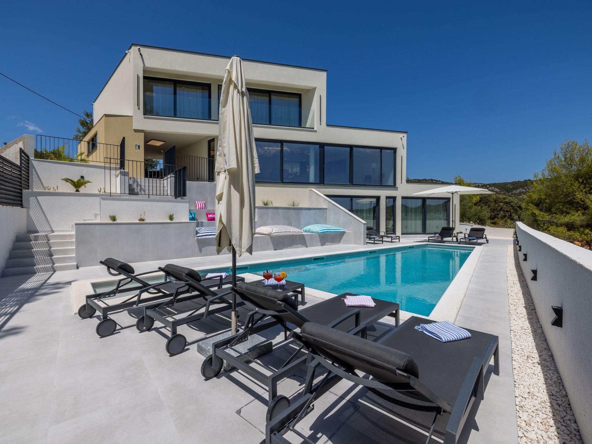 The outdoor area of this property is equally inviting, featuring a covered kitchen with gas grill, and a large pool with ample lounge area, for your sole use. The villa is completely fenced in, making it a safe haven for your small dogs. The presence of a balcony for the two upstairs bedrooms further enhances your outdoor living experience, allowing you to enjoy the fresh Dalmatian air in privacy.