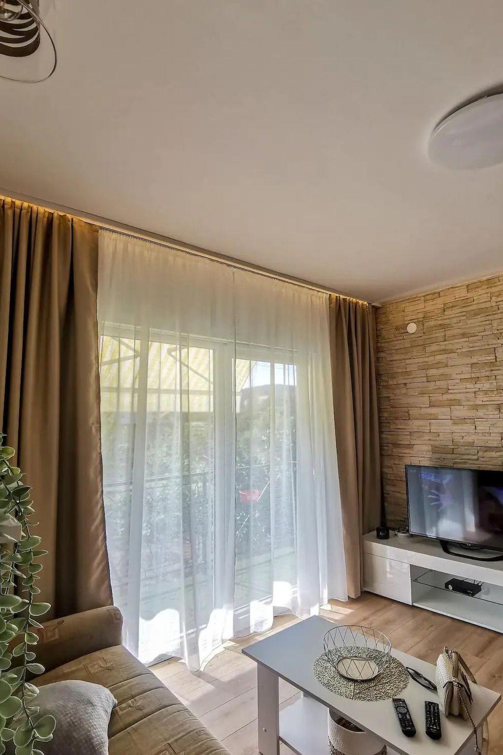 There is 1.floor and Ground floor ,1.floor is still in making so Ground floor is only being used for living. 2 Rooms .1. room(Double room, double bed , additional bed, carpet) 2.room(Triple bed , separate beds, carpet. table and chairs for every person , kitchen utensils, pots, cutlery, etc . provided, dish clothes, electric cooker and gas, number of rings: 4, oven, refrigerator and freezer, coffee machine, bathroom with toilet , shower+ extra 1 more toilet. dining room , living room and kitchen are one room ; one additional option for sleeping on the couch ; paved