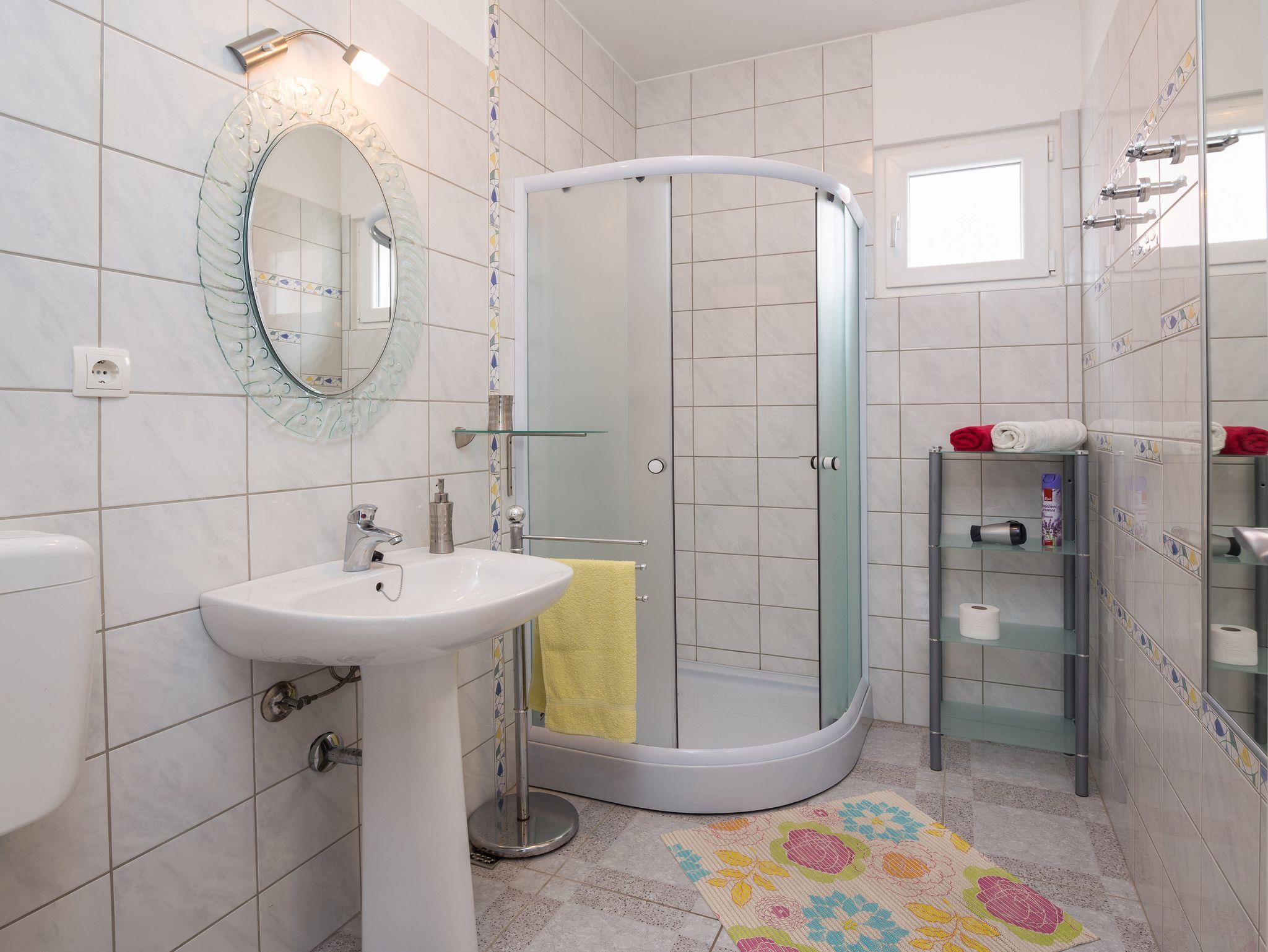 Ferienwohnung bietet Platz für 5 Gäste. Die Betten sind in Schlafzimmern, die es 1 gibt, und in Wohnzimmer, innerhalb einer Gesamtfläche von 46m2, angeordnet. Die Gäste haben eine eigene Terrasse zur Verfügung, auf der sie in warmen Sommernächten genießen können. Das Apartment bietet Meerblick. Es ist erlaubt, Speisen auf dem Gemeinschafts-Grill vorzubereiten. IM PREIS INBEGRIFFEN: Kurtaxe, Endreinigung, Klimatisierung, Parkplatz, Internet, Kinderbett, Bügeleisen, Bügelbrett, Föhn, Sonnenschirm, Liegestühle. VERBINDLICHE ZUSÄTZLICHE KOSTEN: Aufzahlung für Kurzaufenthalte (prozentualer Zuschlag pro Nächtigungsanzahl: 30% - 1, 20% - 2, 10% - 3). UNVERBINDLICHE ZUSÄTZLICHE KOSTEN: Wäschewaschen (10,00 € Waschen). Die Verfügbarkeit zusätzlicher Dienstleistungen in Ihrem reservierten Termin und die Preise derselben (falls nicht aufgeführt) müssen im Voraus überprüft werden. Zusätzliche Dienstleistungen die in der Zahlungsaufforderung nicht aufgeführt sind werden direkt beim Vermieter bezahlt, angenommen der Gast nutzt auch diese. Ermäßigung auf den Grundpreis: Gratistag 21=19 (bei einem Aufenthalt von 21 Tagen oder mehr erhalten Sie 2 Gratistage für den Aufenthalt bis 31.12.26).