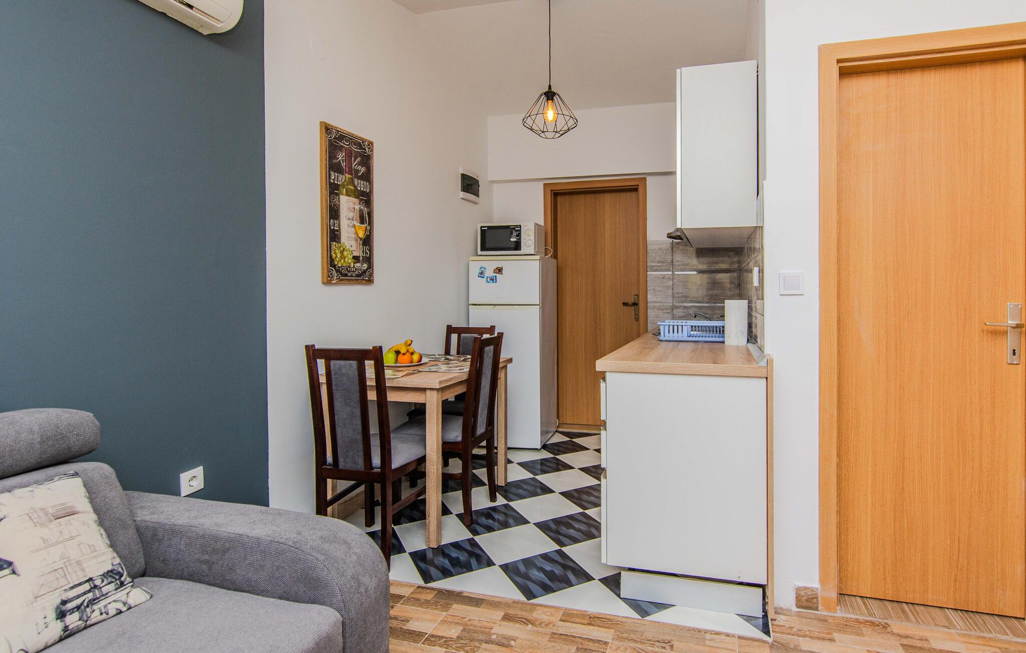 Tilbring ferien i en afslappet ø-atmosfære og nyd et behageligt ophold i denne funktionelle ferielejlighed. Gør det behageligt i det lyse køkken og brug spisebordet til fælles måltider eller til at begynde dagene med frisk kaffe. Lejligheden har også en lille opholdsstue med et tv, hvor man kan slappe af.