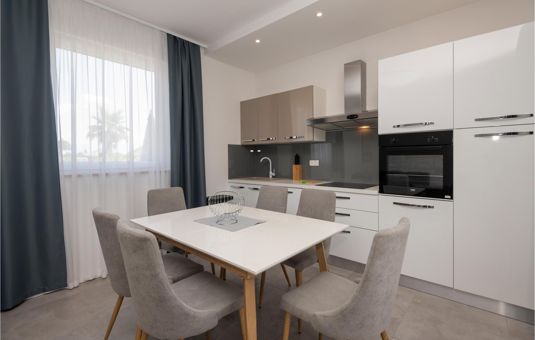Det består af et køkken, en spisestue og to soveværelser, hver med eget badeværelse og ekstra toilet.
