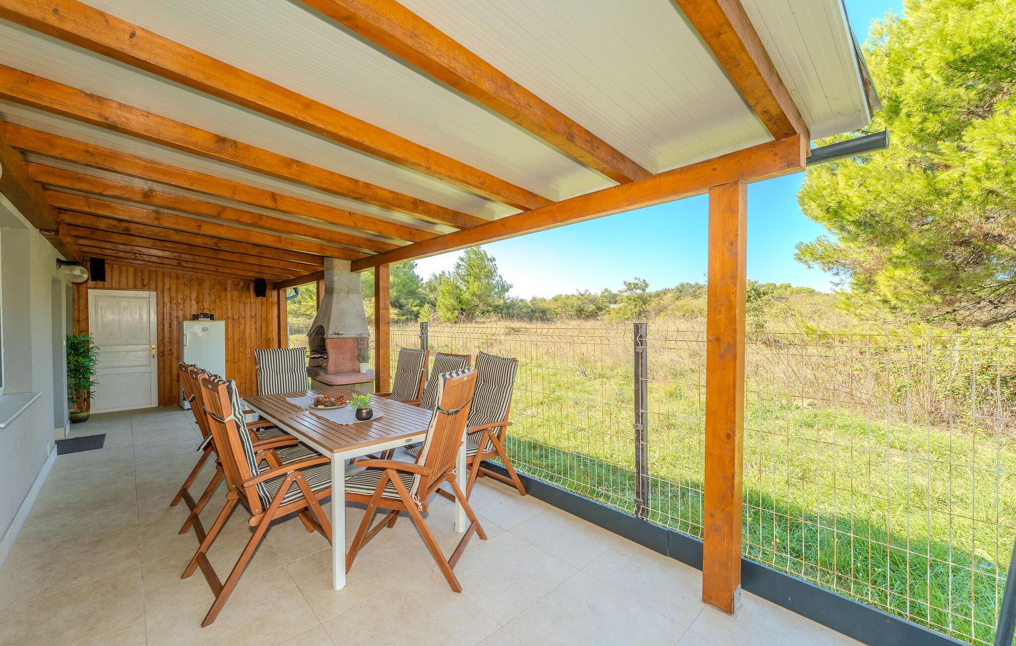 Udenfor byder en stor, overdækket terrasse jer velkommen, hvor I kan nyde morgenmaden med udsigt over de frodige grønne områder og være vært for stemningsfulde grillaftener.