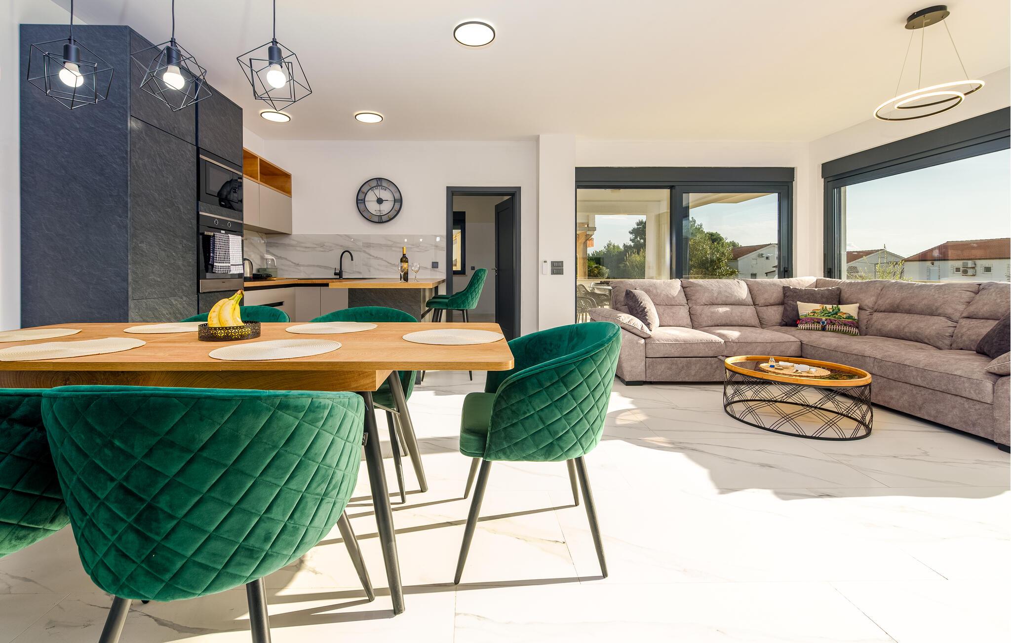 Dette hus forener harmonisk stil, komfort og hygge. Kombinationen af ??dæmpet grønt, varmt træ og lyse vægge skaber en atmosfære, hvor I hurtigt kan skifte til ferietilstand og lade op. Både når I lytter til de seneste hits, nyder en sjov spilleaften eller laver lækre måltider sammen, sætter I selv tempoet for dagen her.