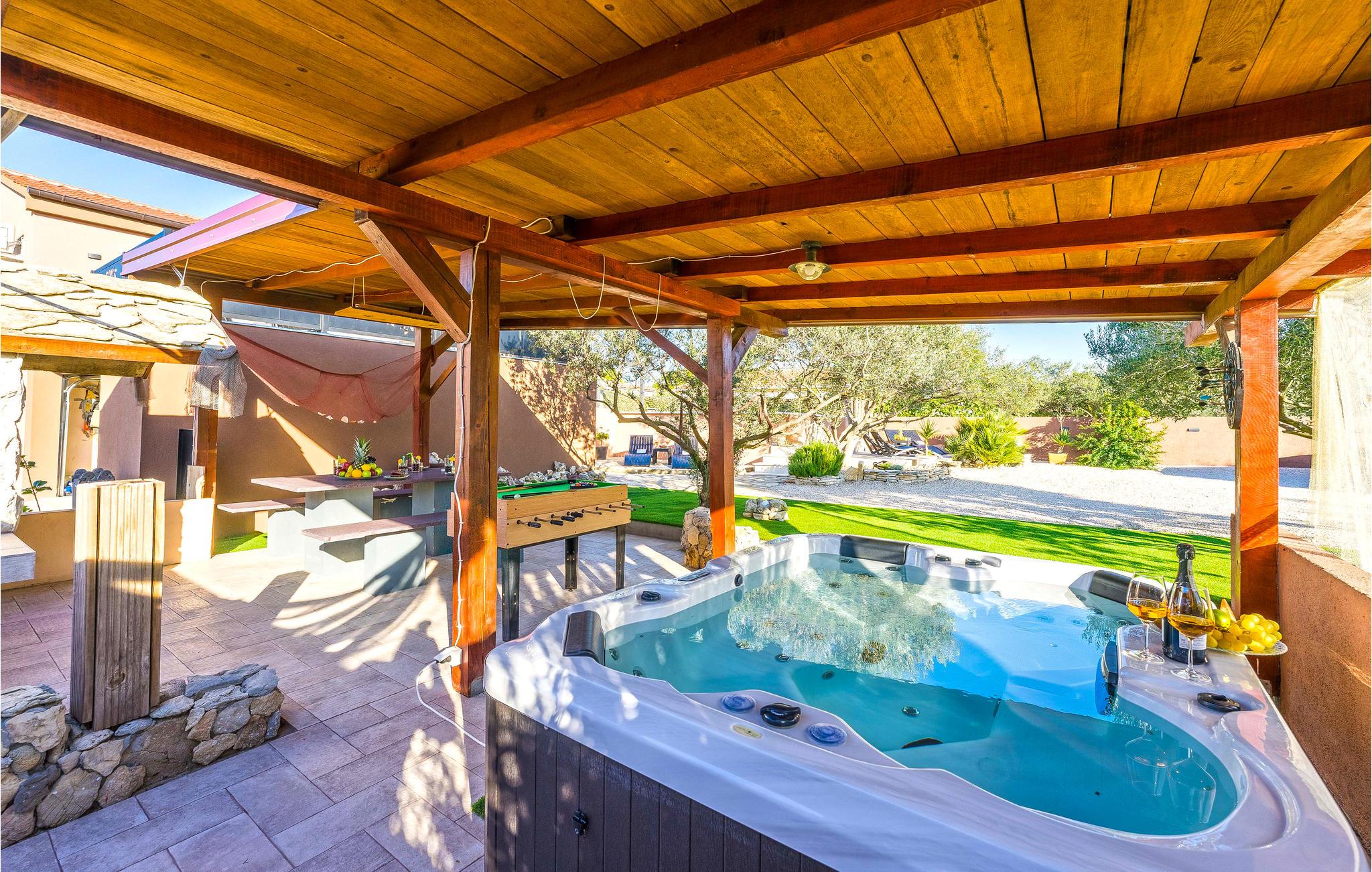 I kan slappe af på terrassen, mens familiens yngste har det sjovt i poolen eller leger i haven. Der er også en grill med en overdækket terrasse til behagelige sammenkomster.