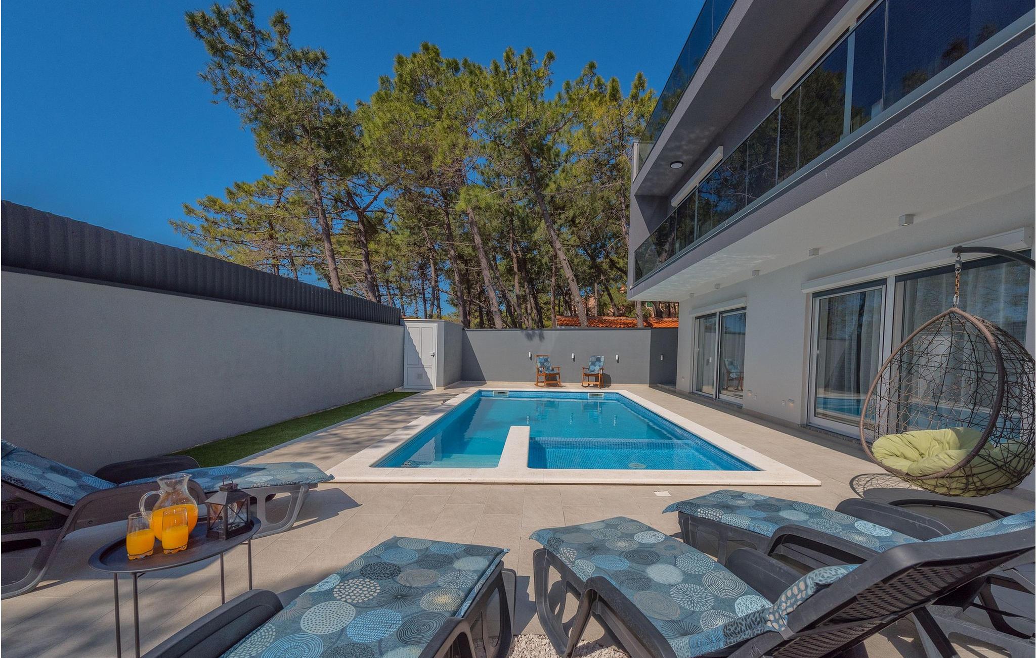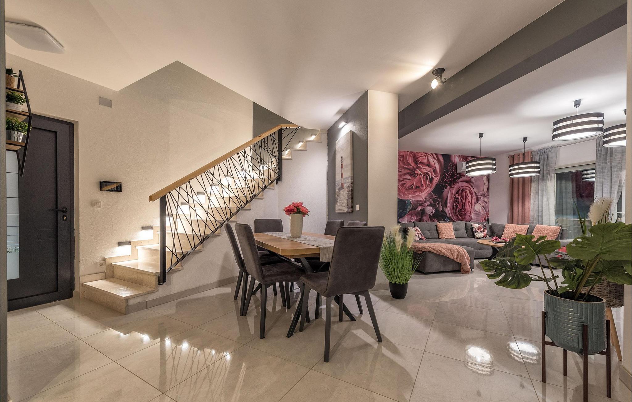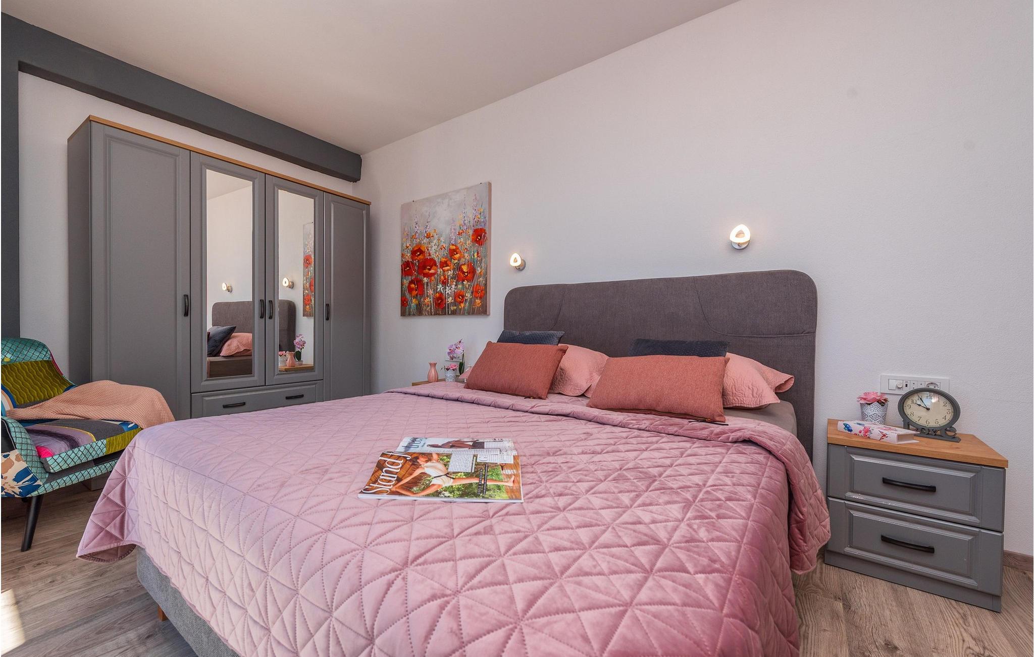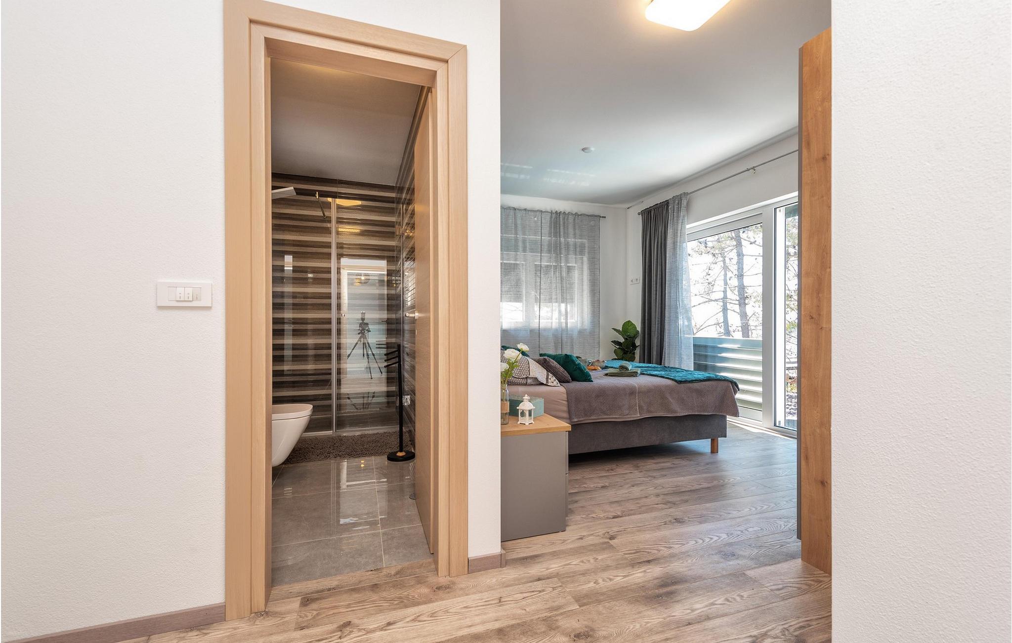 Glæd jer til jeres drømmeferie i dette luksuriøse feriehus med pool og direkte adgang til havet. Inde i Villa Karlo skaber det iøjnefaldende rosentapet en karakteristisk atmosfære, der giver opholdsstuen et elegant, næsten kunstnerisk præg. Kombinationen af bløde gråtoner, lyserøde accenter og moderne belysning skaber en varm og indbydende atmosfære, hvor I straks vil føle jer hjemme. Læn jer tilbage i den store sofa, nyd udsigten over haven eller tilbring hyggelige aftener med et glas vin. Det åbne køkken med elegant trædesign og den tilstødende spiseplads lægger op til at lave mad sammen, have lange samtaler og nyde jeres ferie fuldt ud. Udenfor smelter Villa Karlos afslapning og middelhavslivsstil sammen til en unik ferieoplevelse. Svøm baner i den elegante pool, nyd solen på de komfortable liggestole eller nyd forfriskende drinks i skyggen af det moderne loungeområde. På den rummelige terrasse med udsigt over havet kan I opleve uforglemmelige solnedgange, mens I spiser sammen. Den lille legeplads i haven giver sjov for de yngste gæster, mens de voksne nyder freden og privatlivet i dette stilfulde tilflugtssted. Oplev uforglemmelige ferier i Villa Karlo på den fortryllende ø Vir. Forbindelsen til det dalmatiske fastland giver jer mulighed for at nyde både den typiske ø-atmosfære og friheden til nemt at nå regionens smukkeste steder. Vir-kysten er en fascinerende blanding af blide stenstrande, røde klippeformationer og idylliske bugter. Cykel- og vandrestier fører rundt om Villa Karlo gennem duftende fyrretræslunde og nærliggende bakkede landskaber. Vandsportsentusiaster vil også finde deres mæthed: kajak- og bådture langs kysten eller øhopping på tværs af Zadar-øgruppen tilbyder direkte kontakt med havet. Besøg den venetianske fæstning Kaštelina, maleriske Nin med sin saltsø eller den livlige gamle bydel i Zadar. Bemærk venligst: Ejendommen accepterer ikke ungdomsgrupper under 30 år eller polterabender. Bookinger fra sådanne grupper vil blive afvist, selv ved ankomst eller under opholdet, og uden refusion.