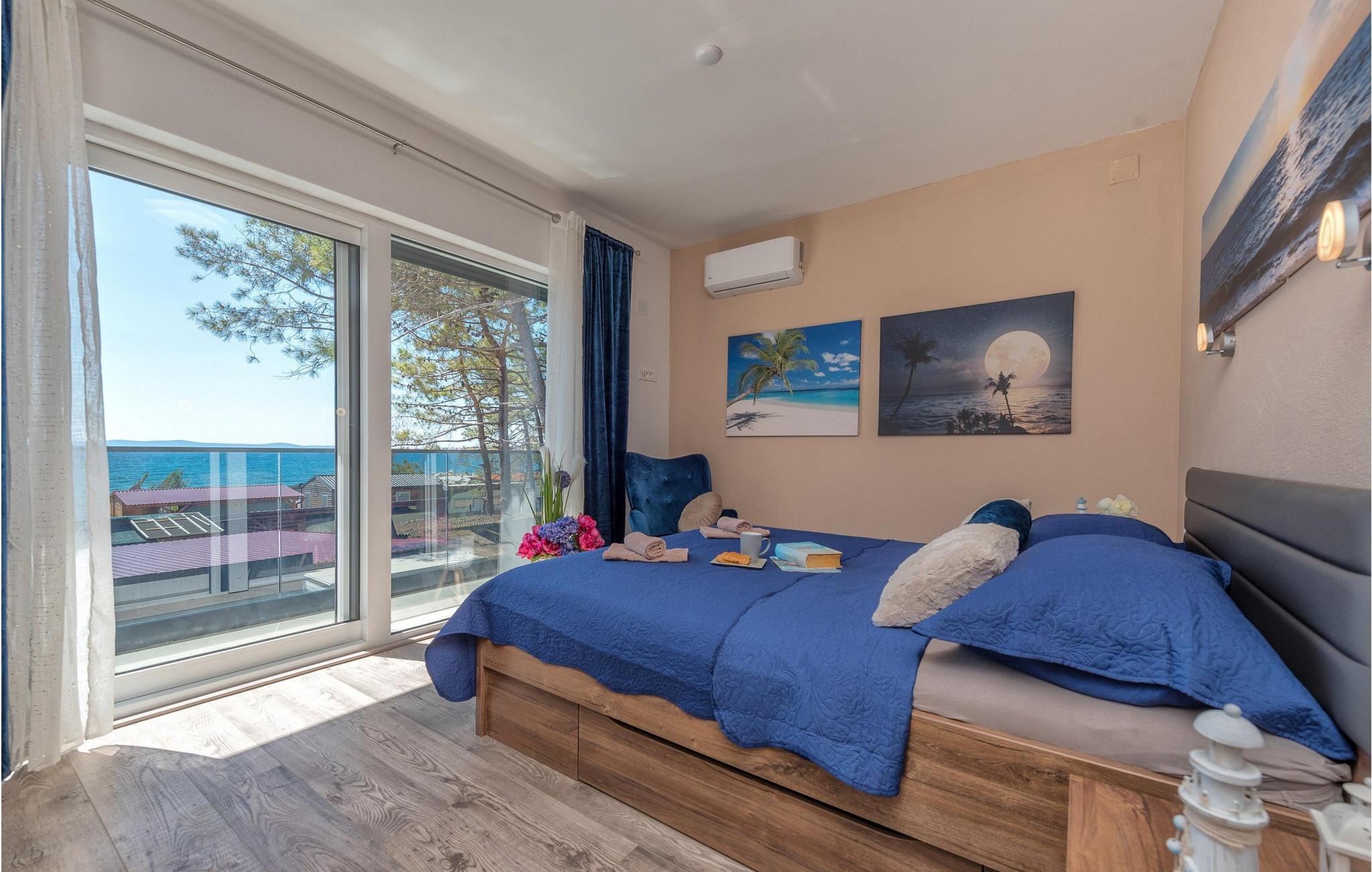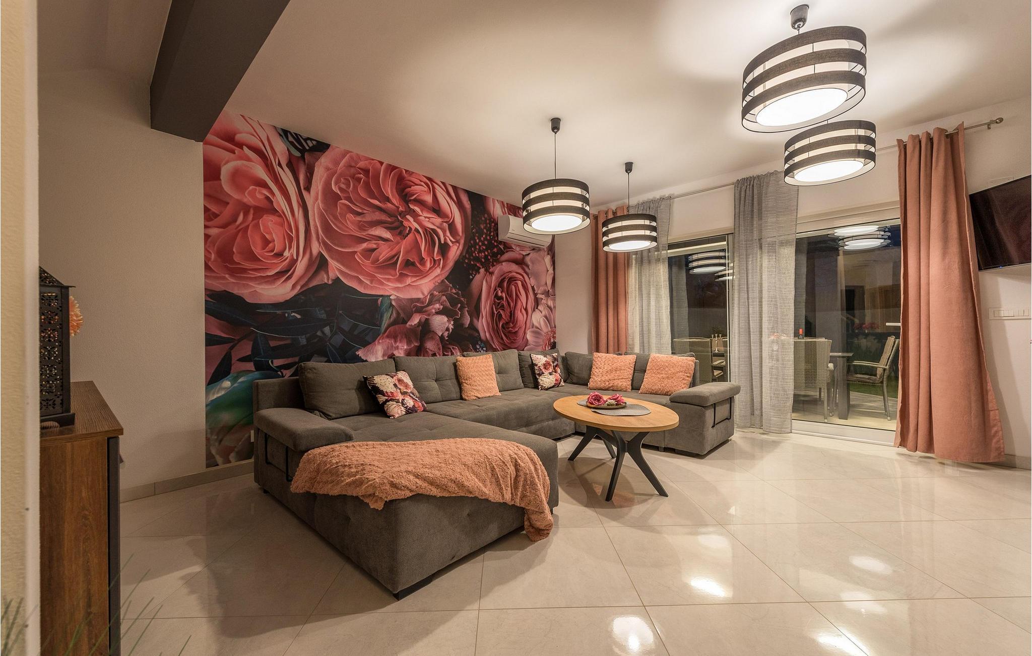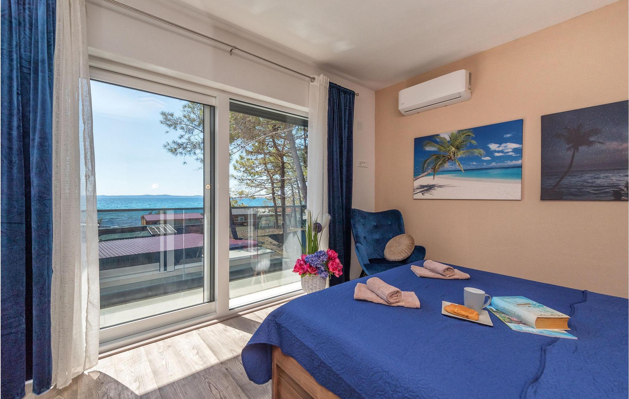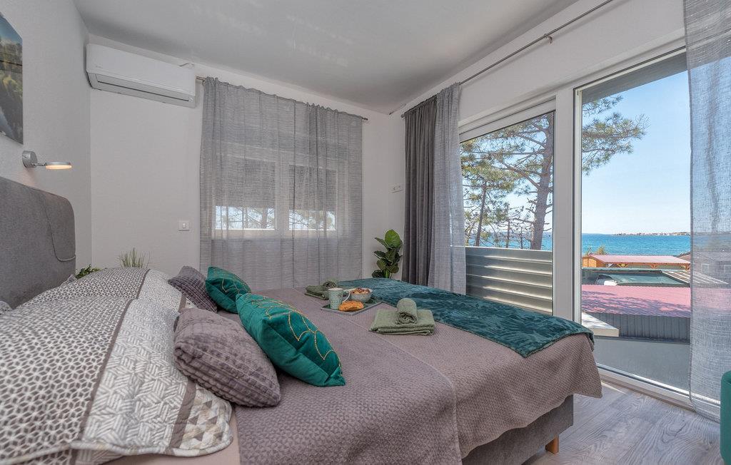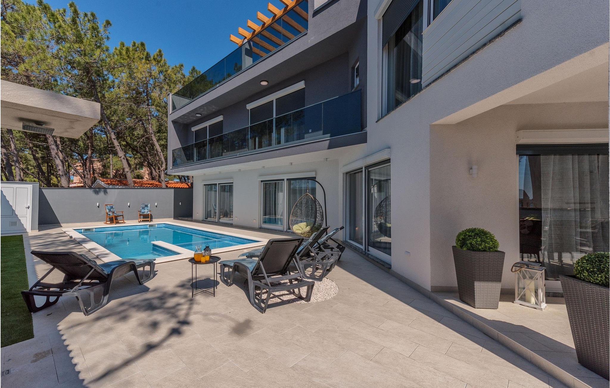 Glæd jer til jeres drømmeferie i dette luksuriøse feriehus med pool og direkte adgang til havet. Inde i Villa Karlo skaber det iøjnefaldende rosentapet en karakteristisk atmosfære, der giver opholdsstuen et elegant, næsten kunstnerisk præg. Kombinationen af bløde gråtoner, lyserøde accenter og moderne belysning skaber en varm og indbydende atmosfære, hvor I straks vil føle jer hjemme. Læn jer tilbage i den store sofa, nyd udsigten over haven eller tilbring hyggelige aftener med et glas vin. Det åbne køkken med elegant trædesign og den tilstødende spiseplads lægger op til at lave mad sammen, have lange samtaler og nyde jeres ferie fuldt ud. Udenfor smelter Villa Karlos afslapning og middelhavslivsstil sammen til en unik ferieoplevelse. Svøm baner i den elegante pool, nyd solen på de komfortable liggestole eller nyd forfriskende drinks i skyggen af det moderne loungeområde. På den rummelige terrasse med udsigt over havet kan I opleve uforglemmelige solnedgange, mens I spiser sammen. Den lille legeplads i haven giver sjov for de yngste gæster, mens de voksne nyder freden og privatlivet i dette stilfulde tilflugtssted. Oplev uforglemmelige ferier i Villa Karlo på den fortryllende ø Vir. Forbindelsen til det dalmatiske fastland giver jer mulighed for at nyde både den typiske ø-atmosfære og friheden til nemt at nå regionens smukkeste steder. Vir-kysten er en fascinerende blanding af blide stenstrande, røde klippeformationer og idylliske bugter. Cykel- og vandrestier fører rundt om Villa Karlo gennem duftende fyrretræslunde og nærliggende bakkede landskaber. Vandsportsentusiaster vil også finde deres mæthed: kajak- og bådture langs kysten eller øhopping på tværs af Zadar-øgruppen tilbyder direkte kontakt med havet. Besøg den venetianske fæstning Kaštelina, maleriske Nin med sin saltsø eller den livlige gamle bydel i Zadar. Bemærk venligst: Ejendommen accepterer ikke ungdomsgrupper under 30 år eller polterabender. Bookinger fra sådanne grupper vil blive afvist, selv ved ankomst eller under opholdet, og uden refusion.