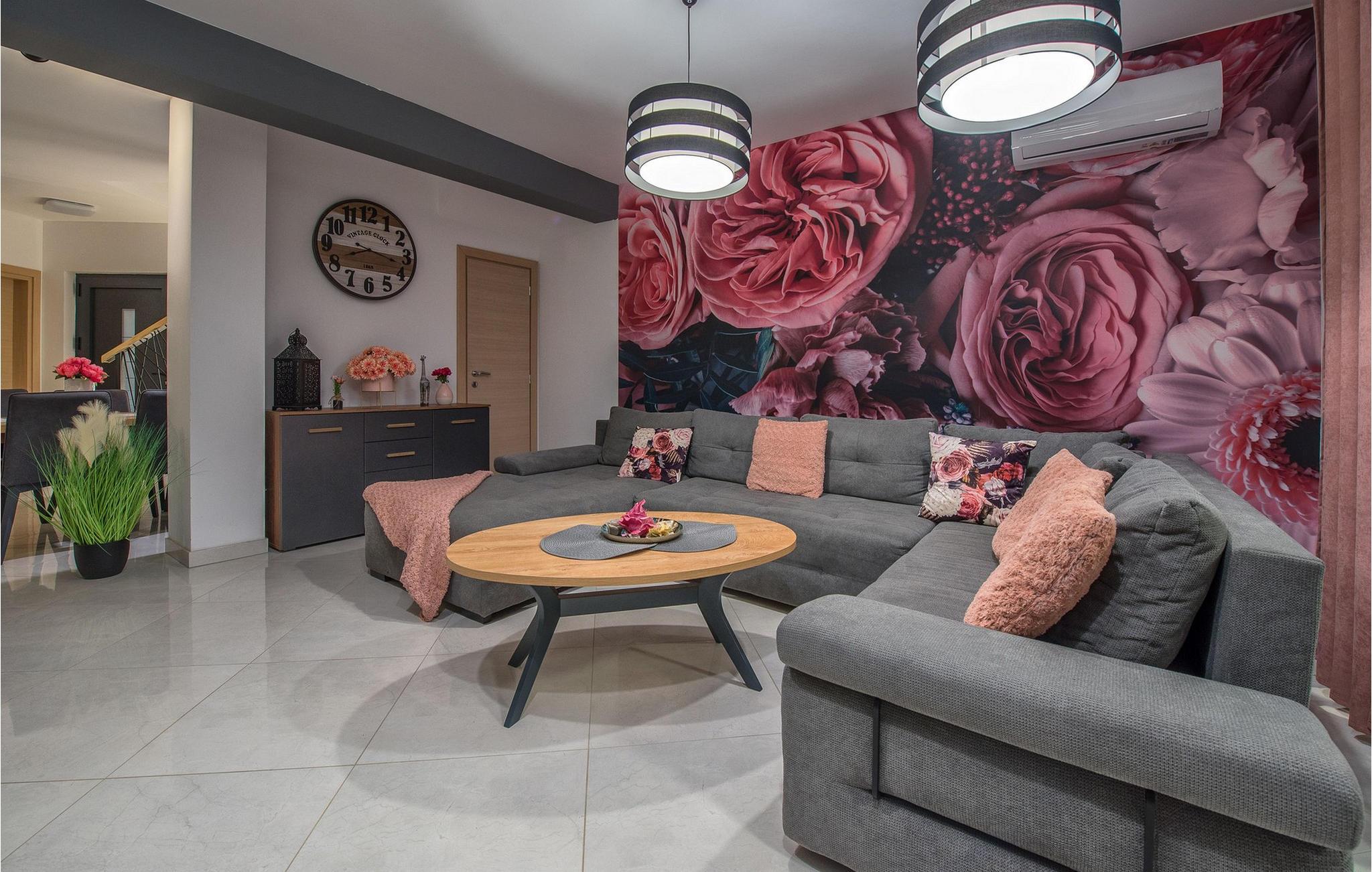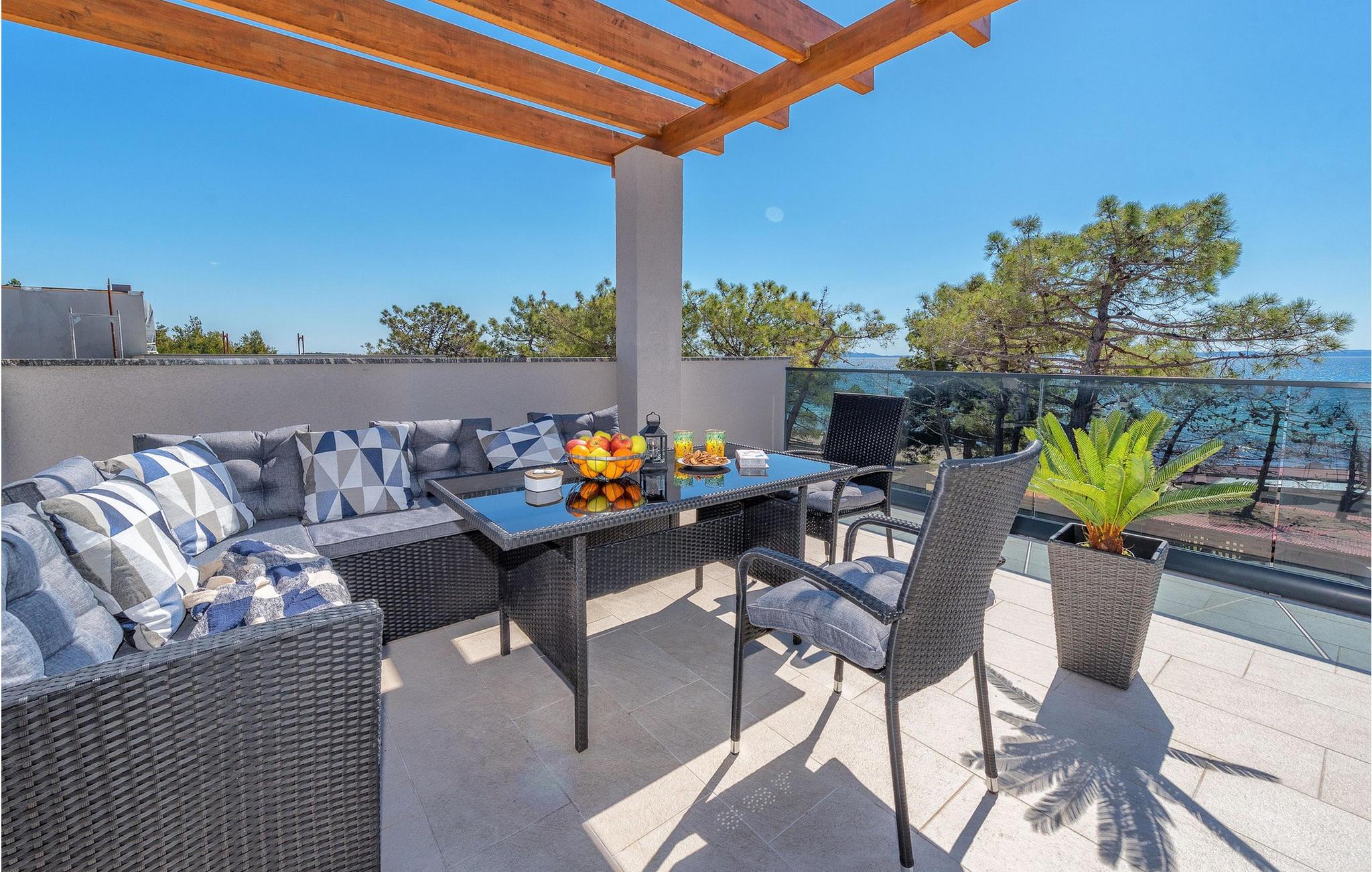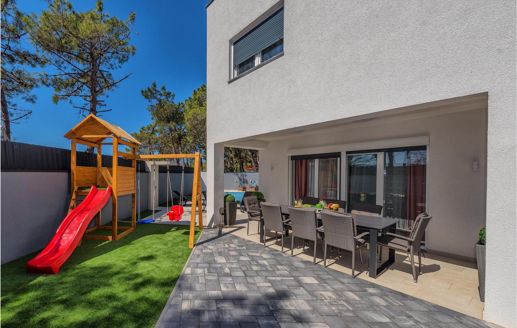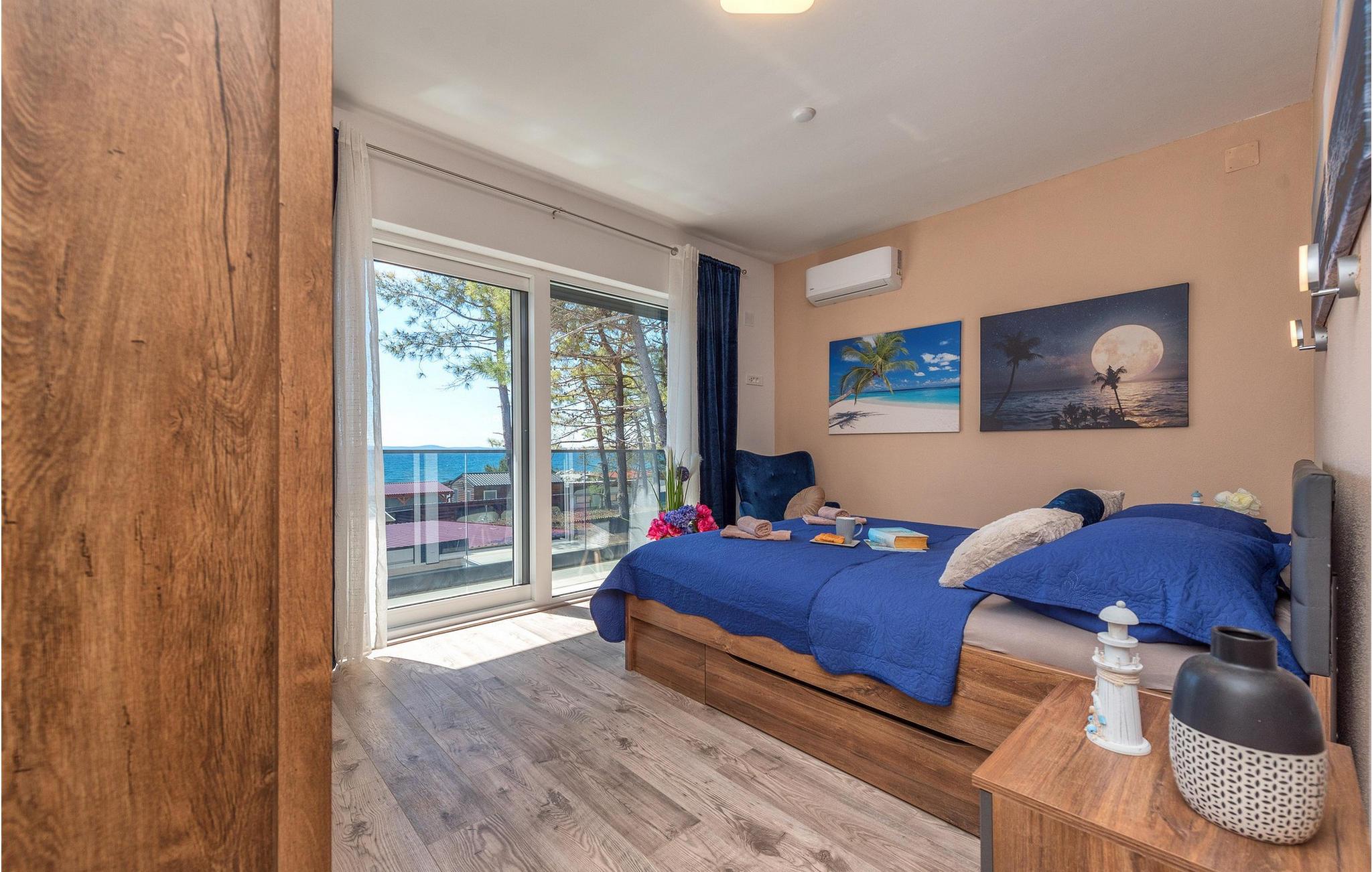 Glæd jer til jeres drømmeferie i dette luksuriøse feriehus med pool og direkte adgang til havet. Inde i Villa Karlo skaber det iøjnefaldende rosentapet en karakteristisk atmosfære, der giver opholdsstuen et elegant, næsten kunstnerisk præg. Kombinationen af bløde gråtoner, lyserøde accenter og moderne belysning skaber en varm og indbydende atmosfære, hvor I straks vil føle jer hjemme. Læn jer tilbage i den store sofa, nyd udsigten over haven eller tilbring hyggelige aftener med et glas vin. Det åbne køkken med elegant trædesign og den tilstødende spiseplads lægger op til at lave mad sammen, have lange samtaler og nyde jeres ferie fuldt ud. Udenfor smelter Villa Karlos afslapning og middelhavslivsstil sammen til en unik ferieoplevelse. Svøm baner i den elegante pool, nyd solen på de komfortable liggestole eller nyd forfriskende drinks i skyggen af det moderne loungeområde. På den rummelige terrasse med udsigt over havet kan I opleve uforglemmelige solnedgange, mens I spiser sammen. Den lille legeplads i haven giver sjov for de yngste gæster, mens de voksne nyder freden og privatlivet i dette stilfulde tilflugtssted. Oplev uforglemmelige ferier i Villa Karlo på den fortryllende ø Vir. Forbindelsen til det dalmatiske fastland giver jer mulighed for at nyde både den typiske ø-atmosfære og friheden til nemt at nå regionens smukkeste steder. Vir-kysten er en fascinerende blanding af blide stenstrande, røde klippeformationer og idylliske bugter. Cykel- og vandrestier fører rundt om Villa Karlo gennem duftende fyrretræslunde og nærliggende bakkede landskaber. Vandsportsentusiaster vil også finde deres mæthed: kajak- og bådture langs kysten eller øhopping på tværs af Zadar-øgruppen tilbyder direkte kontakt med havet. Besøg den venetianske fæstning Kaštelina, maleriske Nin med sin saltsø eller den livlige gamle bydel i Zadar. Bemærk venligst: Ejendommen accepterer ikke ungdomsgrupper under 30 år eller polterabender. Bookinger fra sådanne grupper vil blive afvist, selv ved ankomst eller under opholdet, og uden refusion.