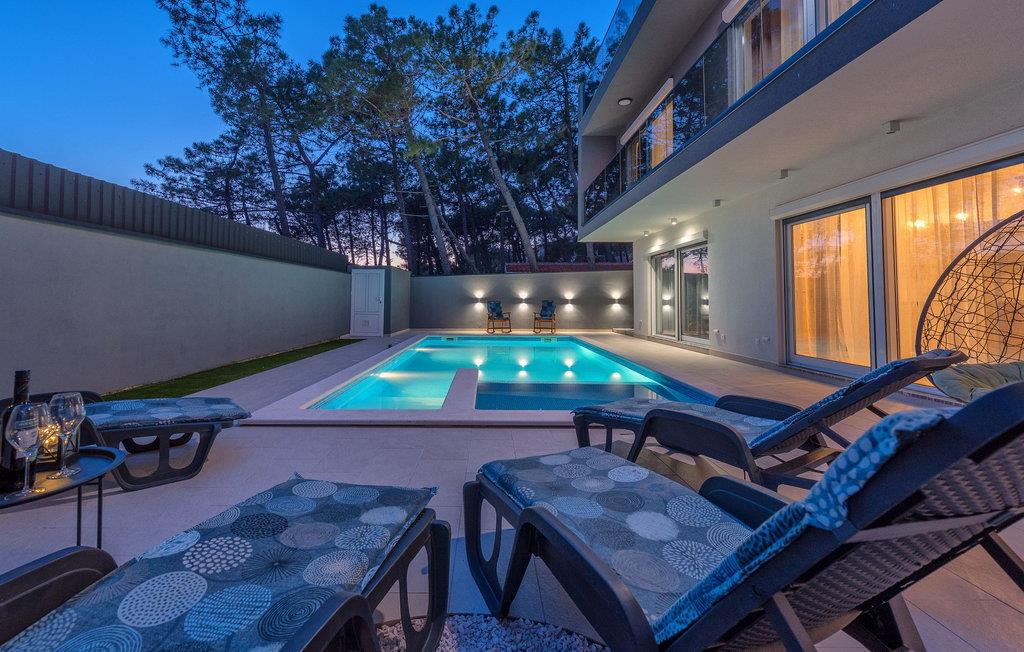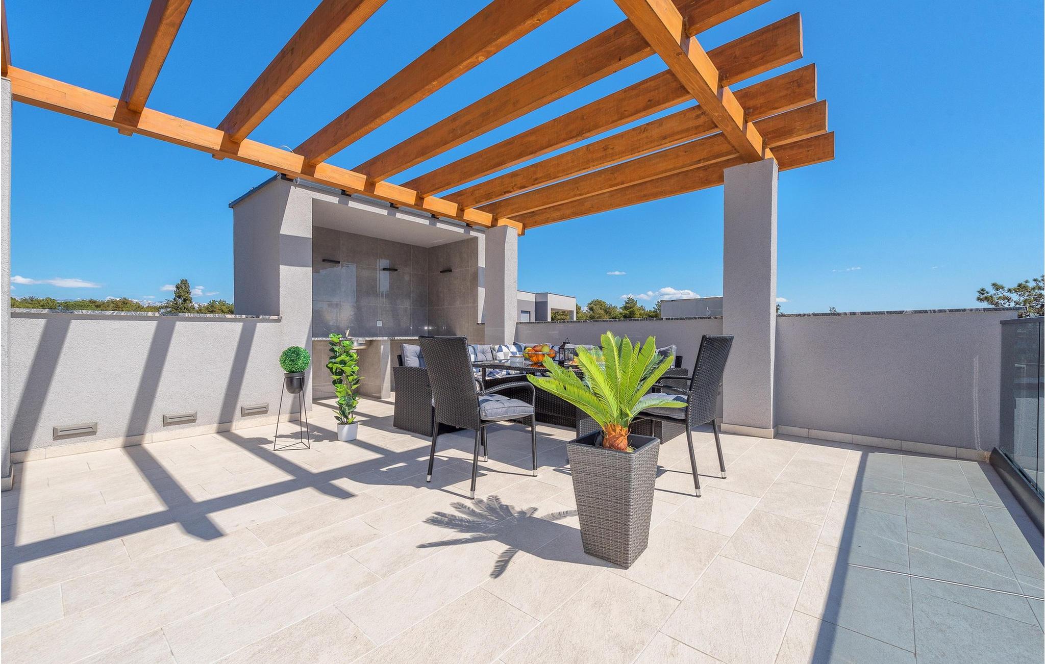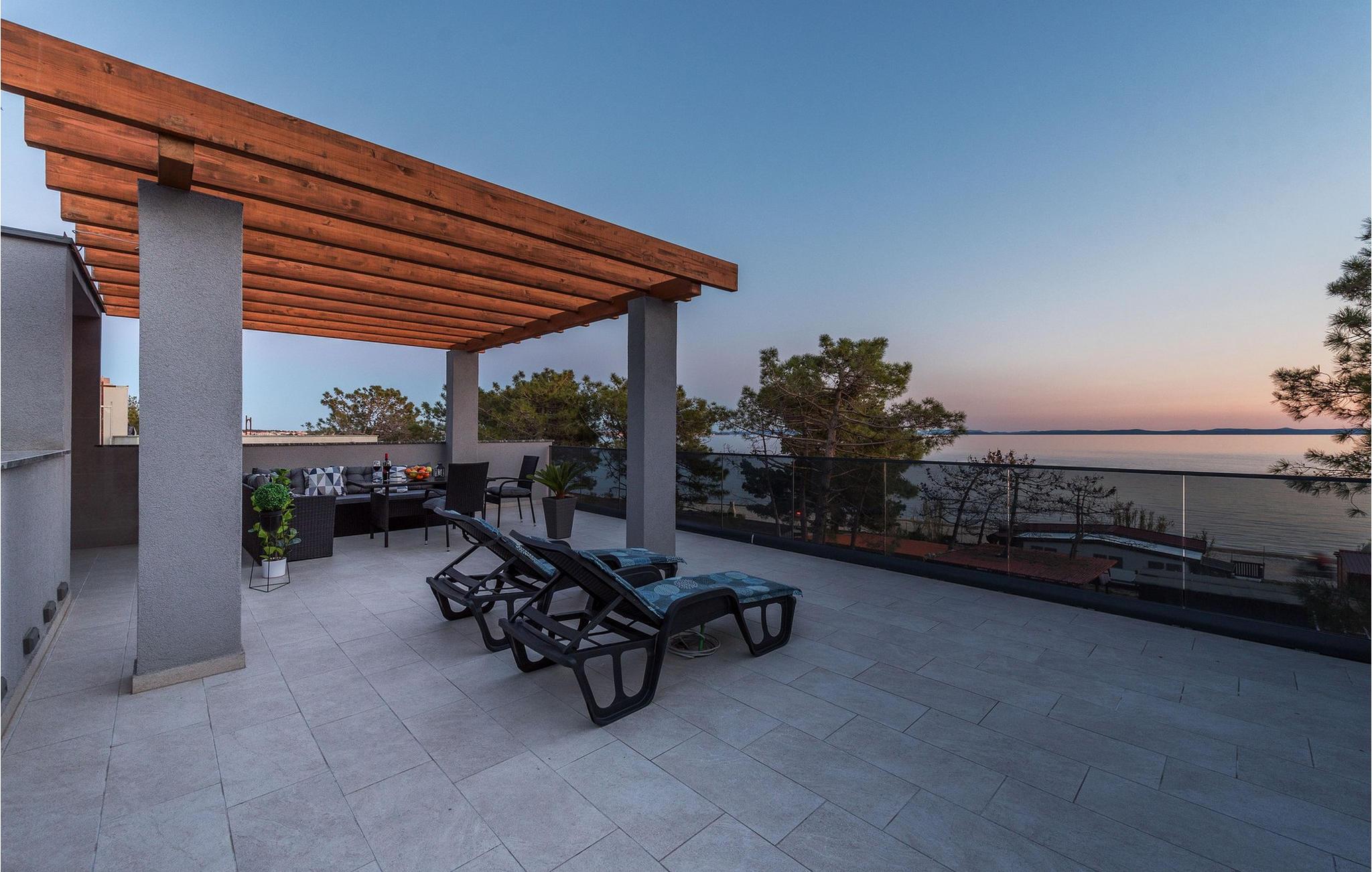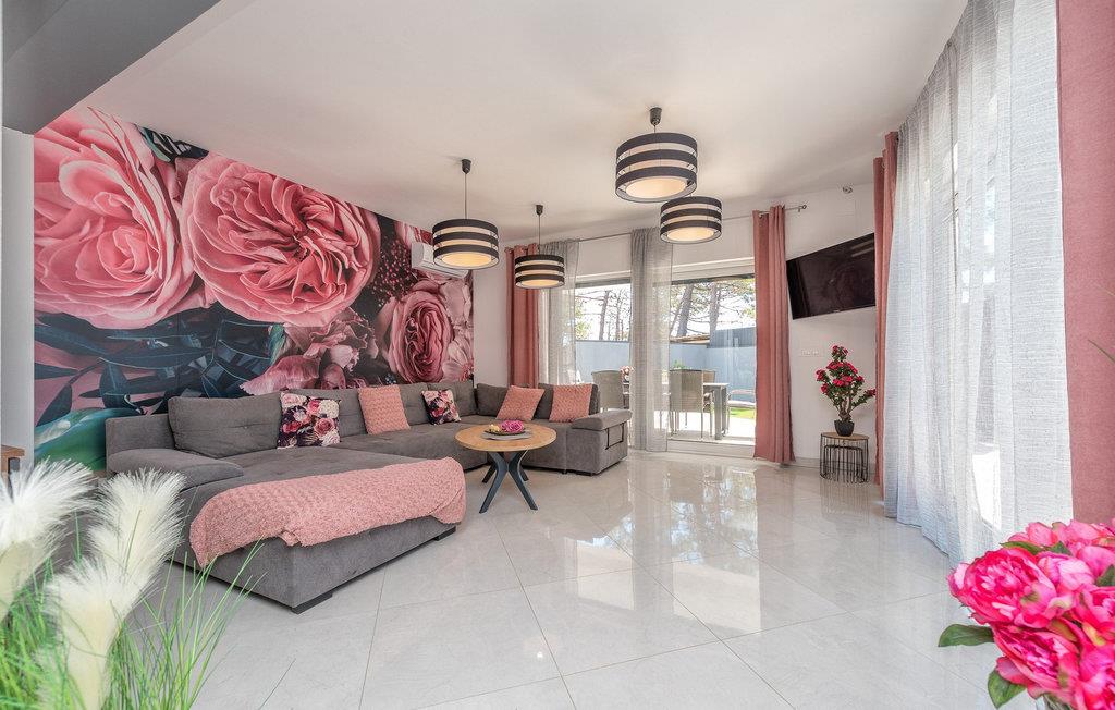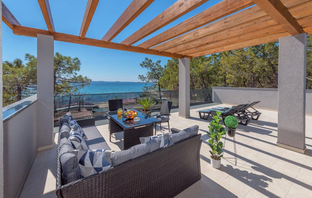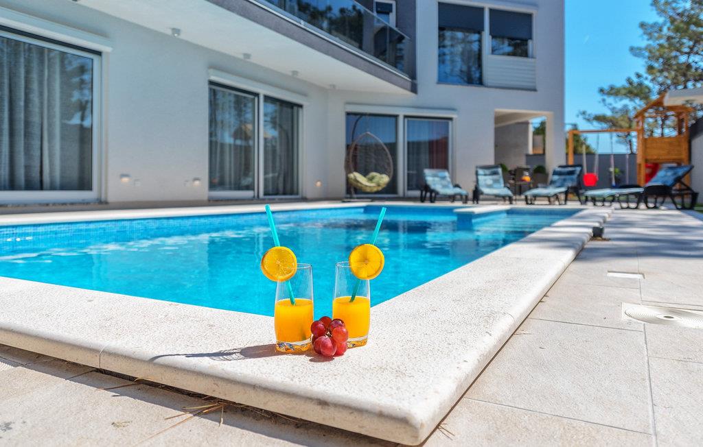Glæd jer til jeres drømmeferie i dette luksuriøse feriehus med pool og direkte adgang til havet. Inde i Villa Karlo skaber det iøjnefaldende rosentapet en karakteristisk atmosfære, der giver opholdsstuen et elegant, næsten kunstnerisk præg. Kombinationen af bløde gråtoner, lyserøde accenter og moderne belysning skaber en varm og indbydende atmosfære, hvor I straks vil føle jer hjemme. Læn jer tilbage i den store sofa, nyd udsigten over haven eller tilbring hyggelige aftener med et glas vin. Det åbne køkken med elegant trædesign og den tilstødende spiseplads lægger op til at lave mad sammen, have lange samtaler og nyde jeres ferie fuldt ud. Udenfor smelter Villa Karlos afslapning og middelhavslivsstil sammen til en unik ferieoplevelse. Svøm baner i den elegante pool, nyd solen på de komfortable liggestole eller nyd forfriskende drinks i skyggen af det moderne loungeområde. På den rummelige terrasse med udsigt over havet kan I opleve uforglemmelige solnedgange, mens I spiser sammen. Den lille legeplads i haven giver sjov for de yngste gæster, mens de voksne nyder freden og privatlivet i dette stilfulde tilflugtssted. Oplev uforglemmelige ferier i Villa Karlo på den fortryllende ø Vir. Forbindelsen til det dalmatiske fastland giver jer mulighed for at nyde både den typiske ø-atmosfære og friheden til nemt at nå regionens smukkeste steder. Vir-kysten er en fascinerende blanding af blide stenstrande, røde klippeformationer og idylliske bugter. Cykel- og vandrestier fører rundt om Villa Karlo gennem duftende fyrretræslunde og nærliggende bakkede landskaber. Vandsportsentusiaster vil også finde deres mæthed: kajak- og bådture langs kysten eller øhopping på tværs af Zadar-øgruppen tilbyder direkte kontakt med havet. Besøg den venetianske fæstning Kaštelina, maleriske Nin med sin saltsø eller den livlige gamle bydel i Zadar. Bemærk venligst: Ejendommen accepterer ikke ungdomsgrupper under 30 år eller polterabender. Bookinger fra sådanne grupper vil blive afvist, selv ved ankomst eller under opholdet, og uden refusion.