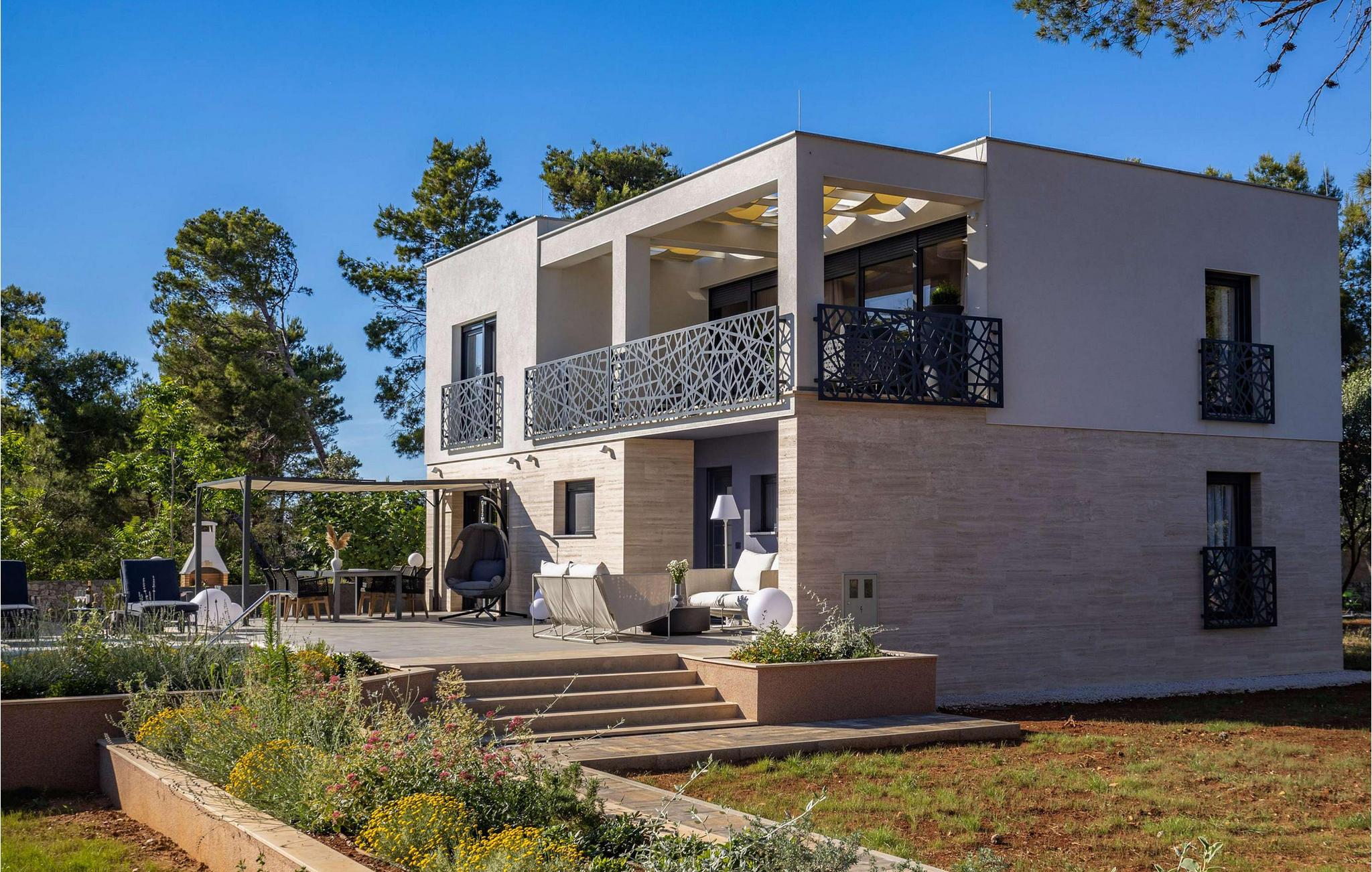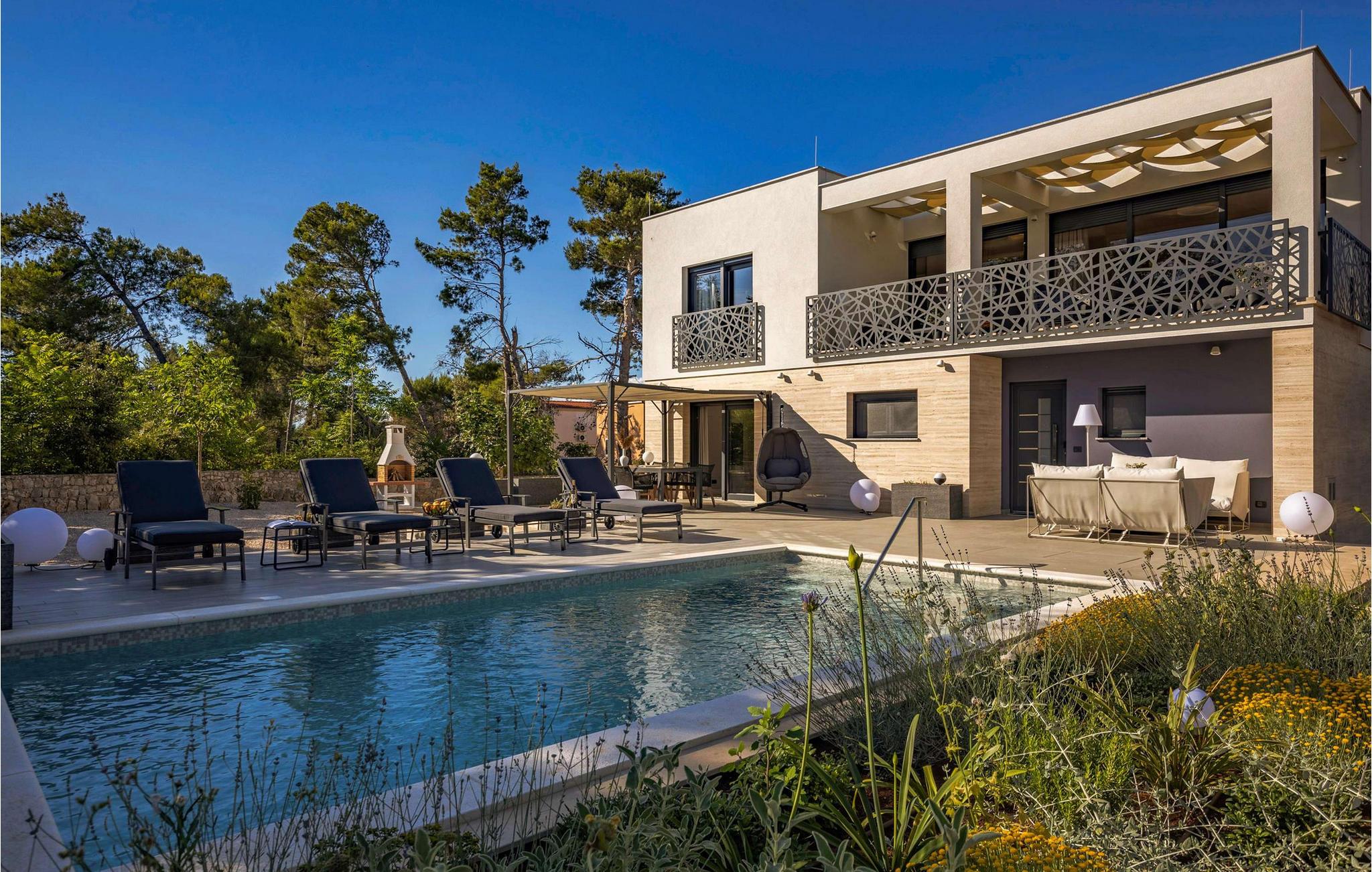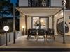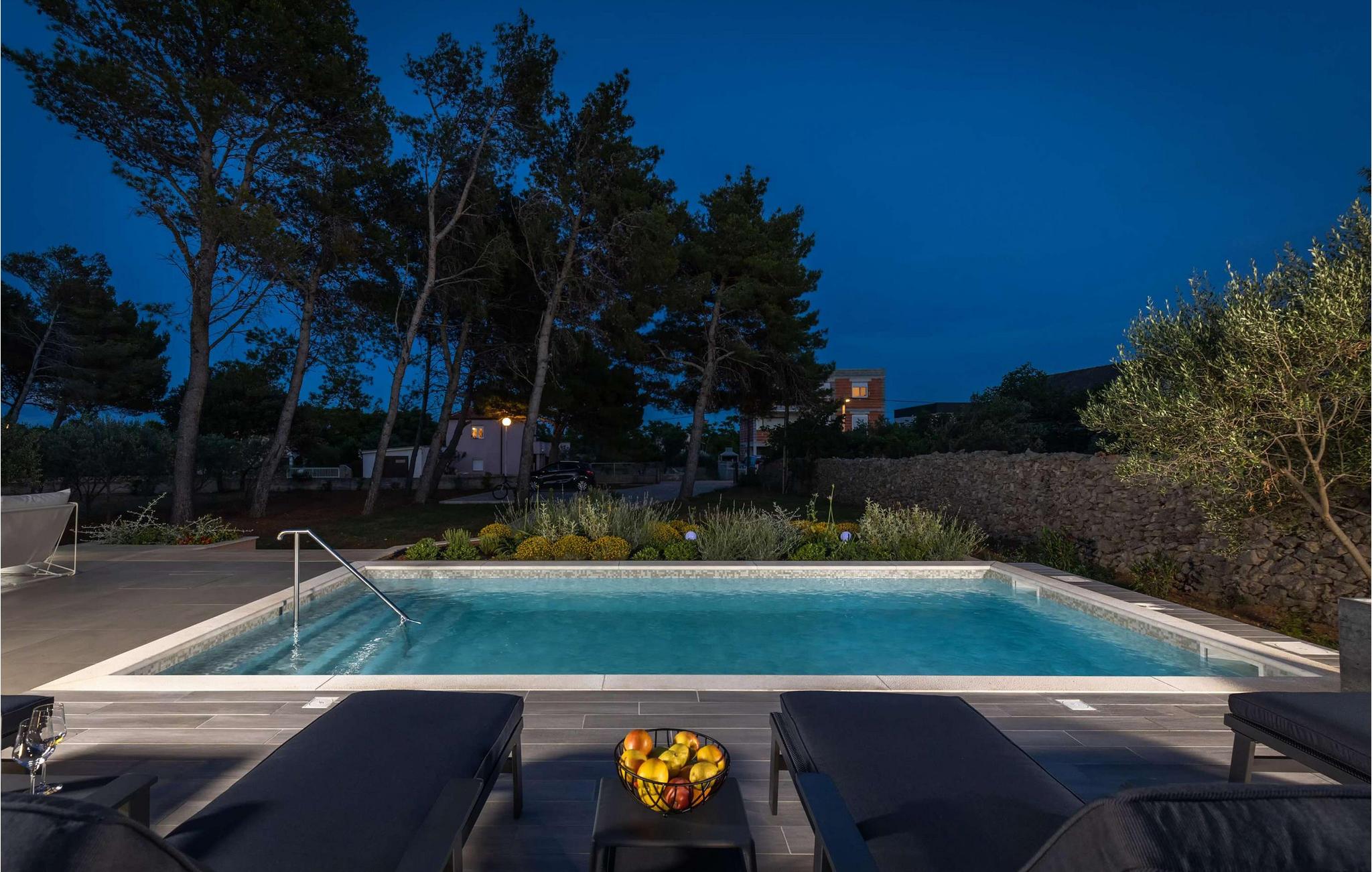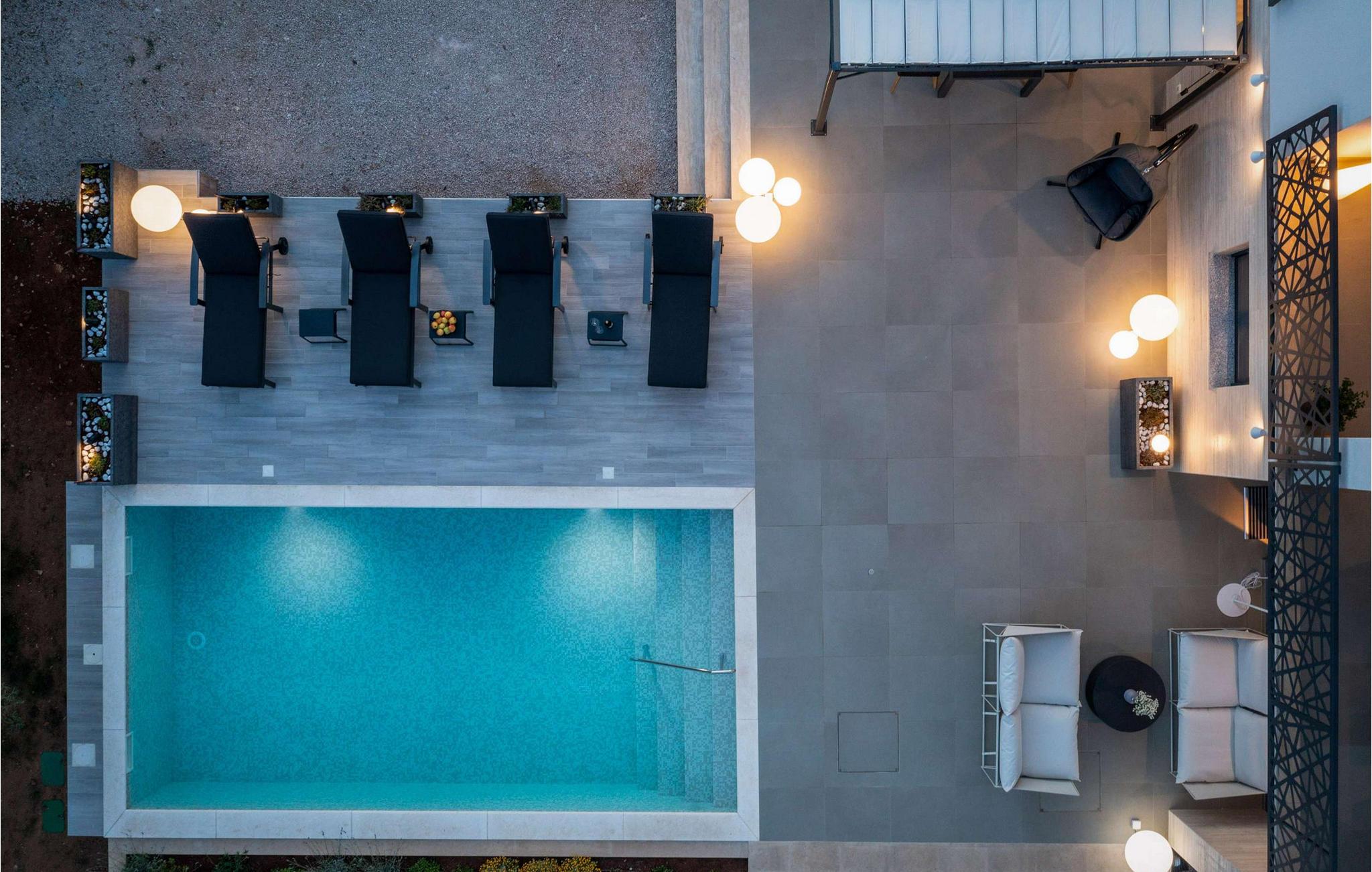 Det stemningsfuldt oplyste udendørsområde lader intet tilbage at ønske og lægger op til at dvæle under åben himmel fra morgen til aften. Start jeres dag med en afslappet svømmetur i poolen, genoplad batterierne på behagelige liggestole og nyd jeres privatliv med afslappede grillmiddage på terrassen.