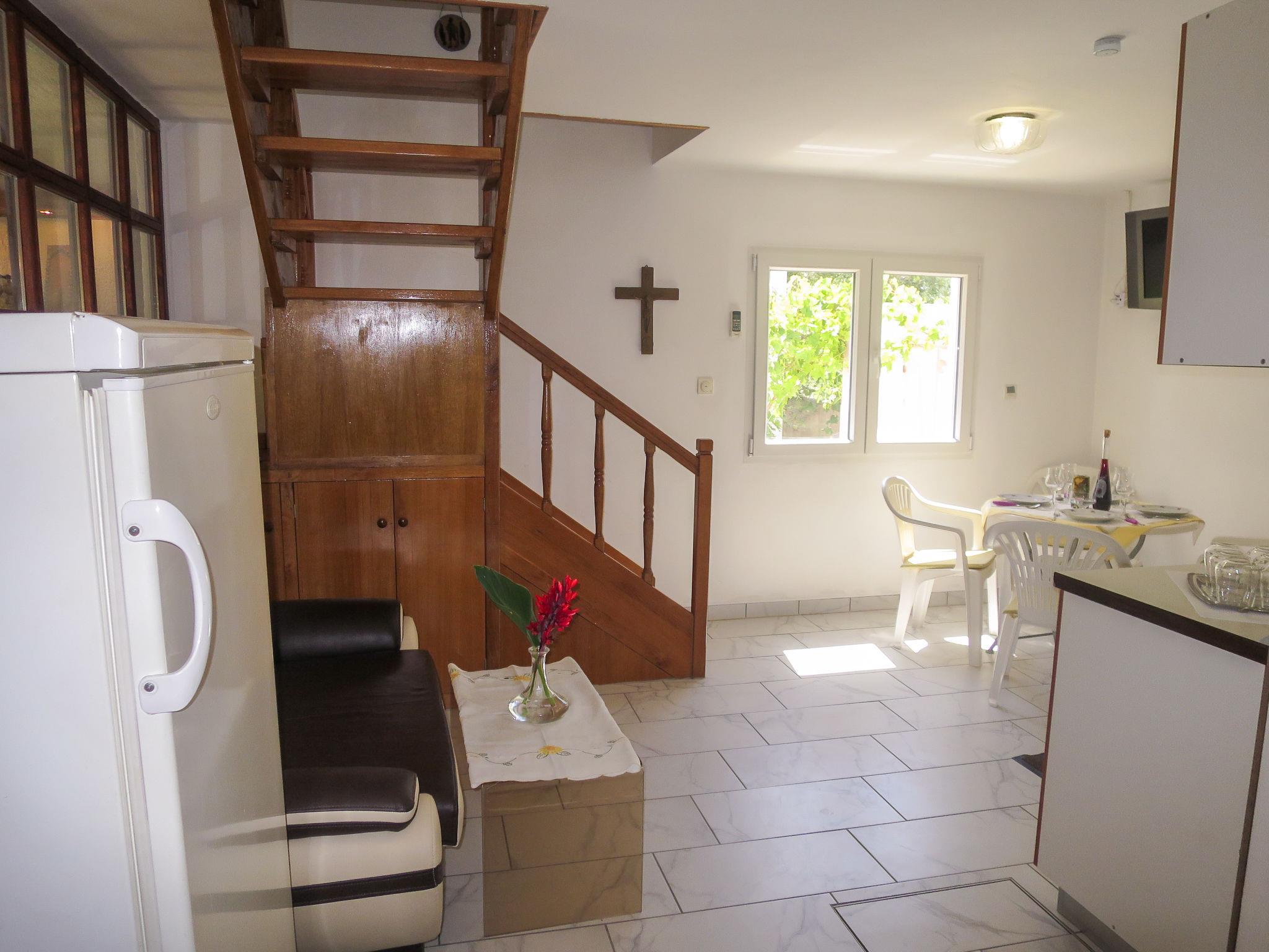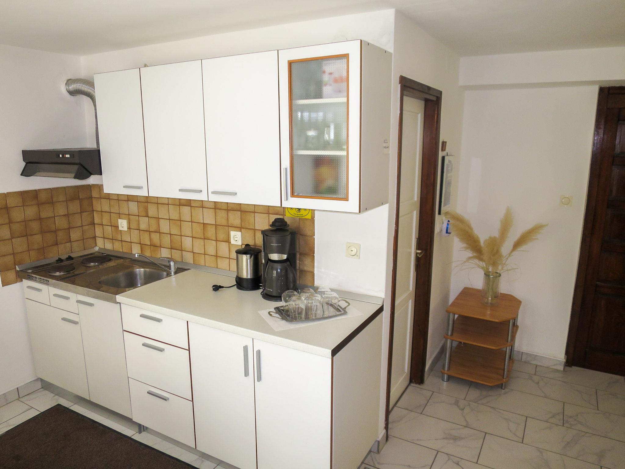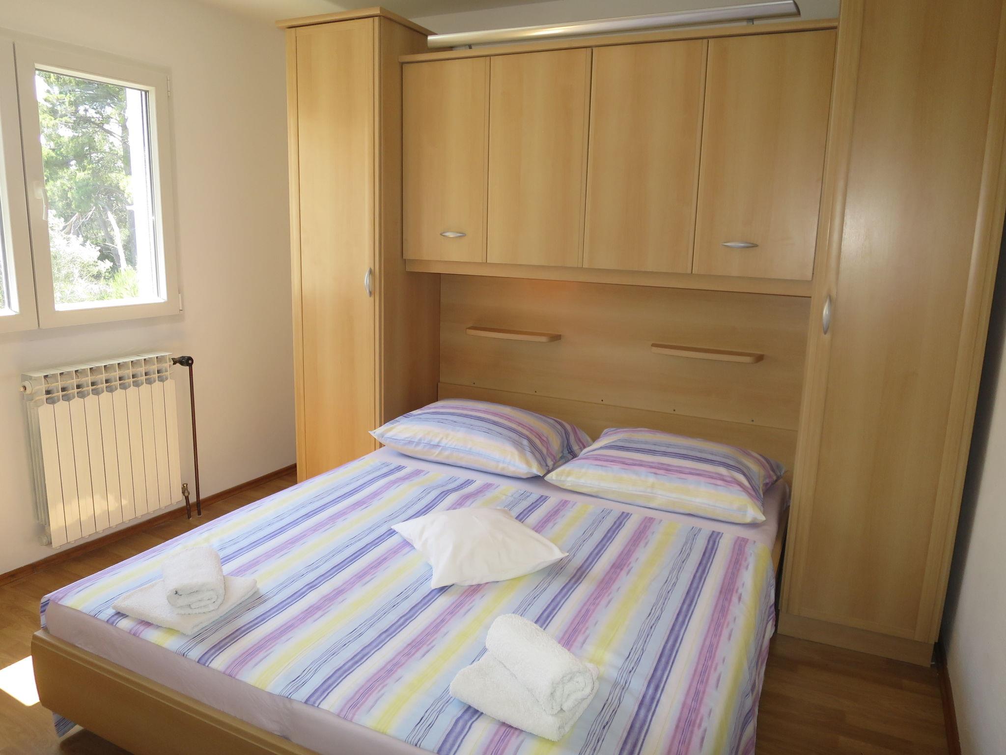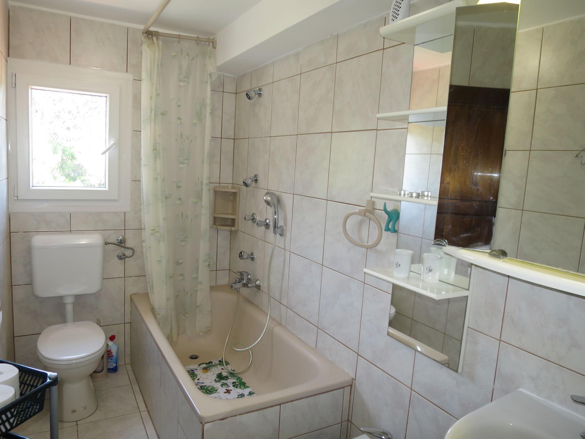 3-room apartment 60 m2 on 2 levels, on the ground floor, south facing position. Living/dining room with satellite TV (flat screen). Exit to the terrace. Open kitchen (2 hot plates, kettle, microwave, electric coffee machine). Sep. WC. Upper floor: entrance hall with air conditioning. 1 room with 1 double bed (2 x 90 cm, length 200 cm), satellite TV (flat screen). Exit to the balcony. 1 room with 1 double bed (2 x 80 cm, length 200 cm), satellite TV. Bath/bidet/WC. No heating option. Balcony 3 m2, terrace 20 m2, roofed. Terrace furniture. Facilities: Internet (WiFi, free).