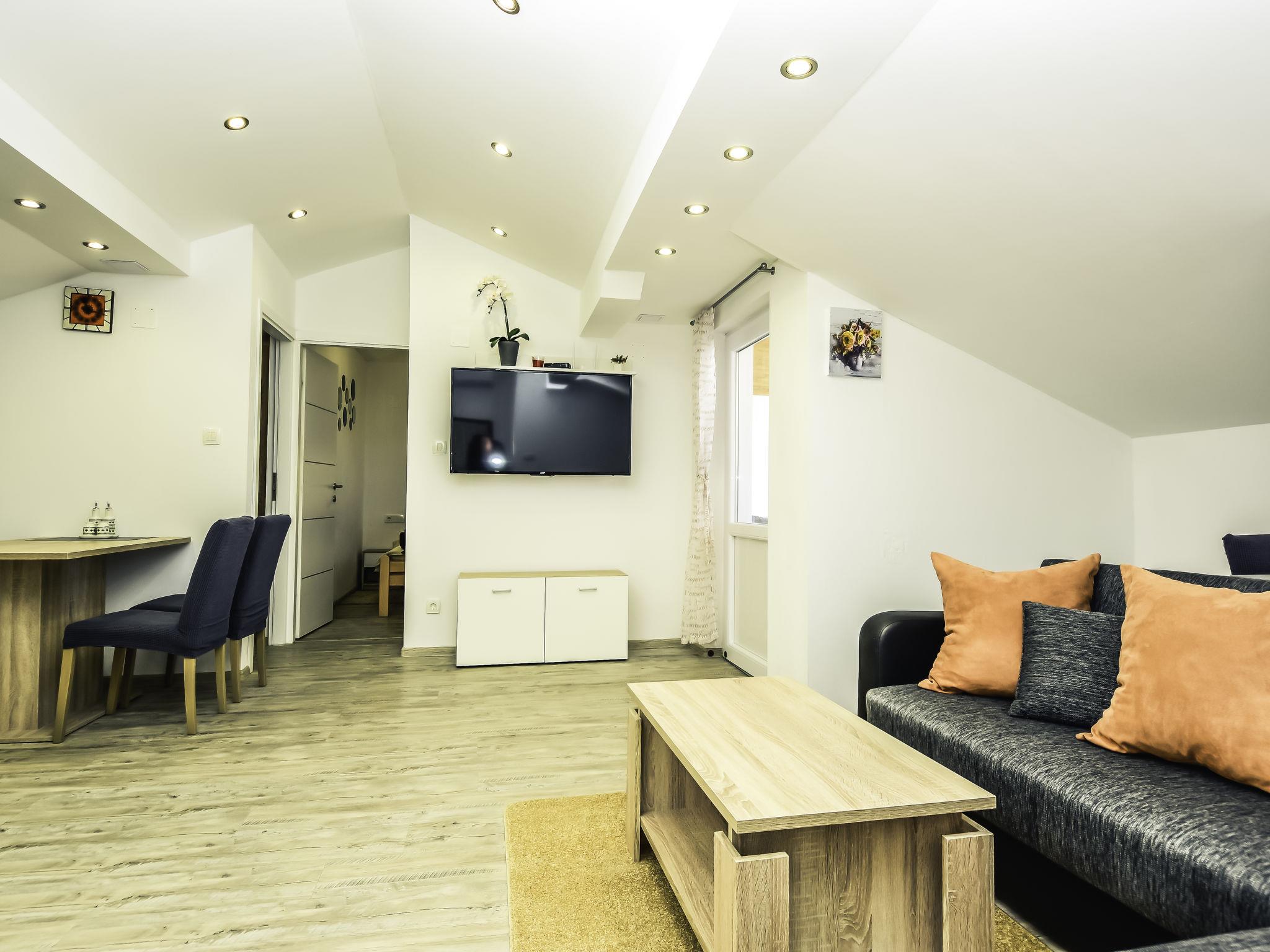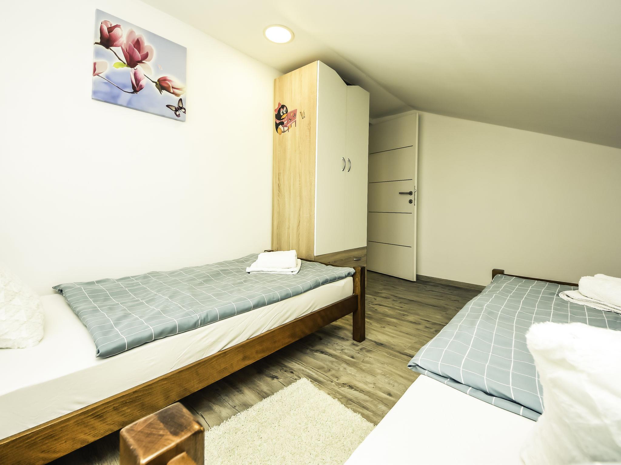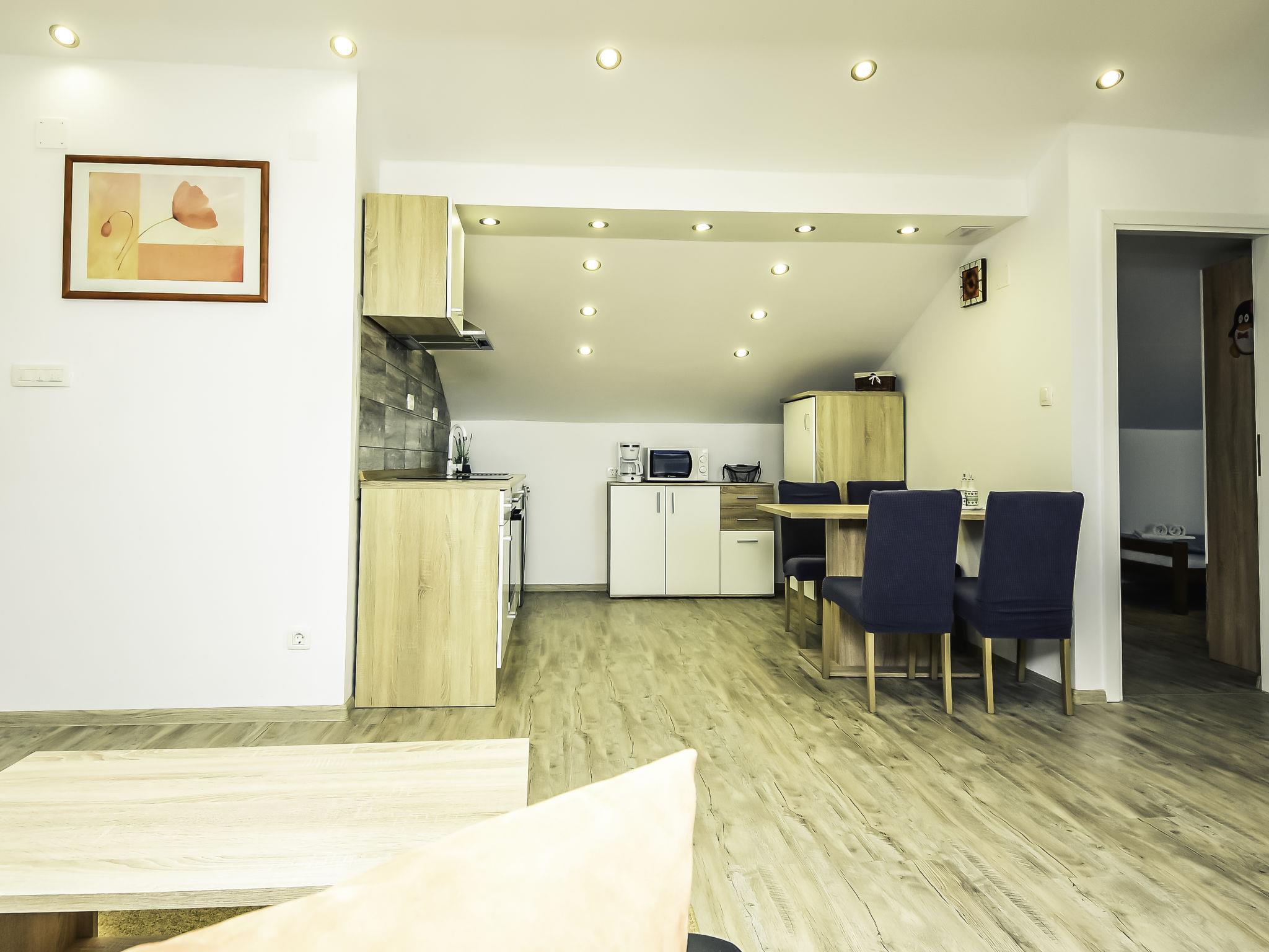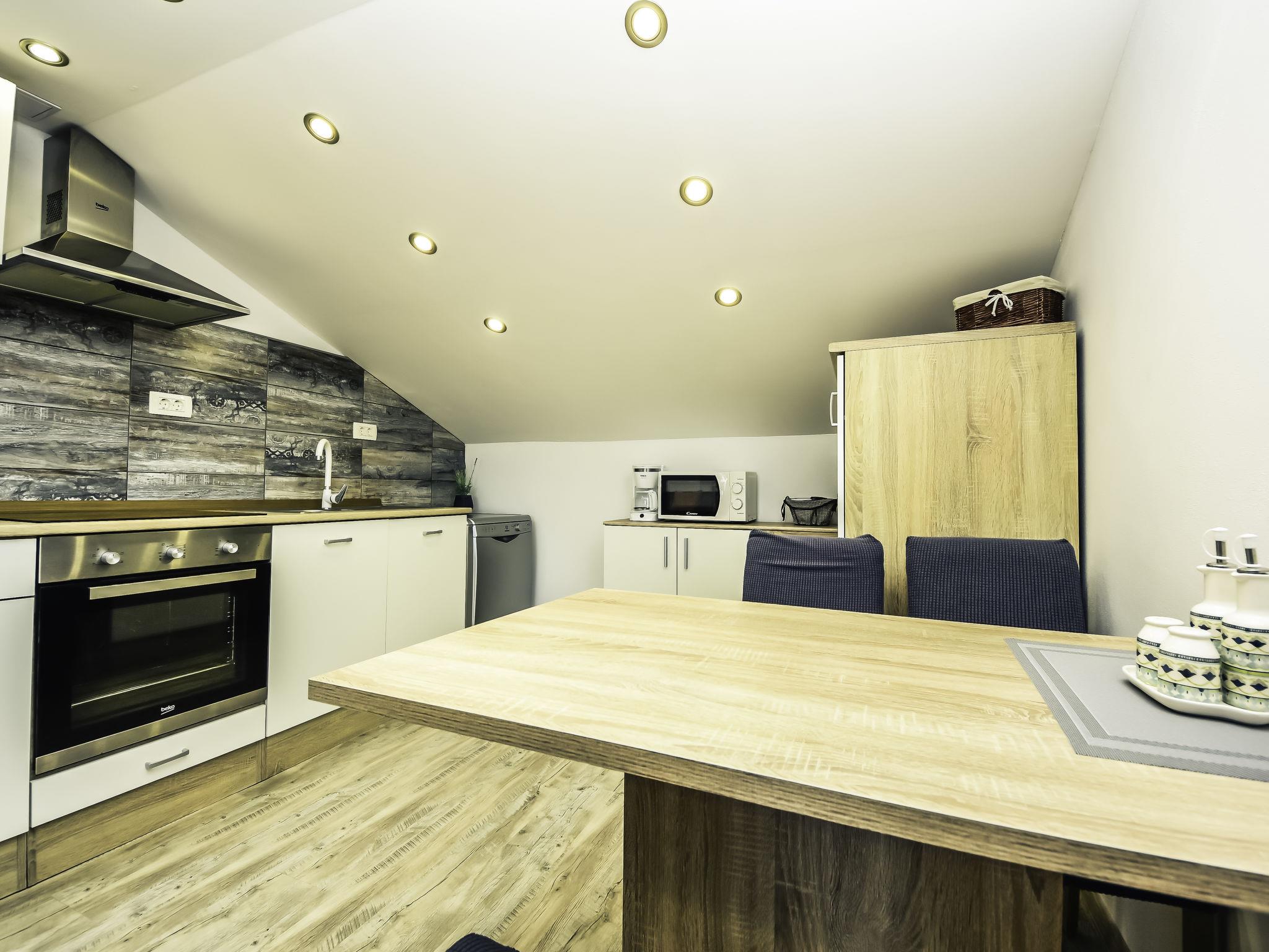 3-room apartment 60 m2, on the top floor, north-east facing position. Living/dining room 36 m2, with sloping ceilings, ceiling height 130 - 270 cm with 1 sofabed (140 cm, length 200 cm), satellite TV (flat screen), air conditioning. Exit to the terrace. 1 room with sloping ceilings, ceiling height 130 - 270 cm with 1 french bed (160 cm, length 200 cm). 1 room with sloping ceilings, ceiling height 130 - 270 cm with 2 beds (90 cm, length 200 cm). Open kitchen (oven, dishwasher, 4 ceramic glass hob hotplates, microwave, freezer, electric coffee machine). Shower/WC. No heating option. Terrace 15 m2, roofed. Terrace furniture. Distant view of the sea. Facilities: Internet (WiFi, free).