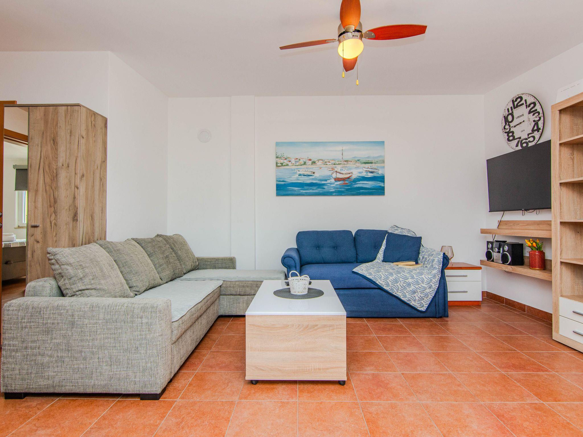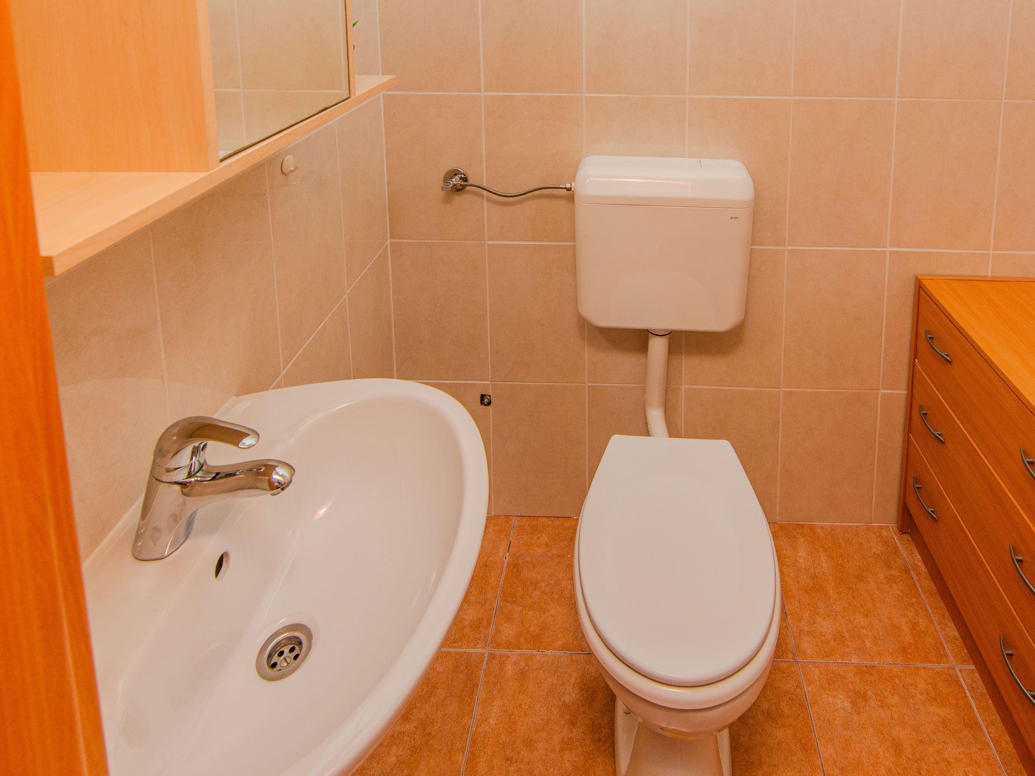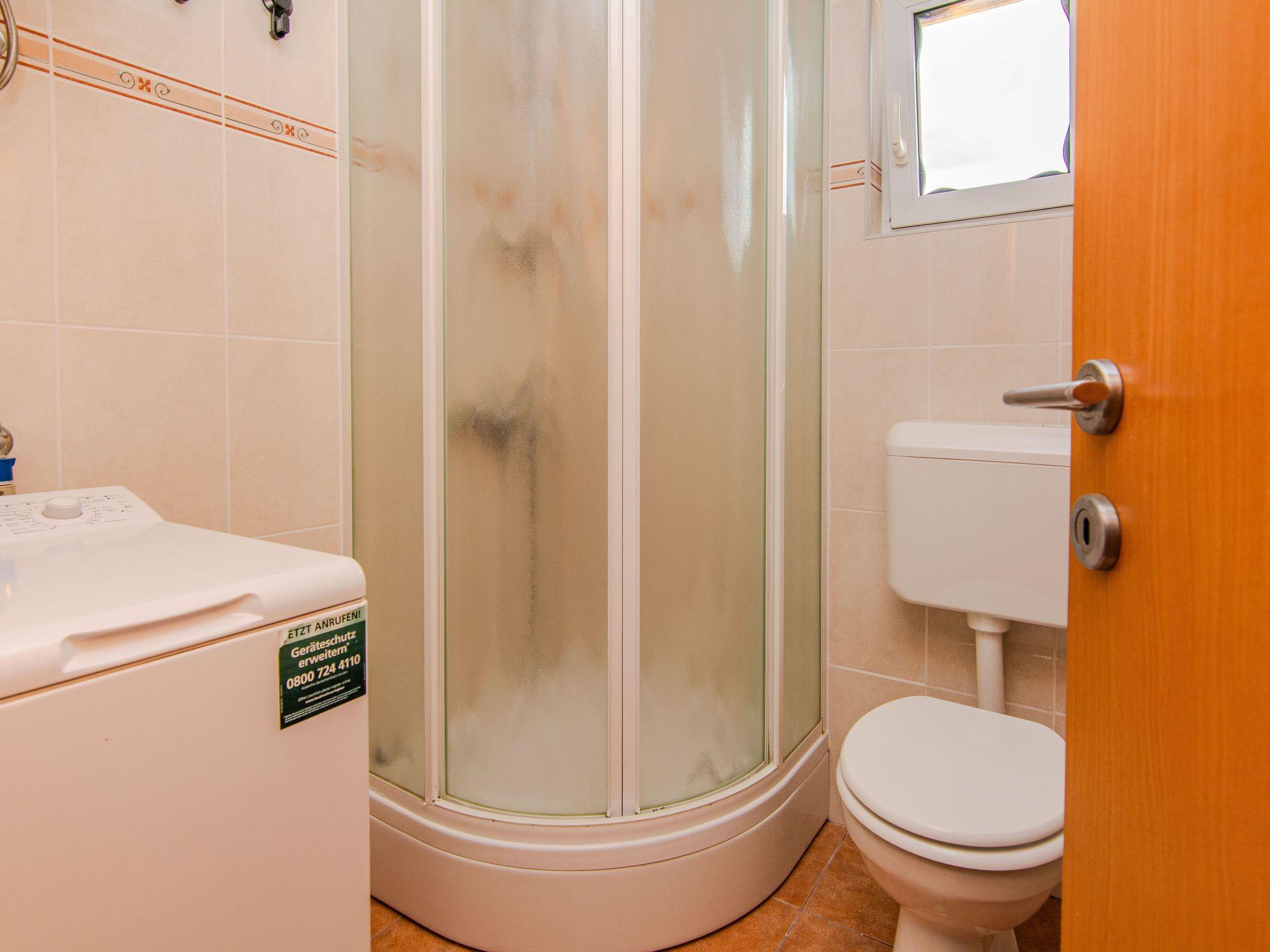 The flat (48 m²) is divided into a living room, a fully equipped kitchen, two bedrooms with double beds, a bathroom with shower and a separate toilet. The flat has a covered balcony (7 m²) with partial sea view, table and chairs. The balcony is closed and can be opened.
