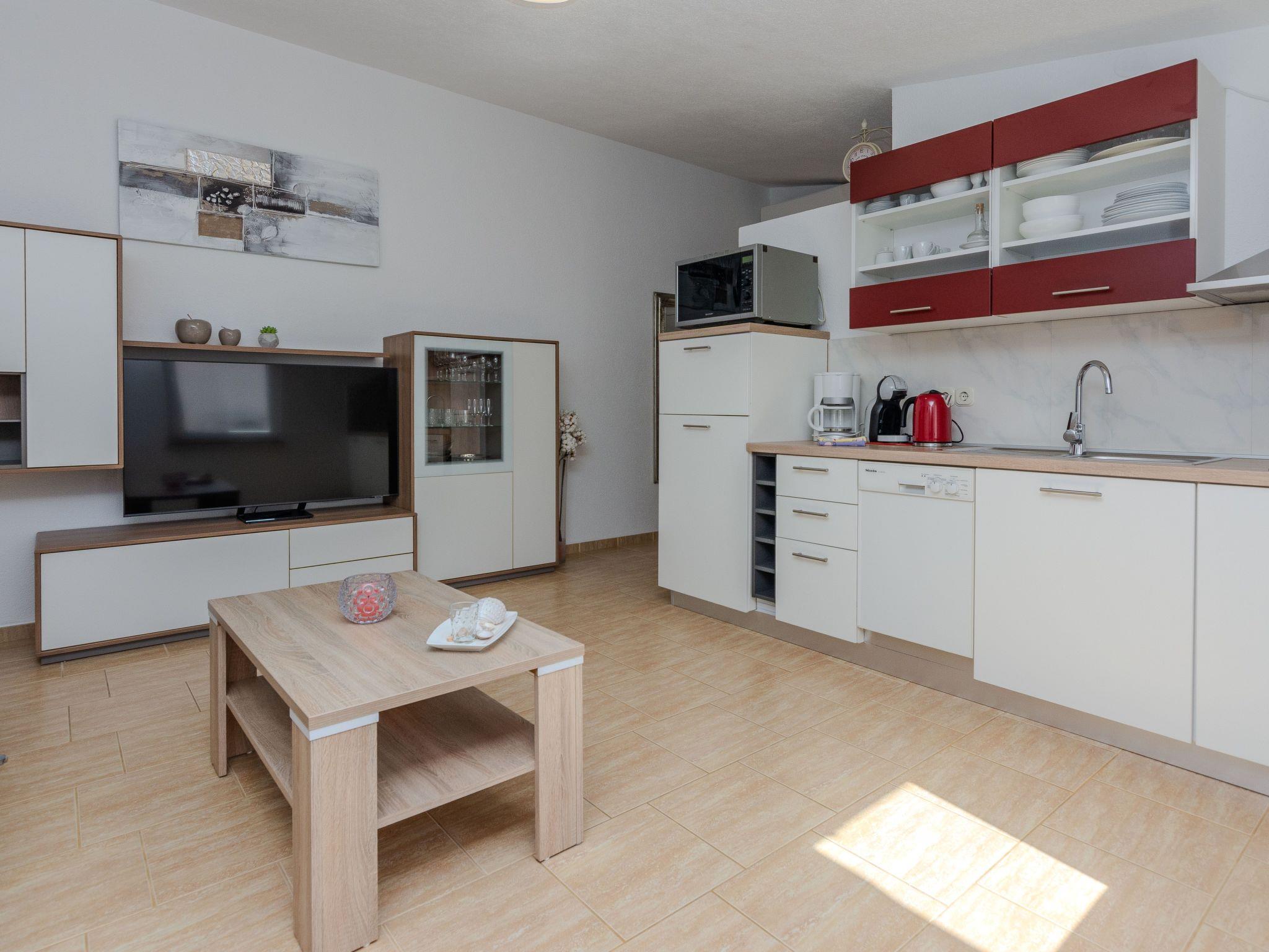 The flat itself is an inviting oasis of peace. The comfortable sleeping accommodation is divided into two bedrooms, each with a double bed, as well as an additional sofa bed in the living area for one person. Further features include partial air conditioning, which ensures pleasant temperatures on hot days. Technical amenities such as satellite TV and wireless internet access complete the offer and ensure entertainment and comfort during your stay.