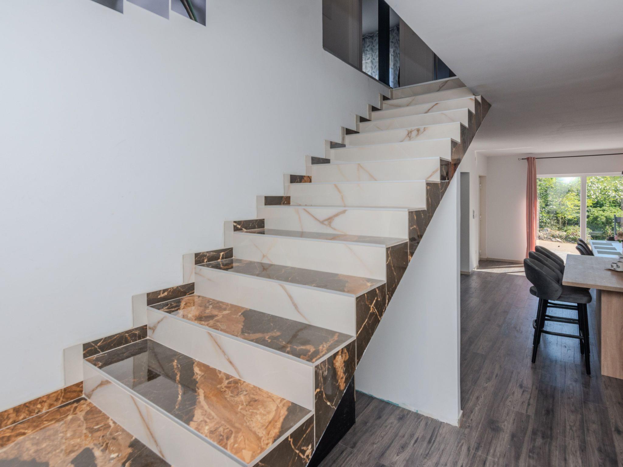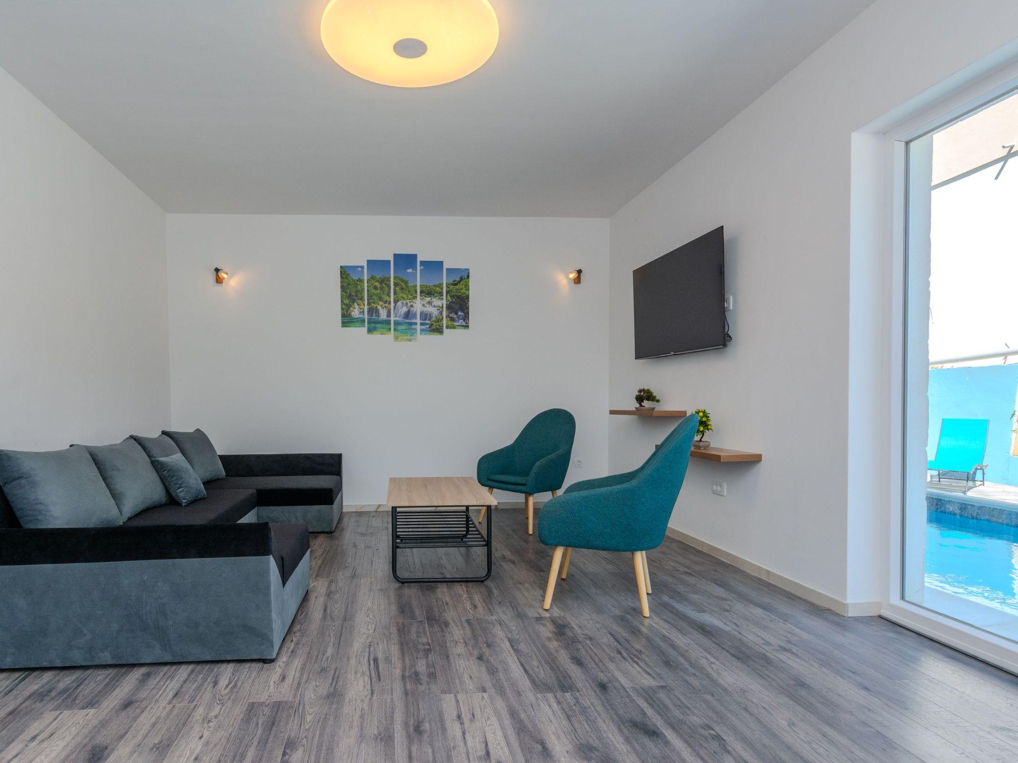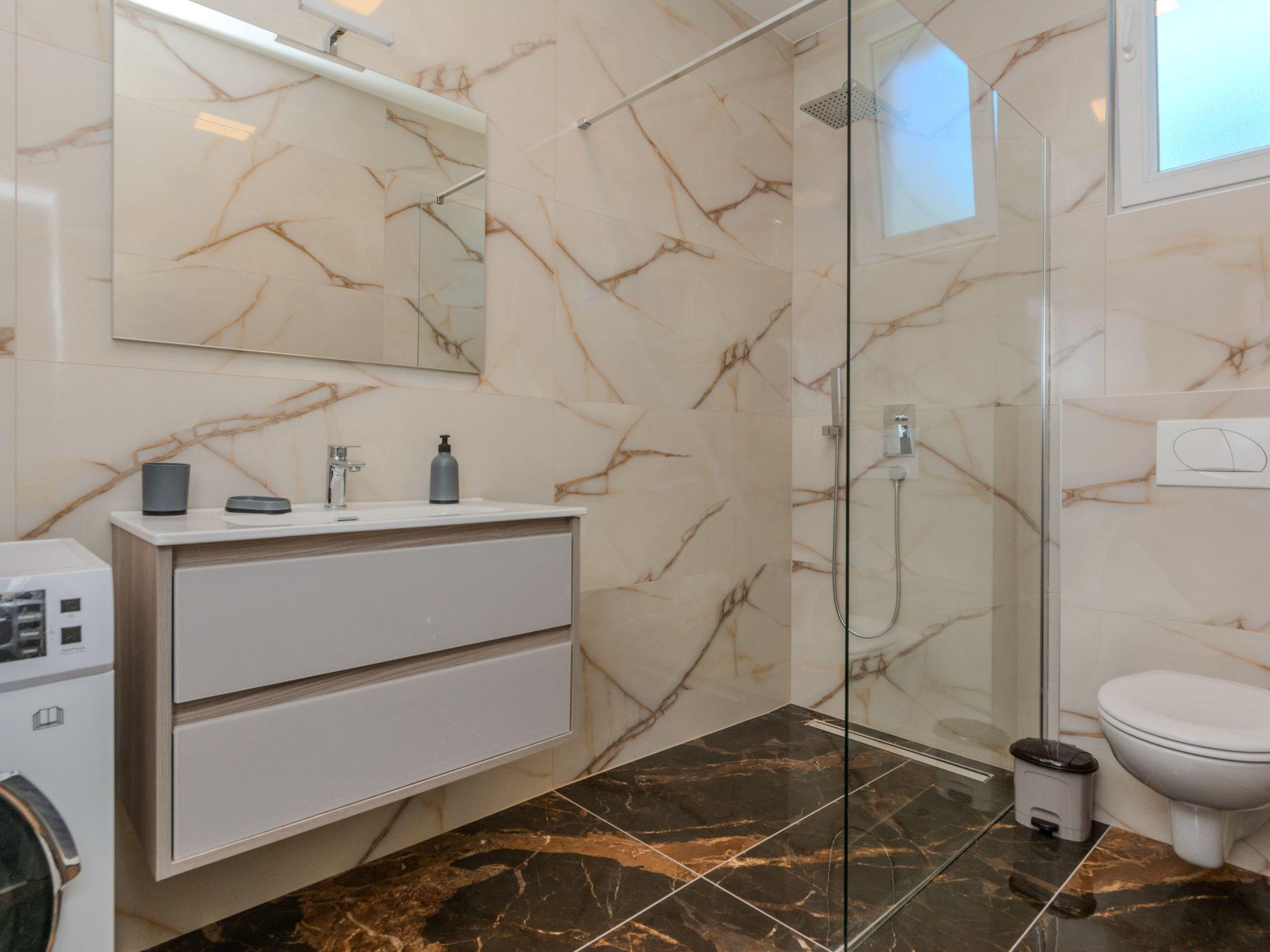 The villa is spread over two floors and is divided into a ground floor with a fully equipped kitchen, a dining room and a living room, an additional bathroom with a shower. Upstairs, the space is divided into four bedrooms, two with a double bed and their own bathrooms with a shower, two bedrooms with two single beds and an additional bathroom with a shower. All rooms are air-conditioned. To the villa belongs a roofed terrace (30 m²) equipped with table and chairs. The courtyard of the villa (300 m²) has a swimming pool and a relax area equipped with barbecue, outdoor shower, loungers and a parasol.