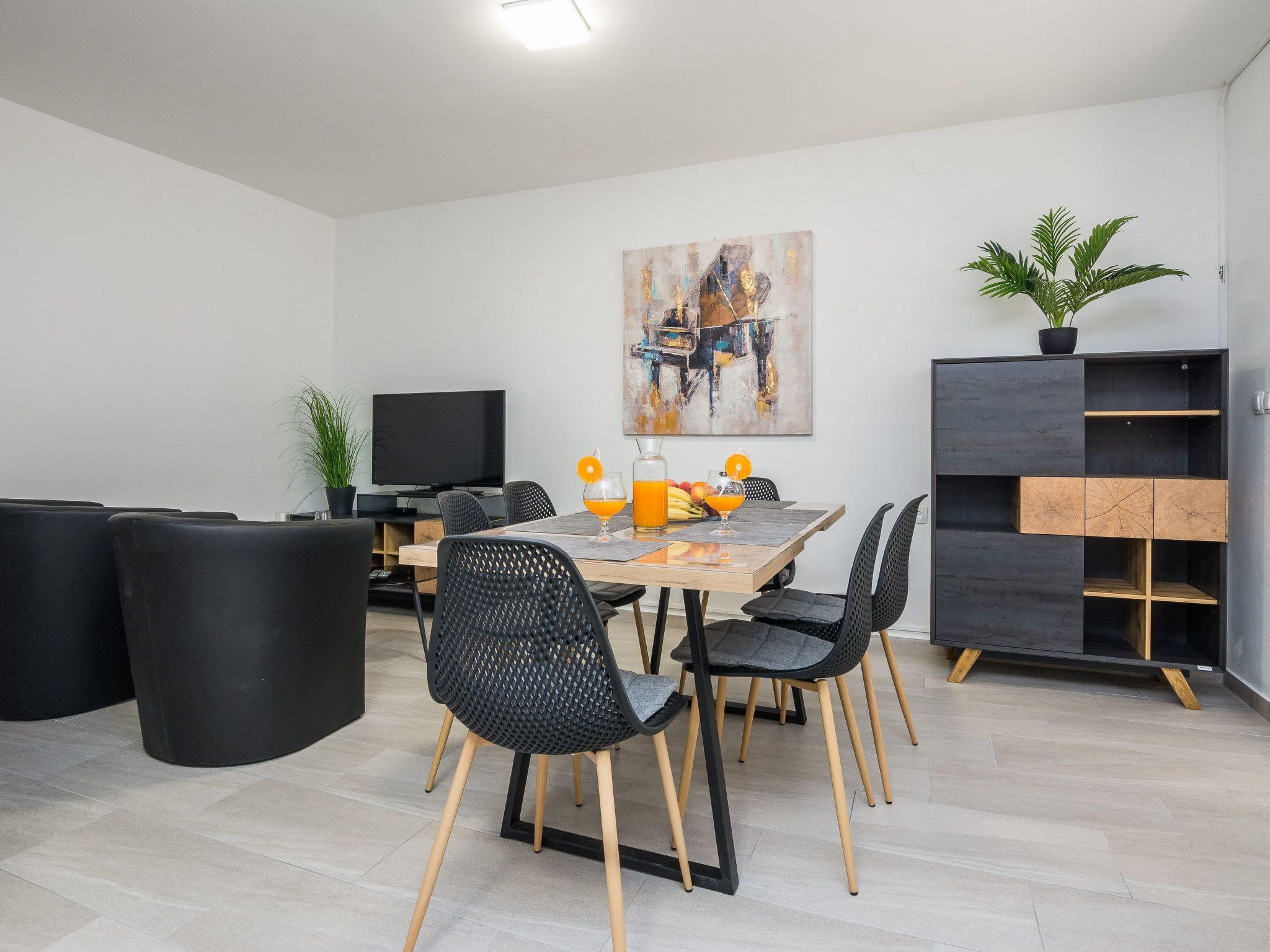 Apartment (70 m²) consists of a living room, fully equipped kitchen with a dining room, two bed-rooms with double beds, bedroom with two single beds, bedroom with a single bed for one person and two bathrooms with a shower. To the apartment belongs a 25 m² roofed terrace furnished with table, chairs and loungers.