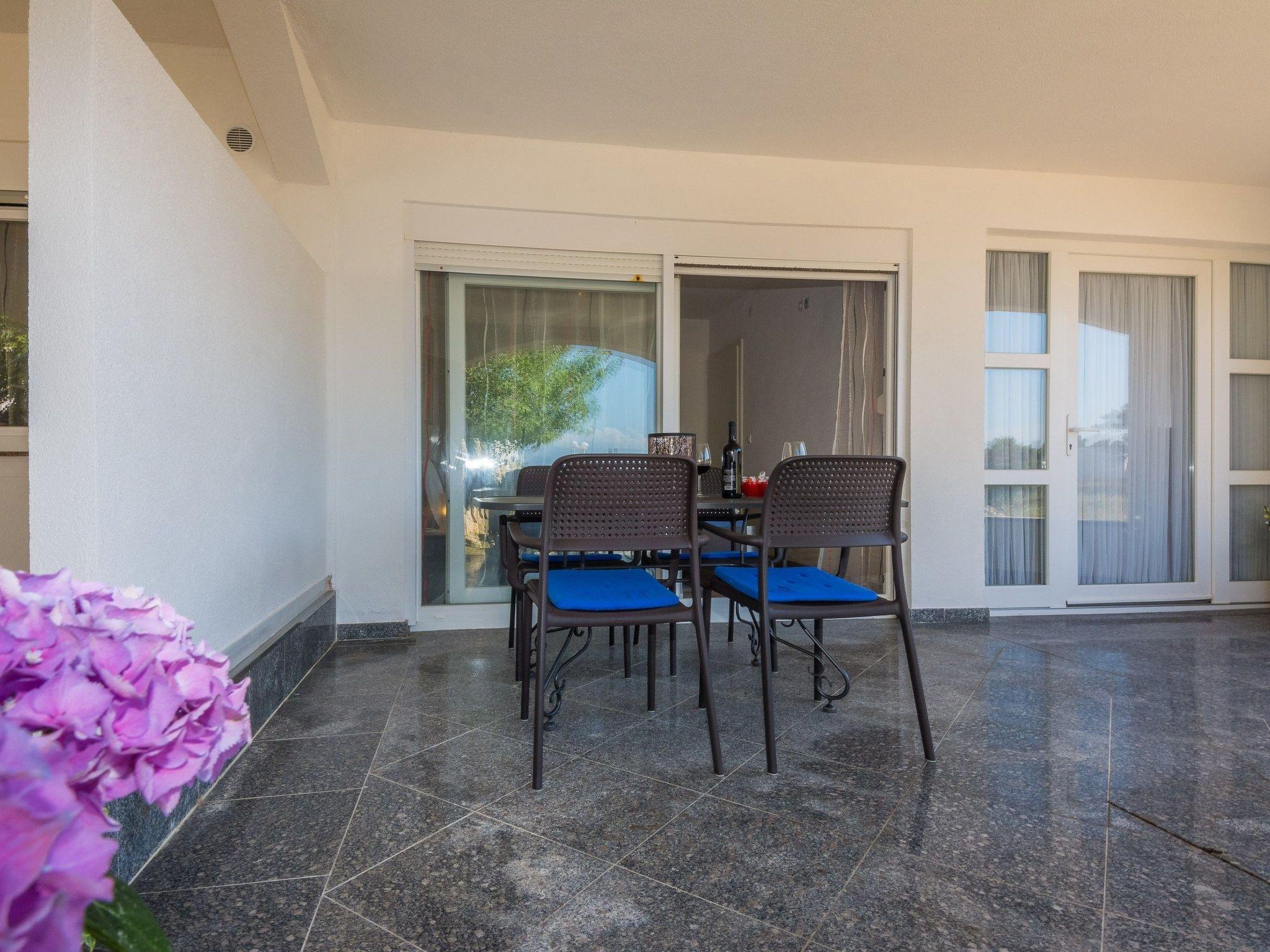 Apartment (60 m²) consists of a living room, equipped kitchen, bedroom with a double bed, bed-room with two single beds and bathroom with a shower. To the apartment belongs a 28 m² roofed terrace with a sea view, furnished with table, chairs and loungers.
