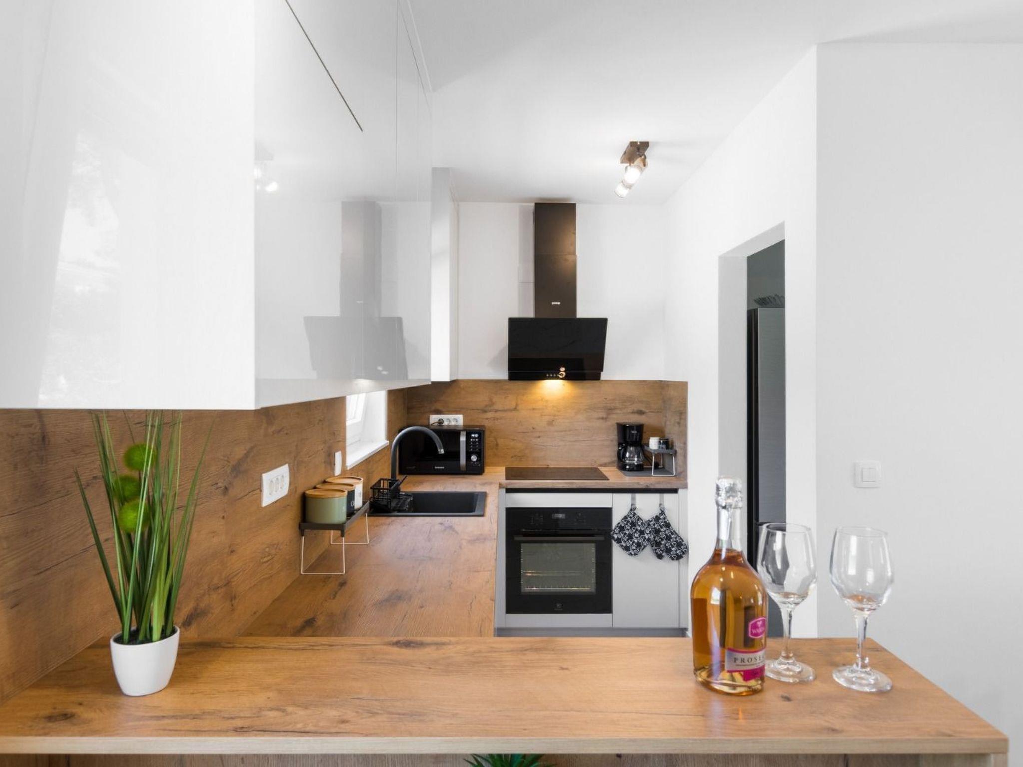 The outdoor area of the house offers a private swimming pool, sun loungers, a covered terrace for enjoying the shade and an outdoor grill (komin) for preparing meals in the open air. The property is fenced and carefully landscaped, providing a sense of privacy and security. Free parking spaces and fast Wi-Fi are also available for guests.