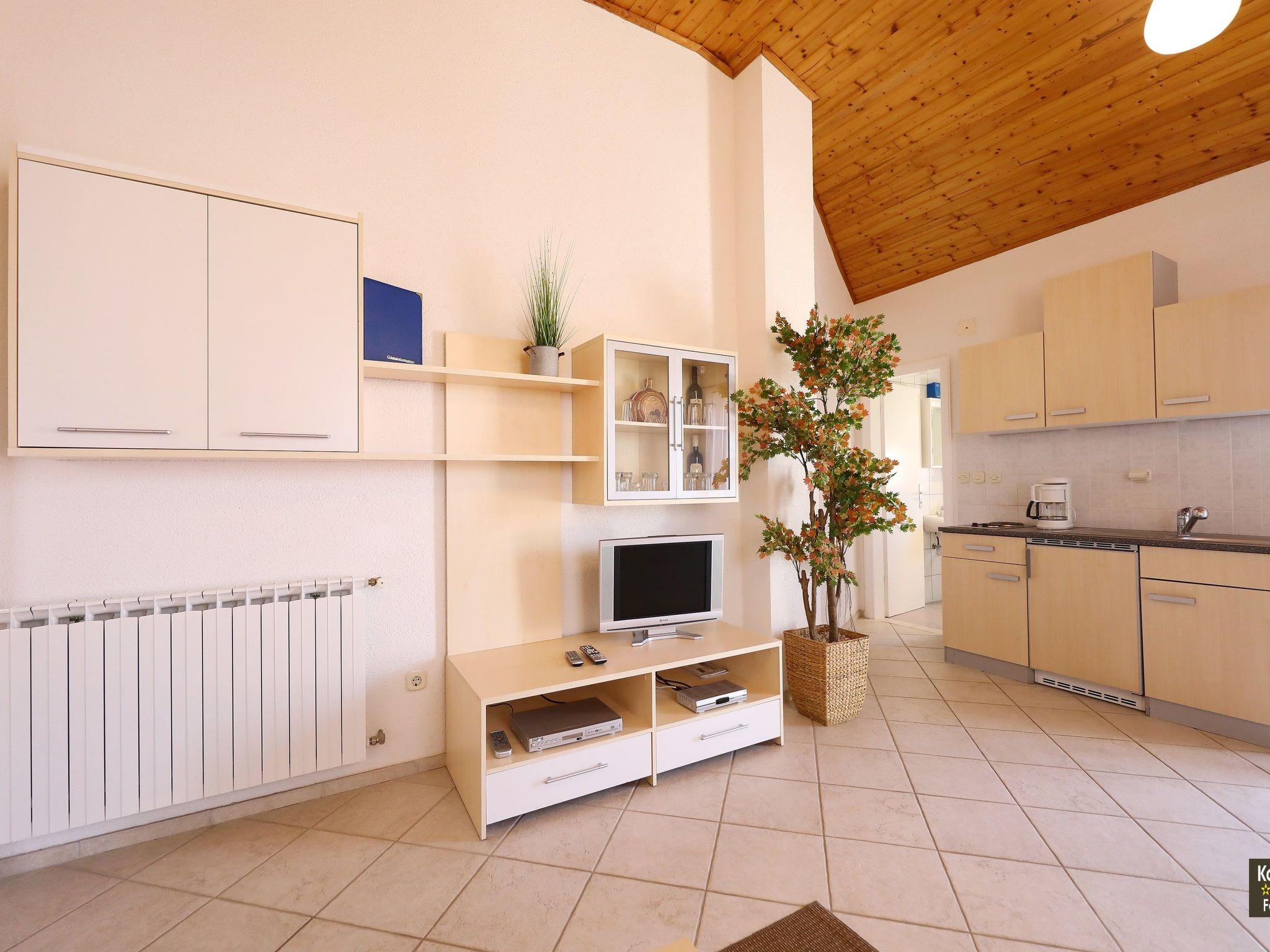 The holiday flat on the first floor has been classified with three stars. A bright bedroom with a double bed awaits you on approx. 44m². You will find plenty of storage space for your wardrobe in the built-in wardrobe. The open-plan kitchenette is located in the combined living, dining and cooking area. This gives you the opportunity to cook for yourself and store the food you have bought. Breakfast can get off to a good start thanks to the coffee machine and toaster. The dining table not only invites you to dine but also to socialise. In the adjoining living area, you can relax on the sofa with satellite TV after an eventful day. The sofa can also be used as a bed (160x200cm) for two people. When it gets very hot in summer, the air conditioning in this room cools the entire flat. The bathroom has a washbasin, WC, shower and hairdryer. All rooms are equipped with heating in case it gets chilly.