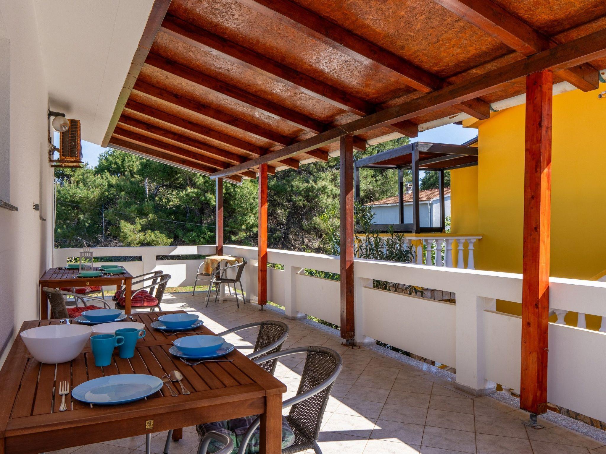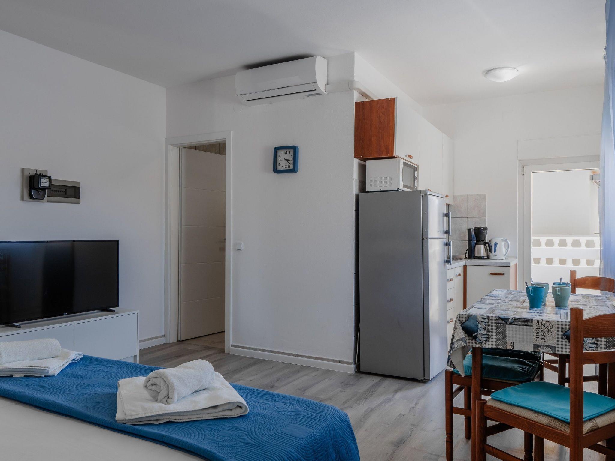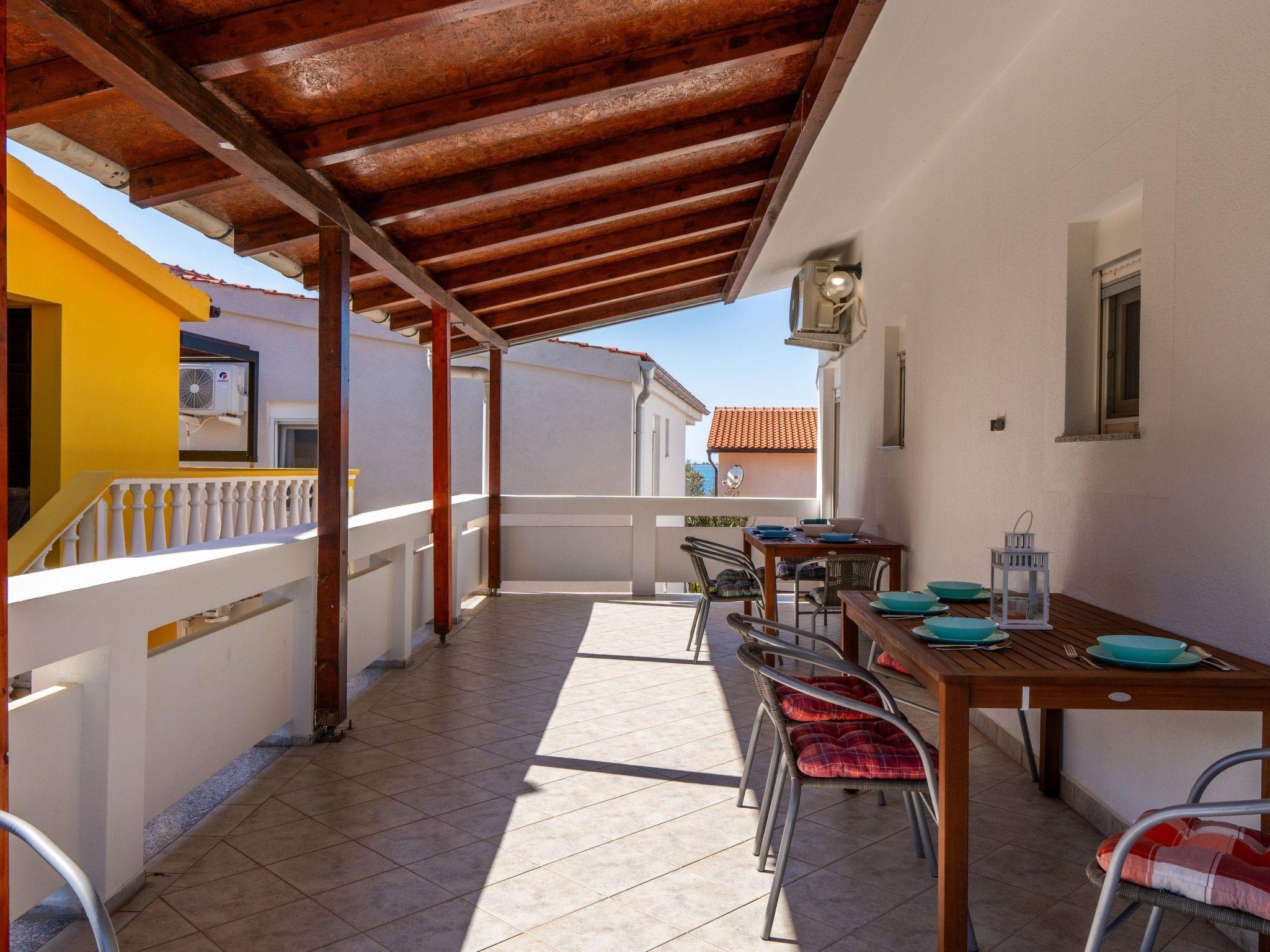The exterior of the apartment compliments its inviting interior, boasting a spacious 10 m² balcony shared among guests, ideal for relaxing and soaking in the pleasant Dalmatian atmosphere. The common garden offers a serene spot for outdoor leisure, and the inclusion of a barbecue in the courtyard encourages delightful evenings of dining al fresco.