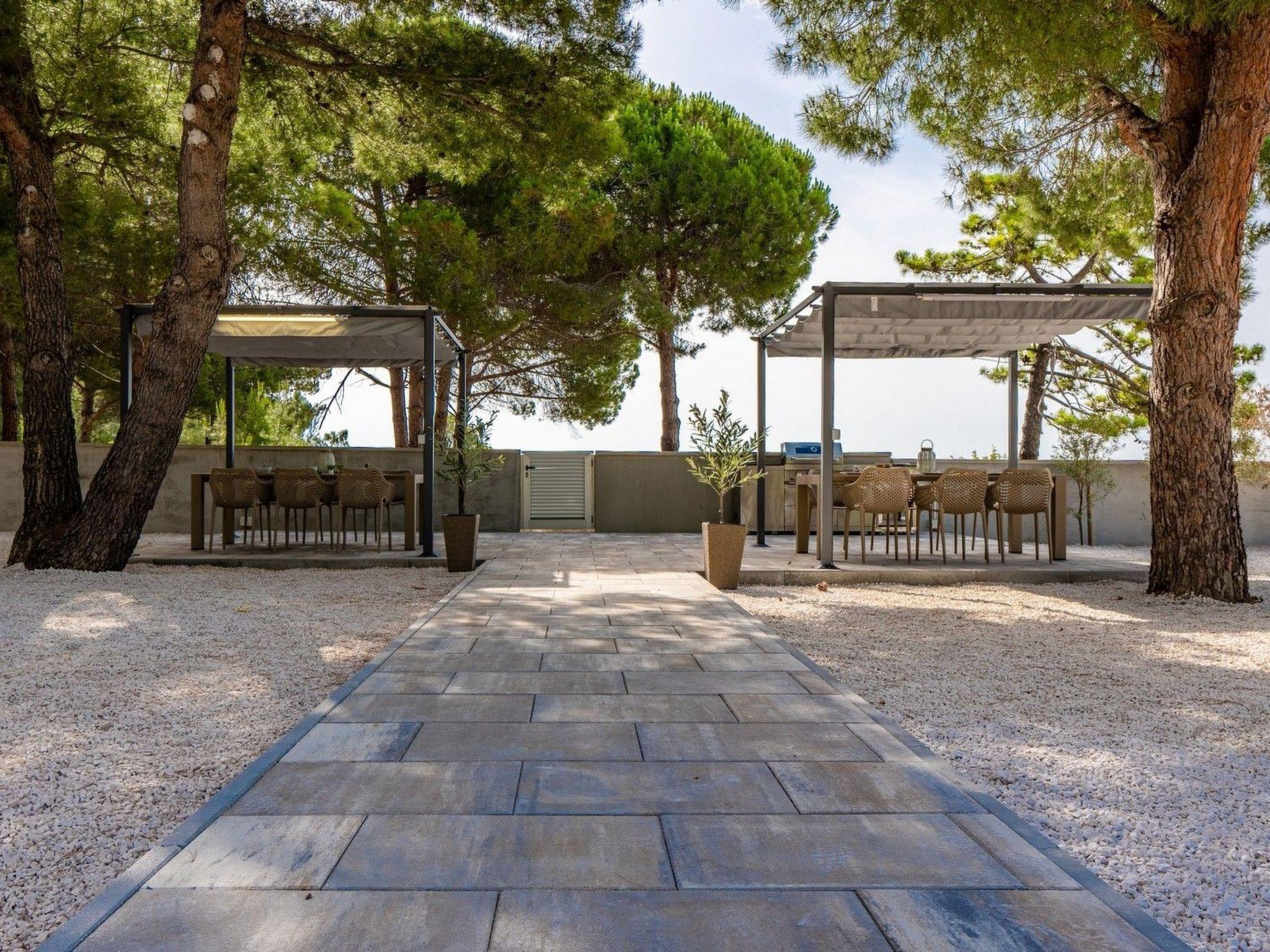 The communal garden area of the apartment complex further extends the space for enjoyment and relaxation outdoors. Just 20 meters away from Šepunatka beach, the gated exterior includes a generously sized and furnished area complete with an outdoor kitchen, various seating spaces, and a dedicated children's playground. This setup ensures fun and relaxation for all ages in a secure and welcoming environment.