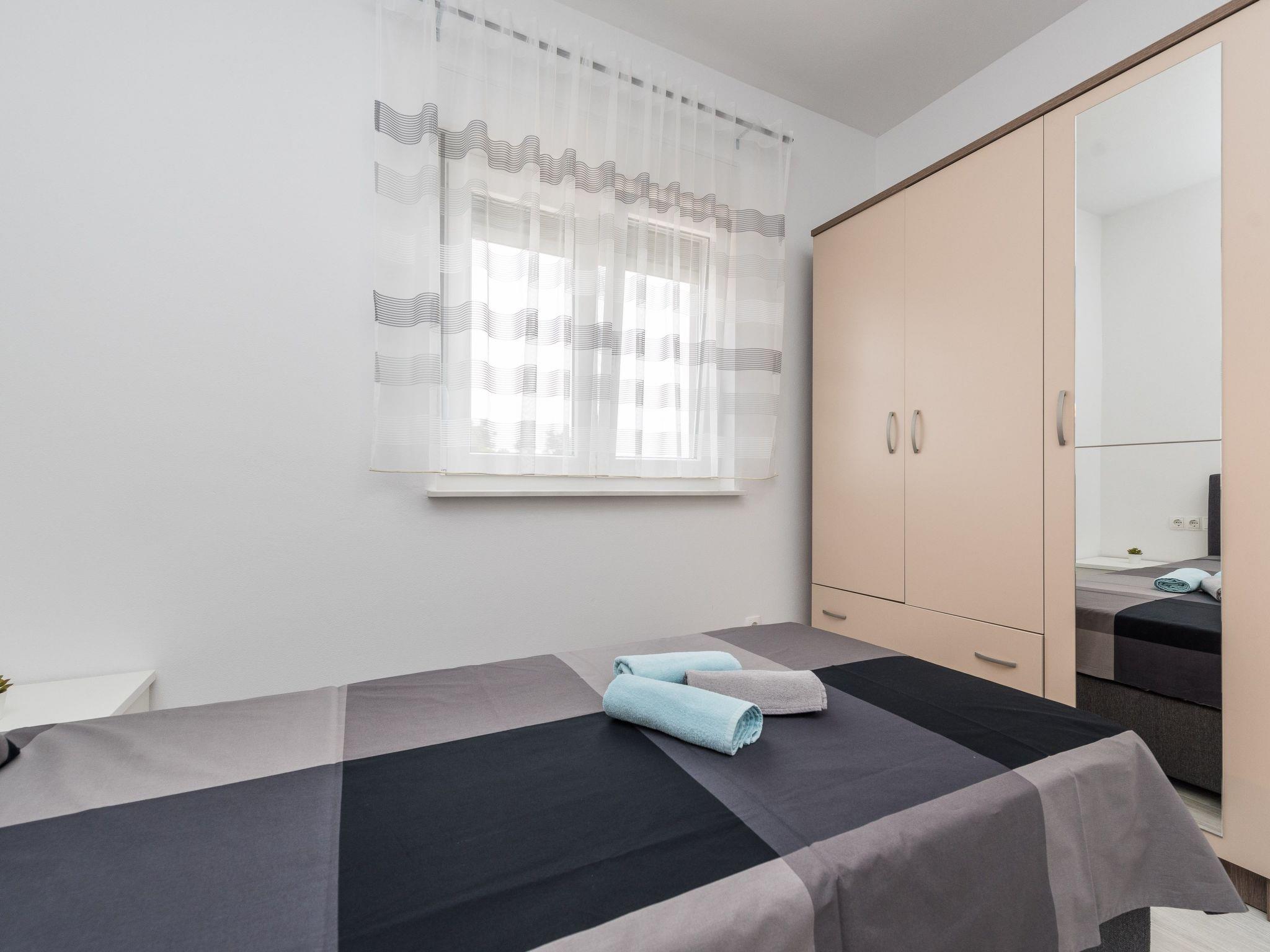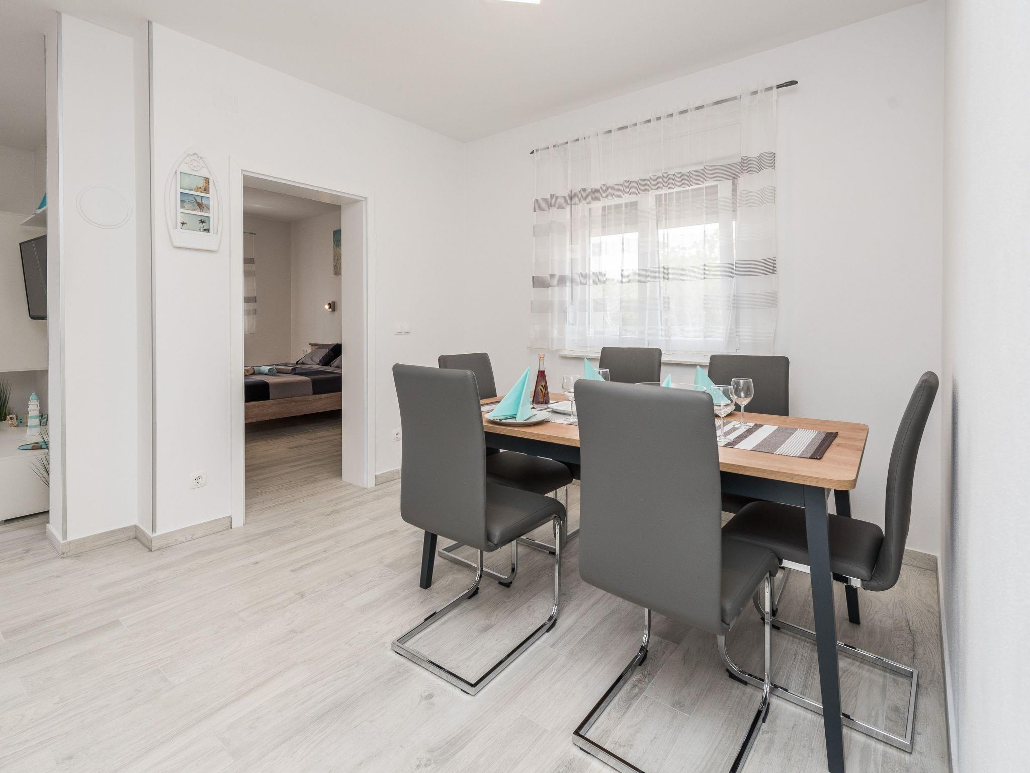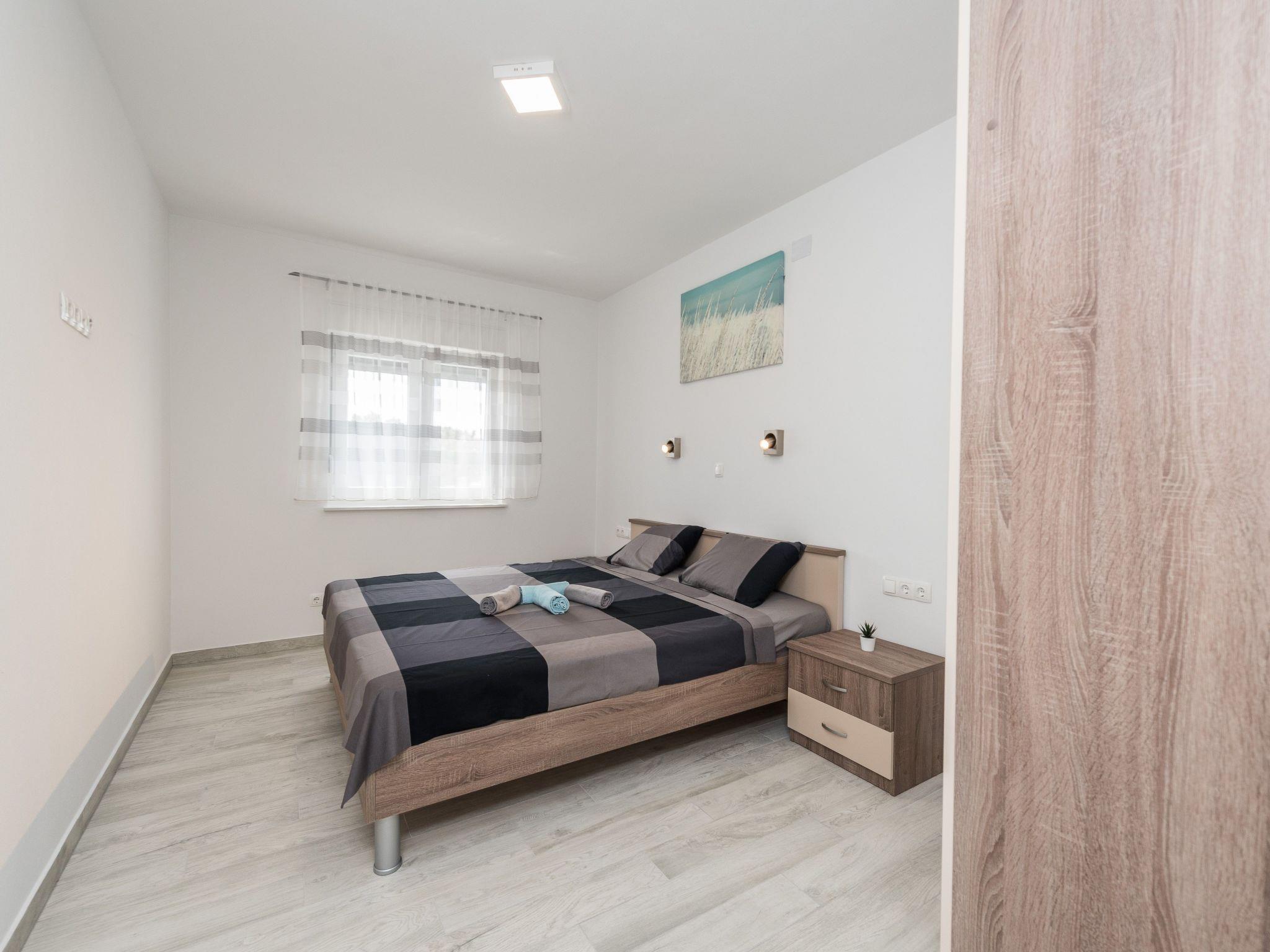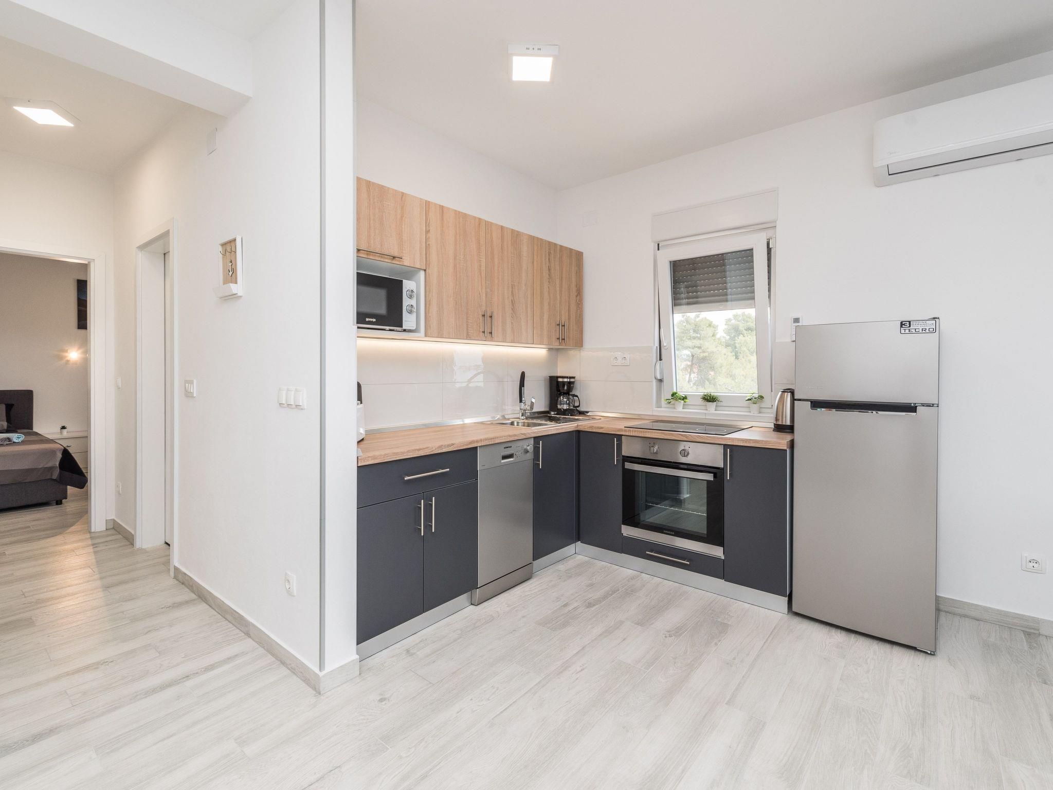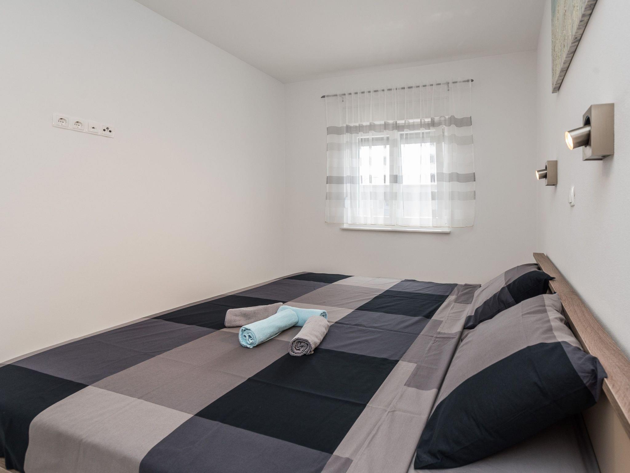 This modern apartment located in a quiet area called Radovanjica, just 150m from a pebble beach, can accommodate up to 6 persons. The 62m2 apartment on the 2nd floor of the house is divided into two bedrooms (one with a double bed and one with two single beds), a bathroom with shower and a living and dining room with kitchen. In the living room there is a sofa bed for two more persons. A well-equipped kitchen with dishwasher and oven, air conditioning, satellite TV, wireless Internet access, washing machine, baby cot and highchair are among the other features. Living room opens onto an 8 m² roofed and furnished balcony with partial sea view. Barbecue and parking in the courtyard (200 m²) available. Restaurants, shops, and the center of the island can be reached within a few minutes' walk.
