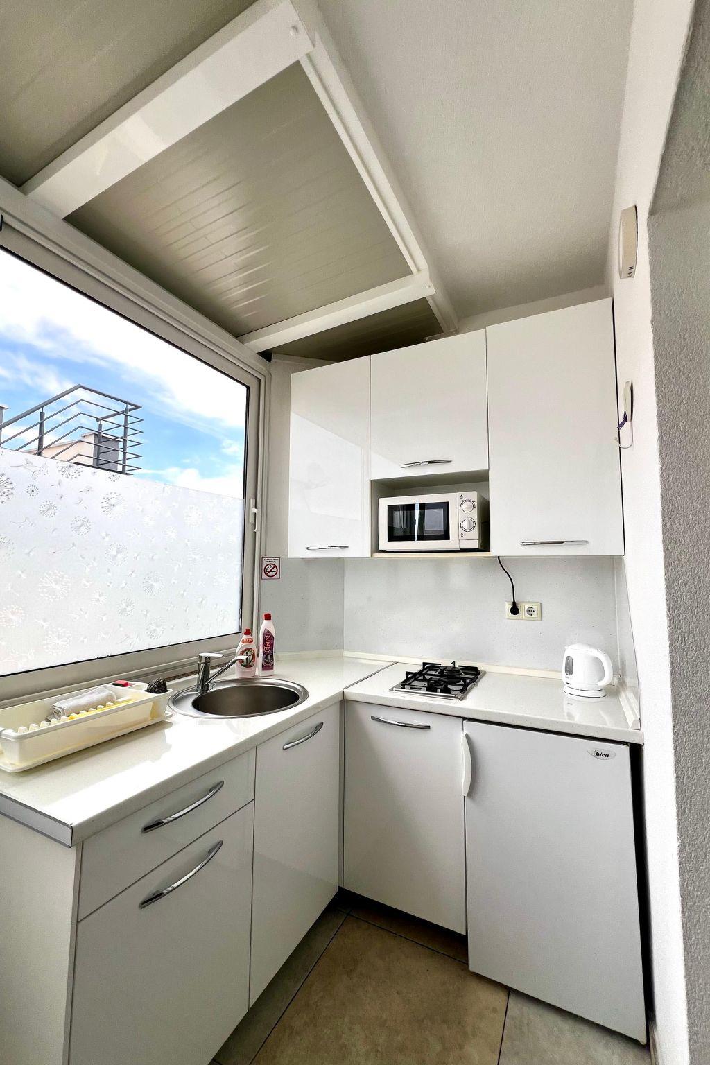 The flat (30 m²) is divided into a dining area with kitchen and a double bed and bathroom with shower. In the courtyard of the house (700 m²) there is an outdoor shower and a gazebo with table, chairs and barbecue.