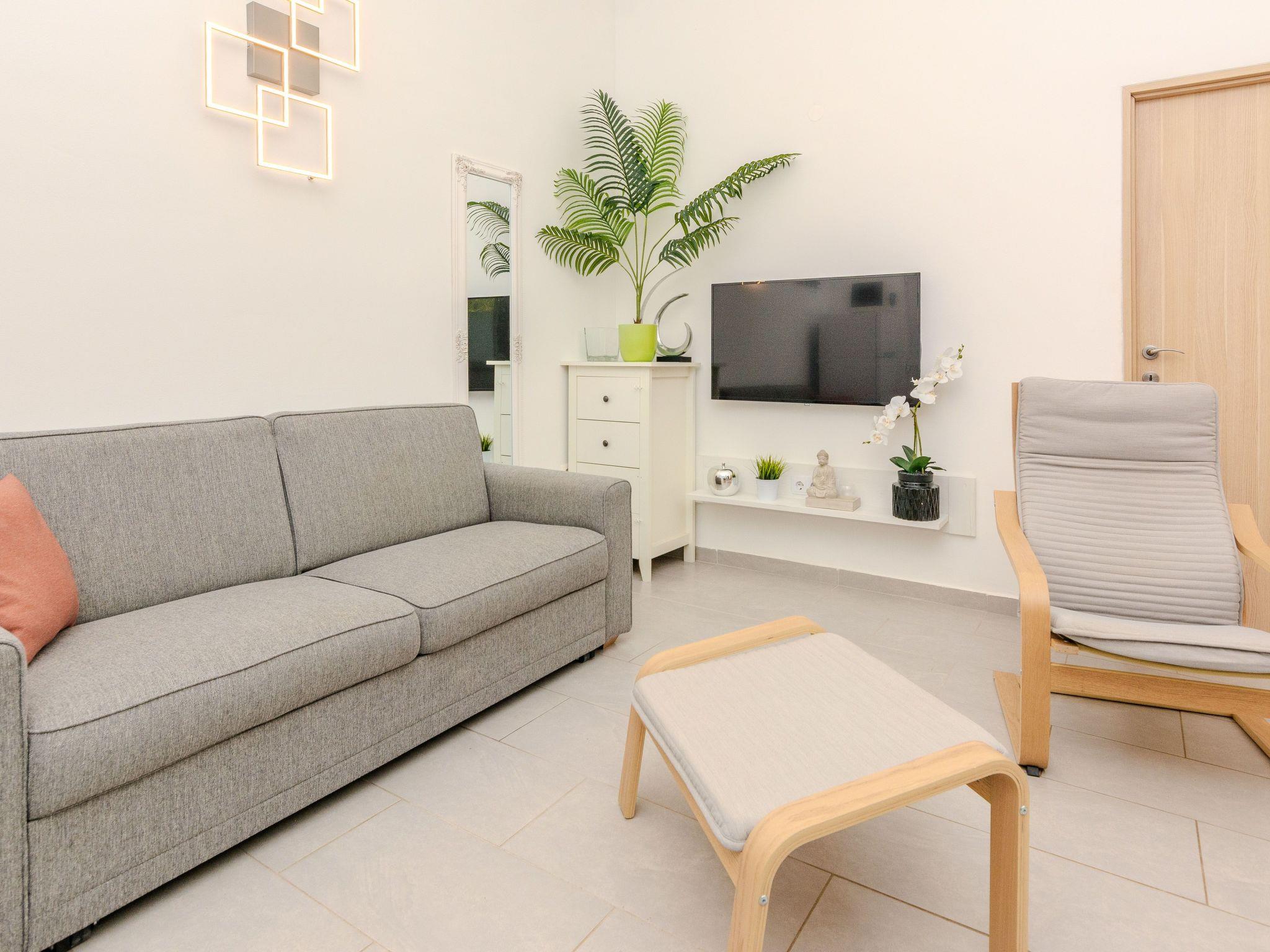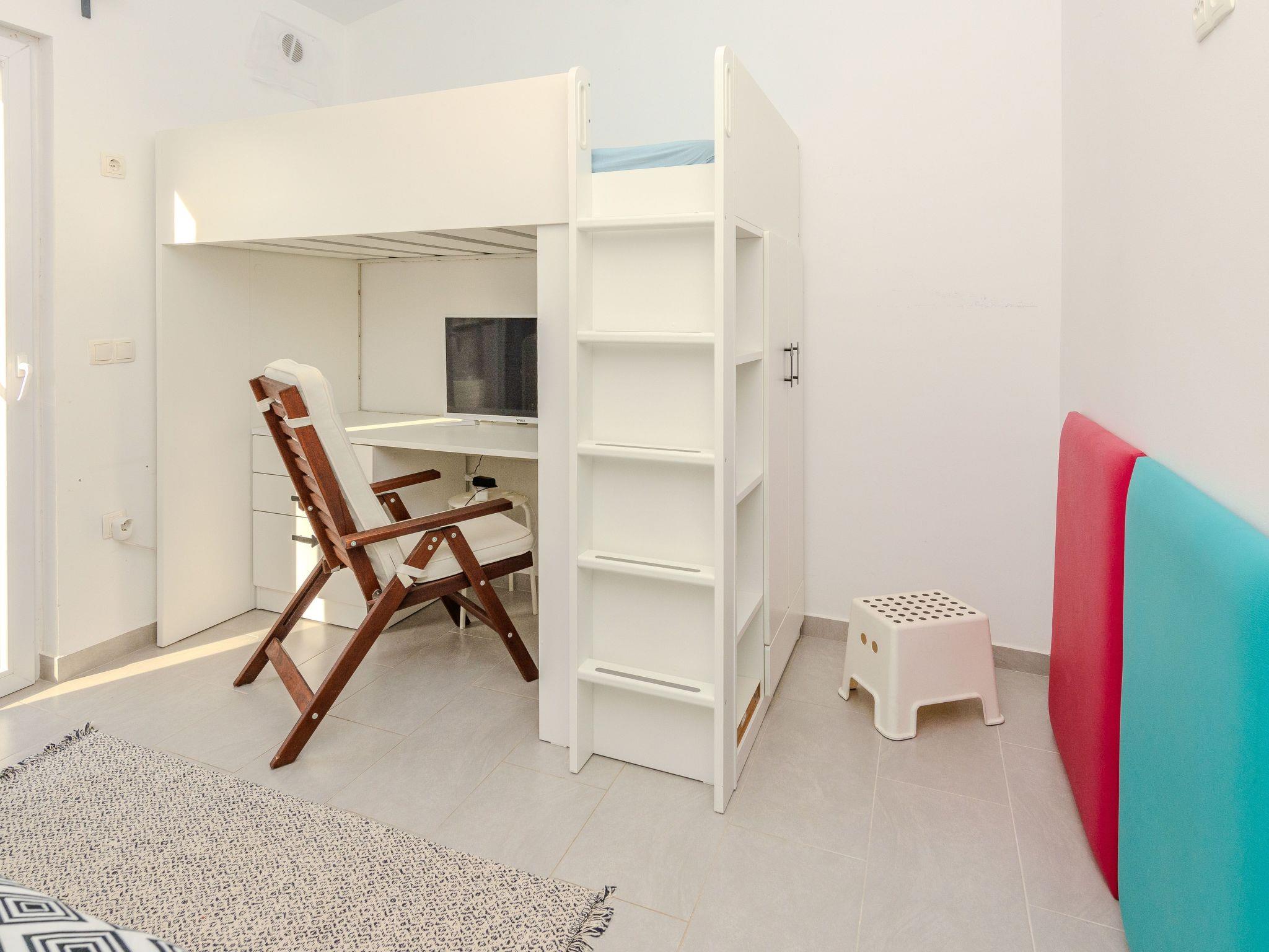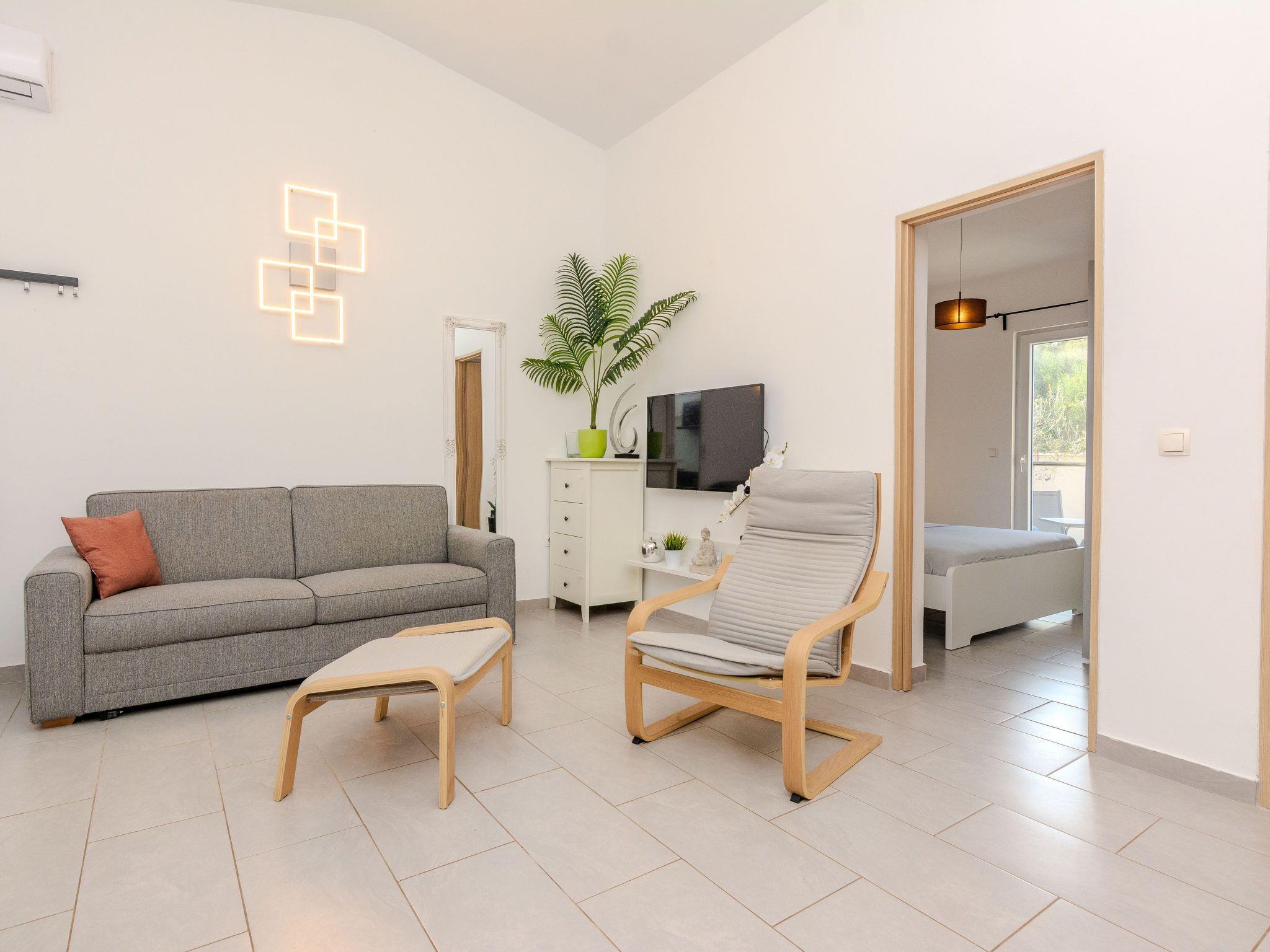 The 60 m² living space extends over the ground floor and is divided into a living room, fully equipped kitchen with dining area, one bedroom with double bed and one with two single beds and a bathroom with shower. The room with two single beds has a desk with a TV monitor and an X-Box games console. There is a sofa bed for one person in the living room. The property has a covered terrace with an area of 25 m², which is furnished with an outdoor sofa, table and chairs. The property also has a 300 m² patio with a private pool, barbecue, parasol, sun loungers and an outdoor shower.