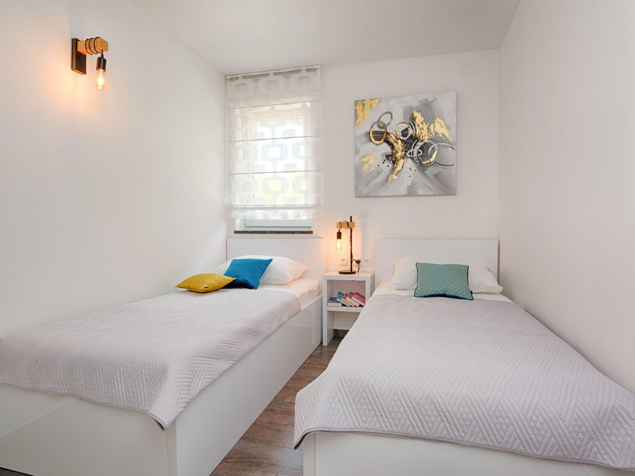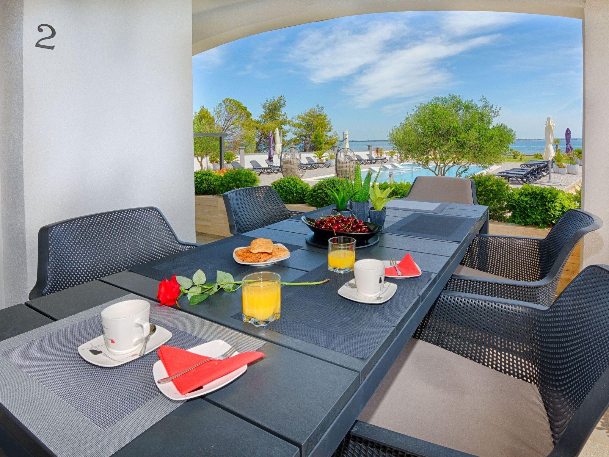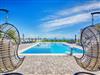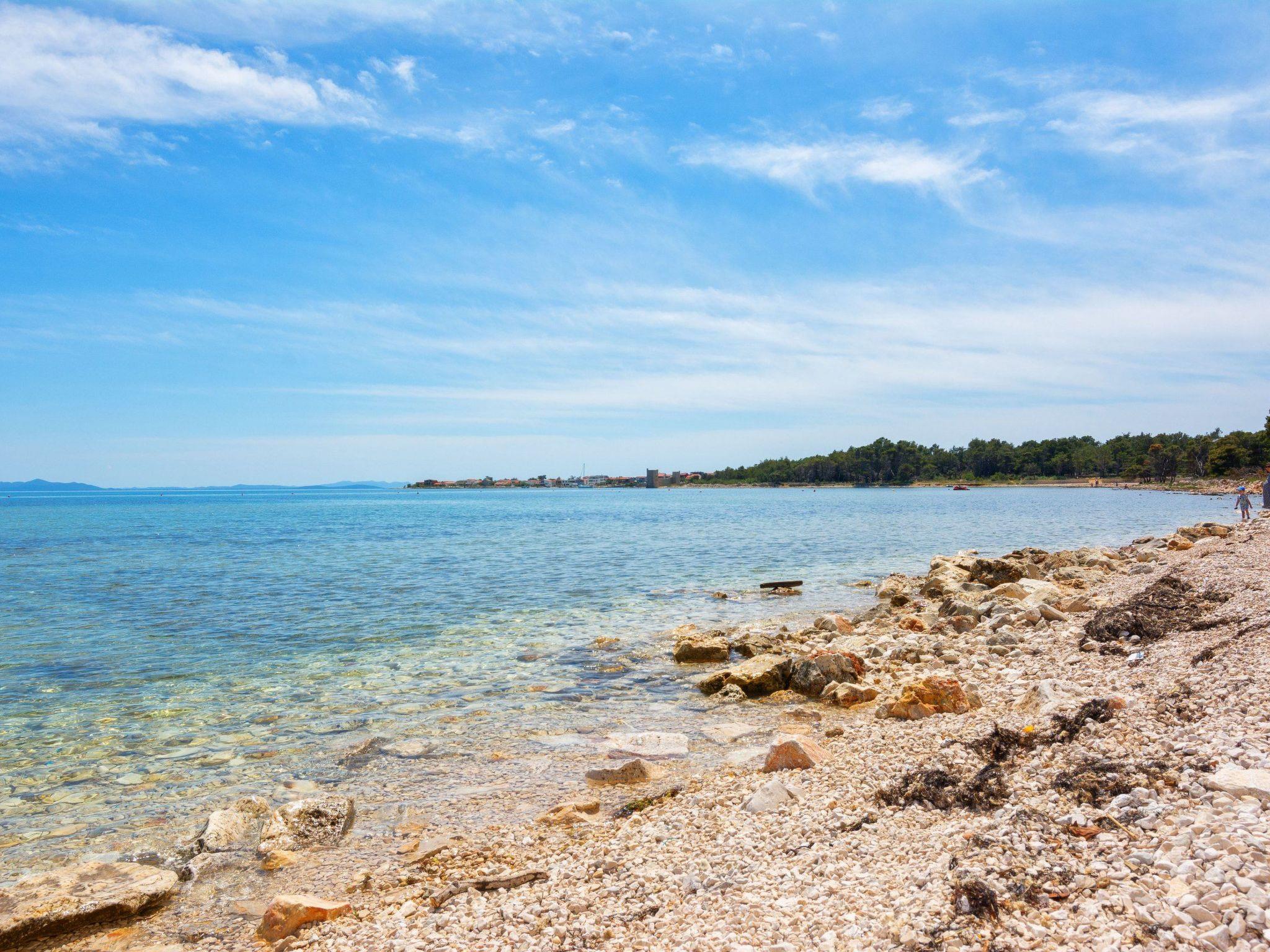 At the property there is a swimming pool of 87m² (13,5m long, 6,5m wide and 1,4m deep) with loungers and a relax area with spacious lounge seating furniture under a parasol. The 55m² apartment is located on the ground floor of the house and is divided into a kitchen, dining and living area, two bedrooms with double bed and a bathroom with shower cabin. In the living room there is a sofa bed for two more persons. 25m² furnished and roofed terrace with a sea view belongs to the apartment. Air conditioning, satellite TV, Wi-Fi internet and grill pavilion in the courtyard with outdoor kitchen with oven and outdoor dining area are among the other features. Restaurants and shopping opportunities can be found at a distance of a few minutes’ walk. The beach Jadro, the most popular beach on the island of Vir where You can find all kinds of entertainment during Your summer vacation is just 200m distanced.