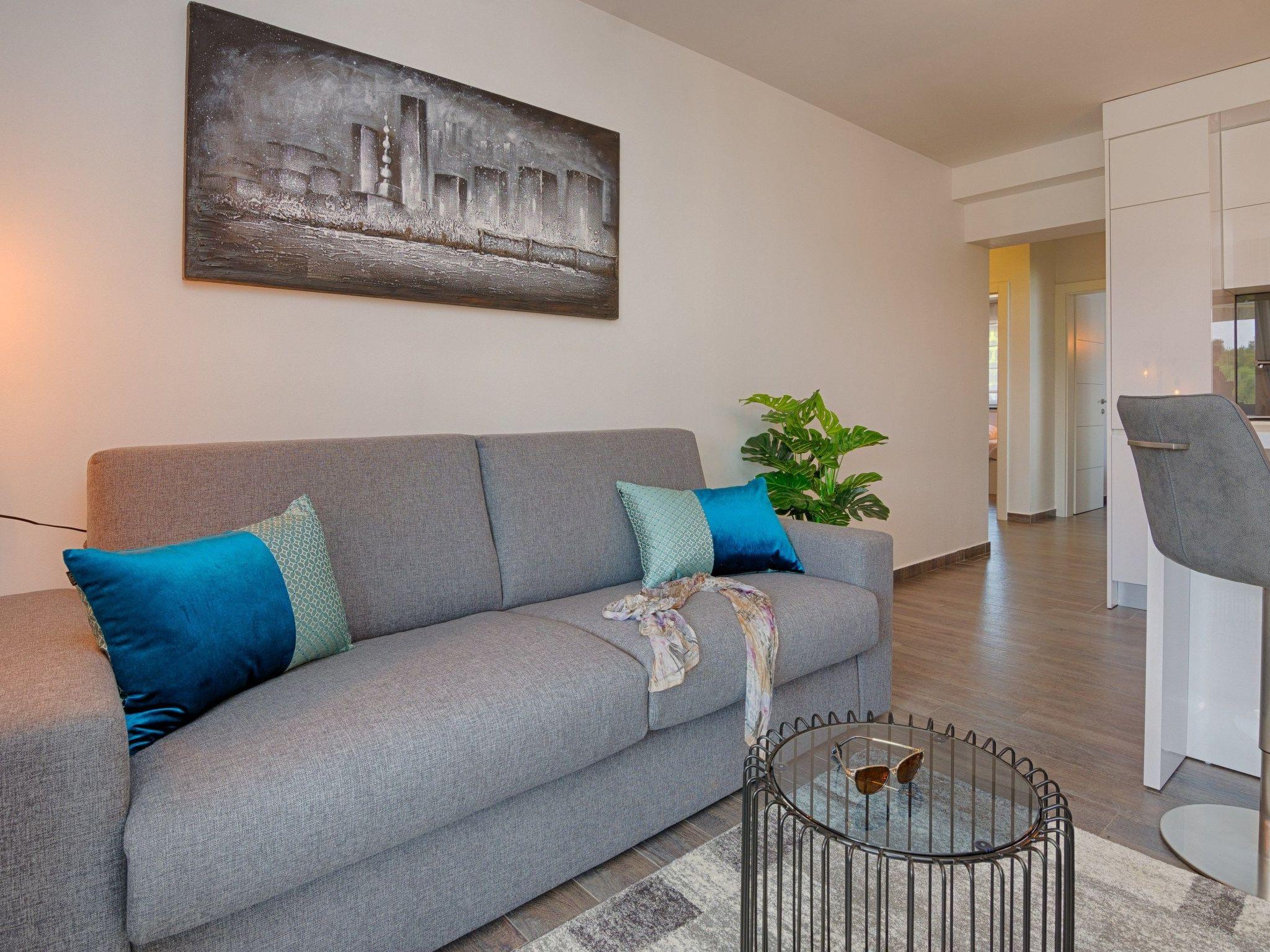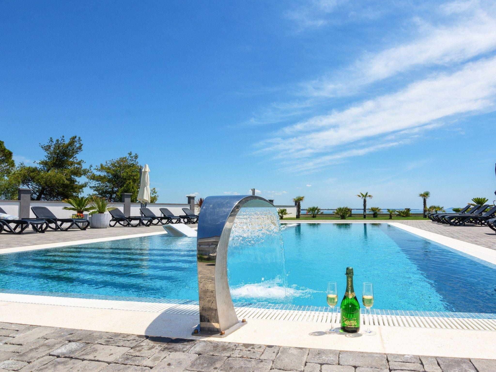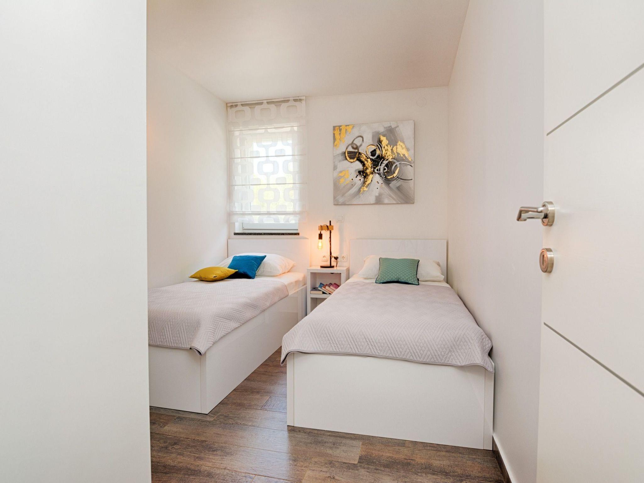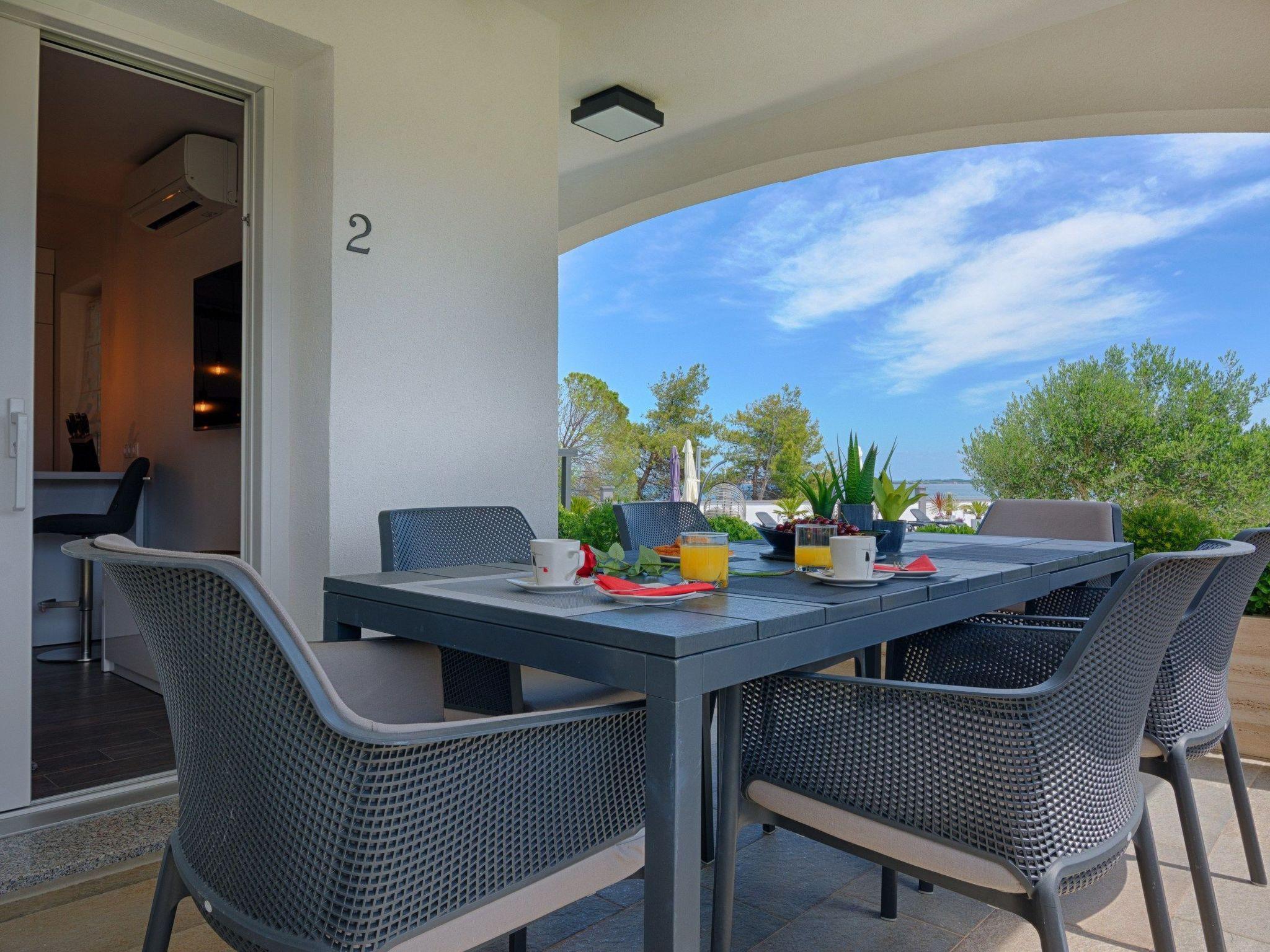 At the property there is a swimming pool of 87m² (13,5m long, 6,5m wide and 1,4m deep) with loungers and a relax area with spacious lounge seating furniture under a parasol. The 55m² apartment is located on the ground floor of the house and is divided into a kitchen, dining and living area, two bedrooms with double bed and a bathroom with shower cabin. In the living room there is a sofa bed for two more persons. 25m² furnished and roofed terrace with a sea view belongs to the apartment. Air conditioning, satellite TV, Wi-Fi internet and grill pavilion in the courtyard with outdoor kitchen with oven and outdoor dining area are among the other features. Restaurants and shopping opportunities can be found at a distance of a few minutes’ walk. The beach Jadro, the most popular beach on the island of Vir where You can find all kinds of entertainment during Your summer vacation is just 200m distanced.