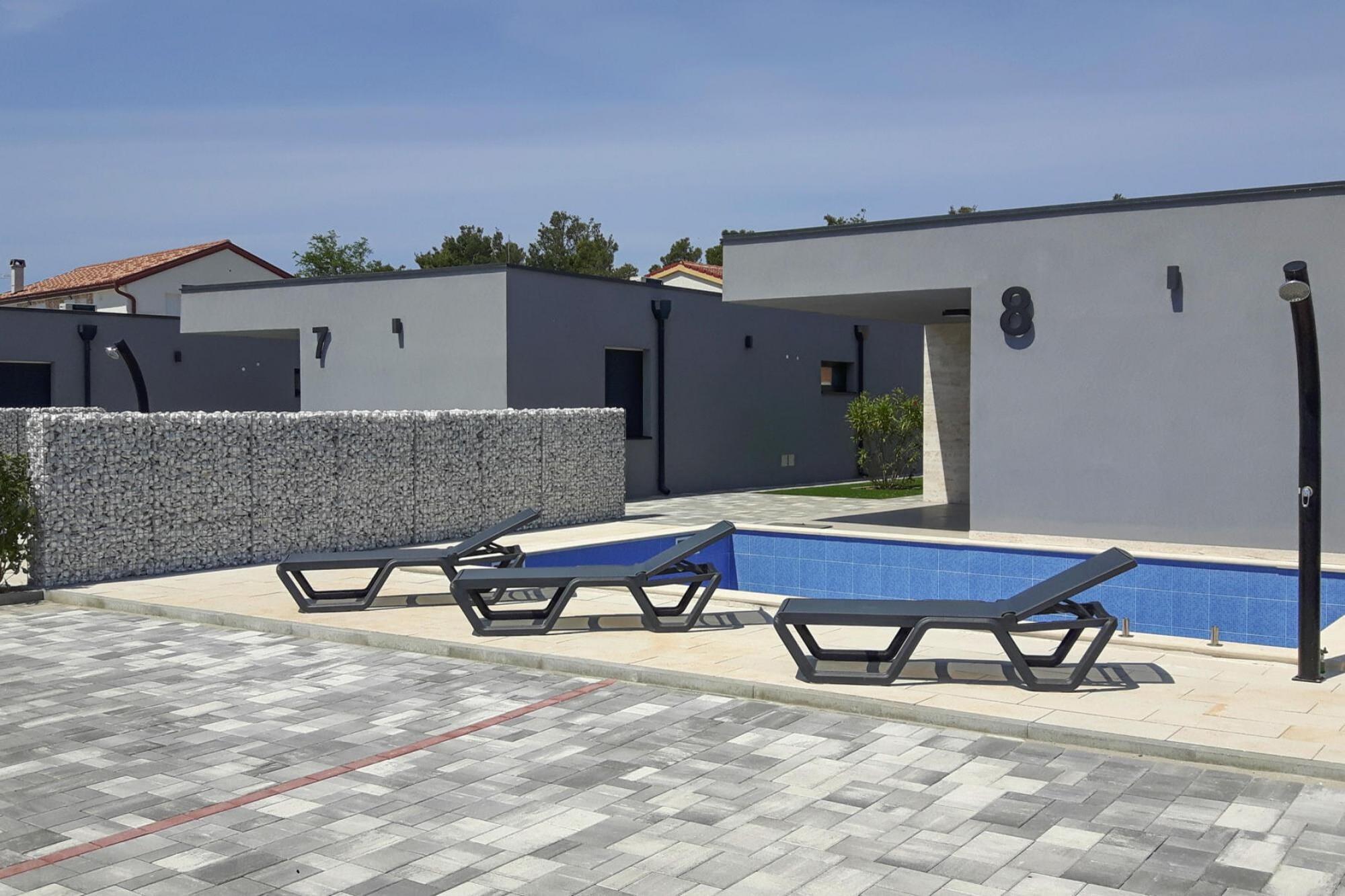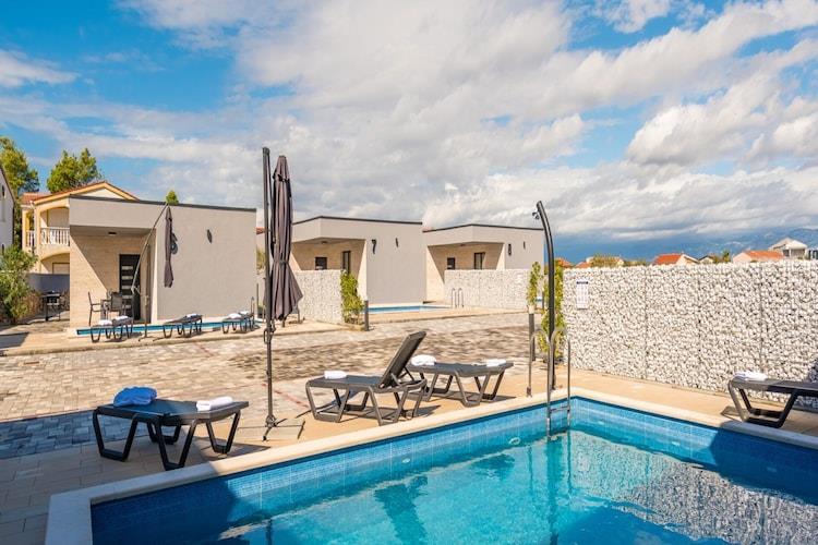Det nybyggede lille villakompleks ligger nær centrum og stenstranden Jadro i hovedstaden Vir på øen Vir. I alt otte moderne villaer, hver med sin egen private pool, sikrer et afslappende ophold. I receptionsbygningen er der også et fitnesscenter, automatisk massagesofa, sauna og spabad til rådighed gratis. En sports- og legeplads for børn, som f.eks. samt basketball, fodbold - er og badmintonbaner også inkluderet i prisen - der er ingen kedsomhed Stor betydning blev placeret på sikkerhed og privatlivets fred under opførelsen af anlægget, og hele området af 4.400 kvadratmeter er omgivet af mure i!. hver villa har cirka 350 kvadratmeter til rådighed -. med privatlivets fred skærme fra naboerne med i alt 8 villaer, komplekset er også meget velegnet til grupper (gruppe rabat på anmodning). Udlejeren driver også en populær restaurant kun 1,5 kilometer væk. Der er også mulighed for morgenmad (ca. EURO10 p.p.) og halvpension (ca. EURO24 p.p.). Derudover får du som gæst i villaerne 15 % rabat på alle a la carte måltider i Ibiza restaurant og du kan nyde havudsigten med et lækkert måltid på terrassen.Øen Vir ligger i det nordvestlige del af Dalmatien. er en af omkring 300 øer i Zadar archipelago.The værd at se metropol er omkring 30 kilometer away.Your feriebolig er beliggende i øens hovedstad, der tilbyder en bred vifte af gastronomiske muligheder, varierede sports- og fritidsaktiviteter og selvfølgelig smukke strande Du kan nemt nå Vir i bil, som øen er forbundet med fastlandet med en bro. Aktiviteter i nærheden: Området er ideelt til mountainbiketure, lange gåture eller bådture til øerne Zadar og Pag. Metropolen Zadar kan også nås inden for kort tid. Den gamle bydel ligger på en halvø og scorer med point